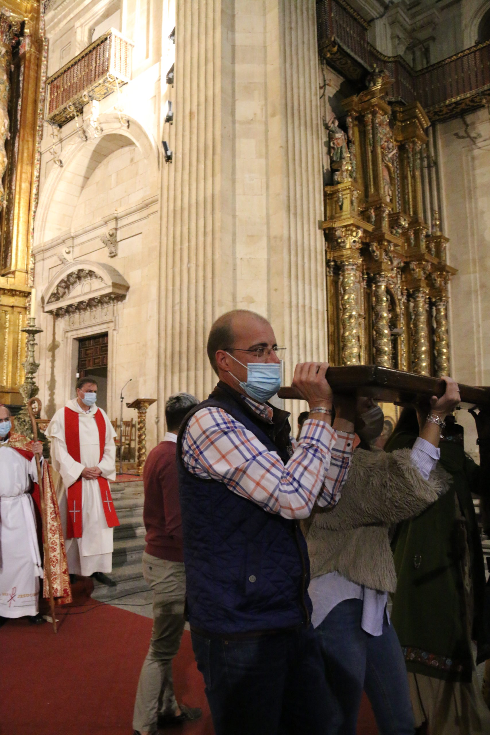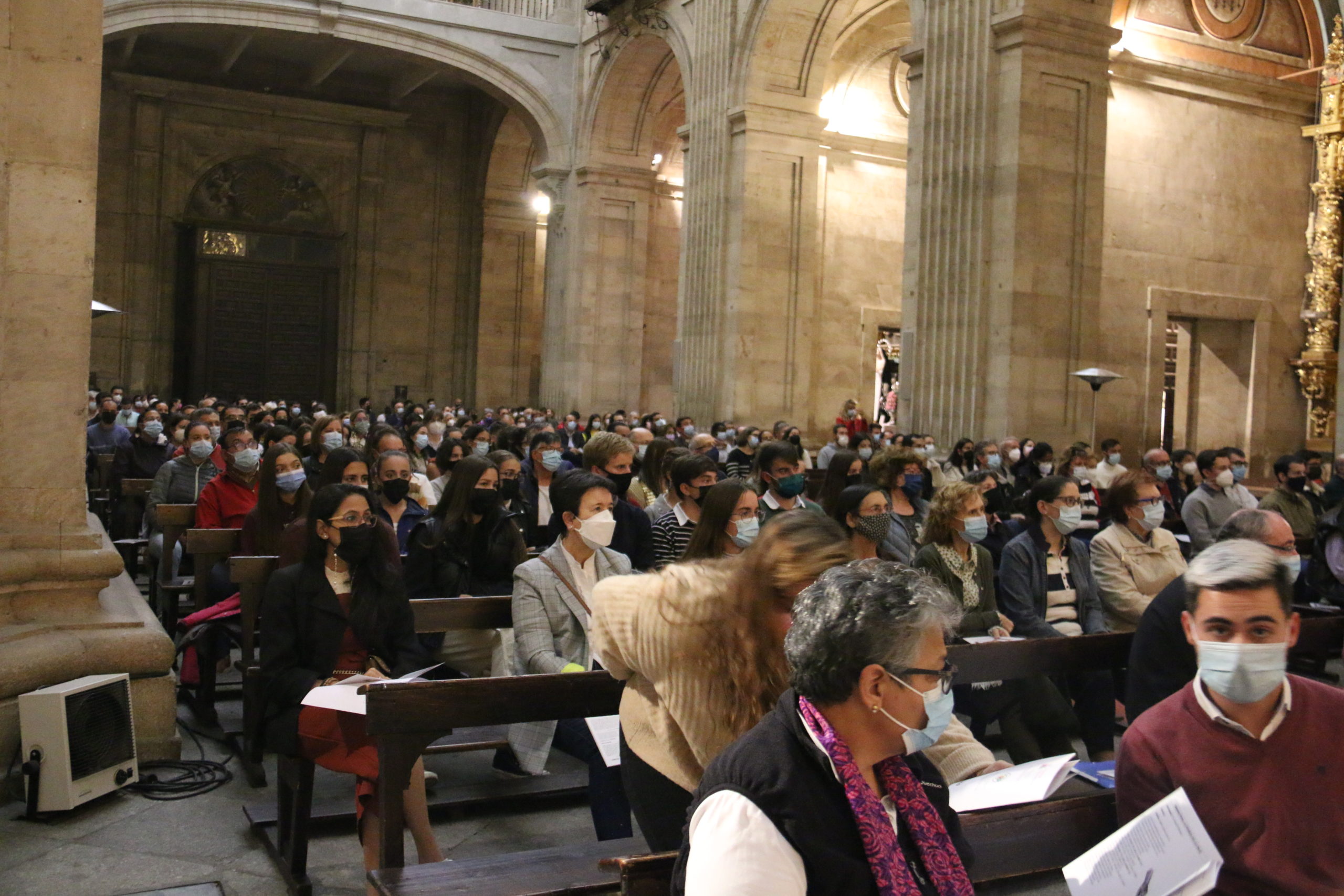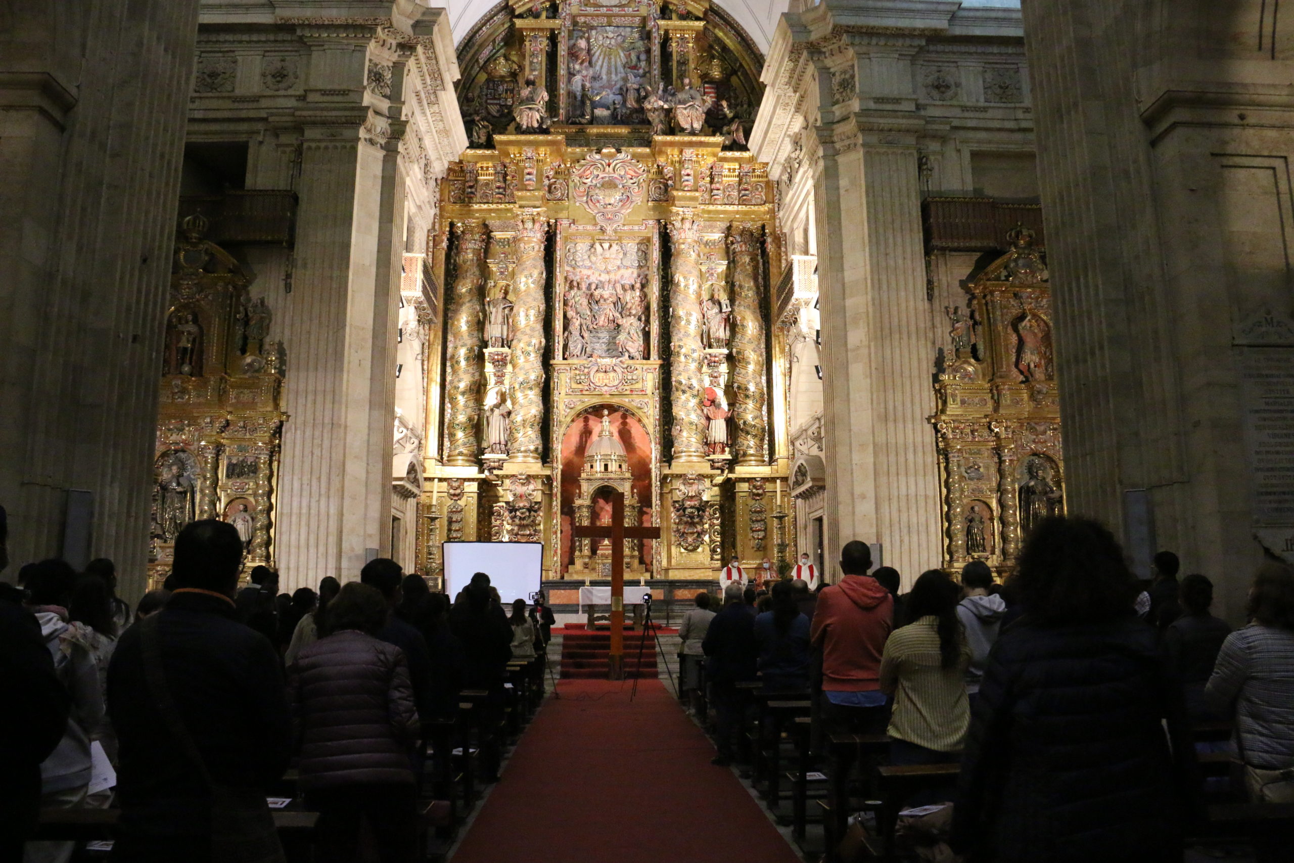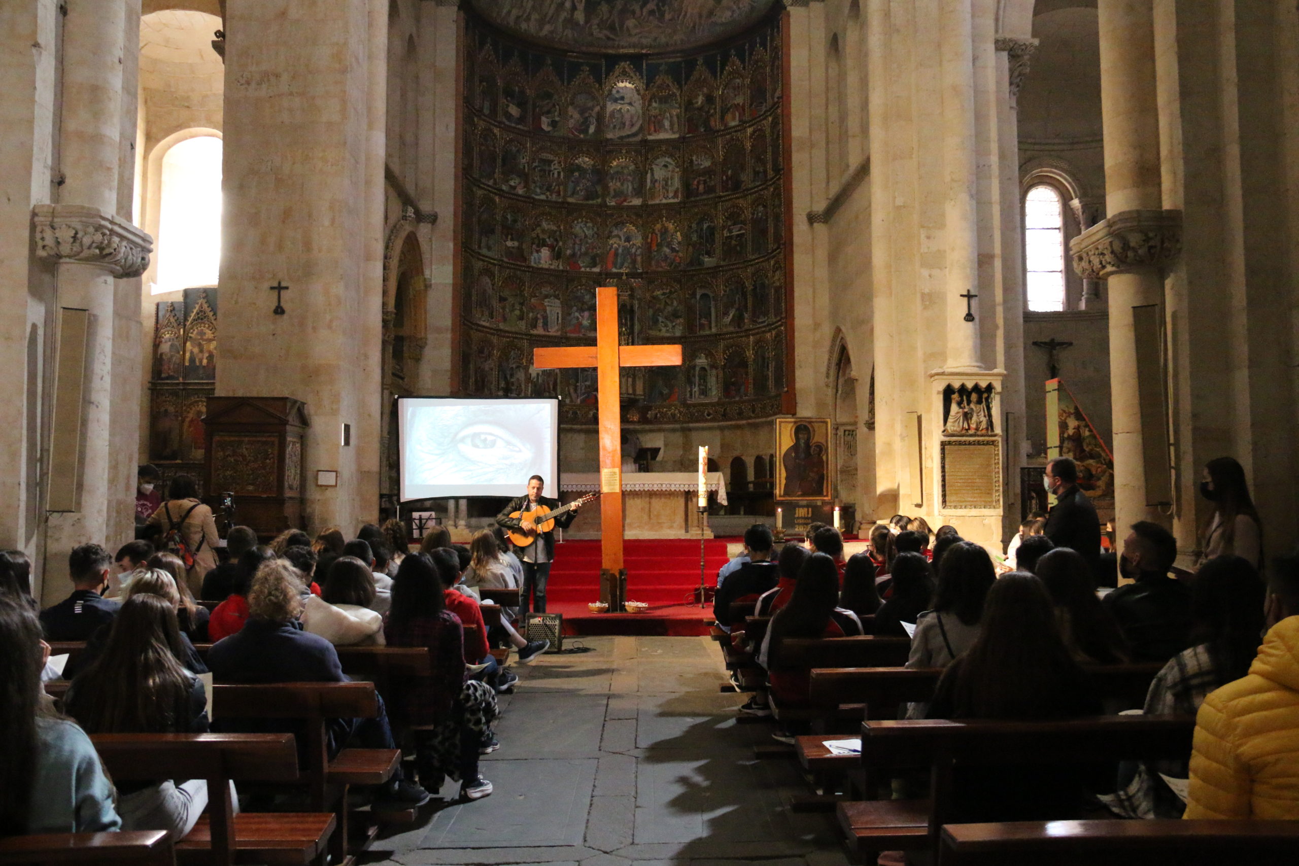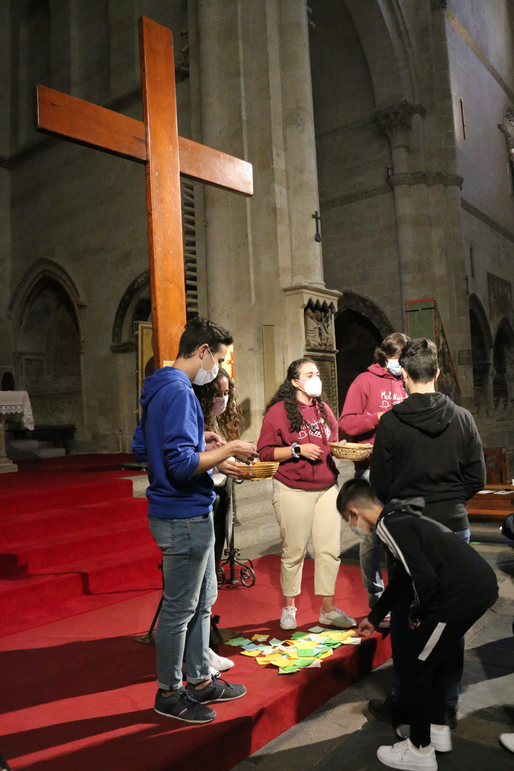 En la Catedral Vieja tuvo lugar un encuentro con 476 jóvenes de ESO y Bachillerato de 12 centros salmantinos, entre ellos, un grupo de Ciudad Rodrigo, a los que se les presentó ambos símbolos ubicados en el altar. Tras una lectura del Evangelio de San Juan, se les invitó a reflexionar sobre: “Y tú, ¿qué harías por el mundo?“. El encuentro, dividido en dos grupos de más de 200 alumnos, concluyó con la oración “Instrumentos de paz”, de San Francisco de Asís. Uno a uno, los jóvenes se acercaron a la Cruz de las Jornadas Mundiales de la Juventud para hacer un gesto de adoración.