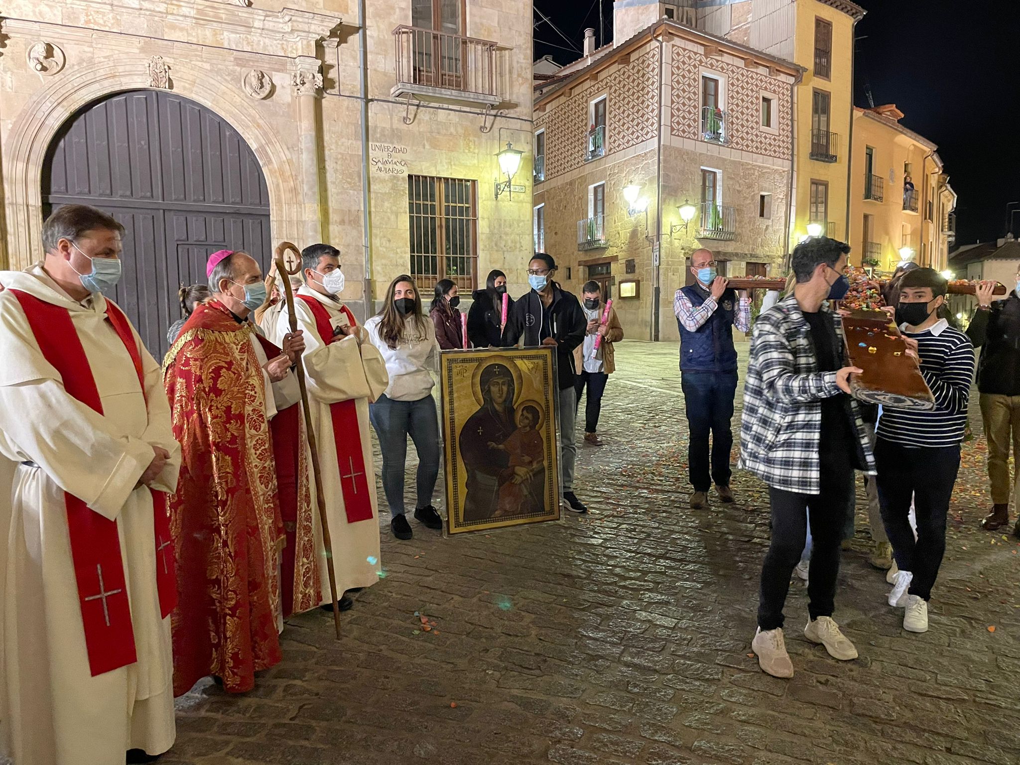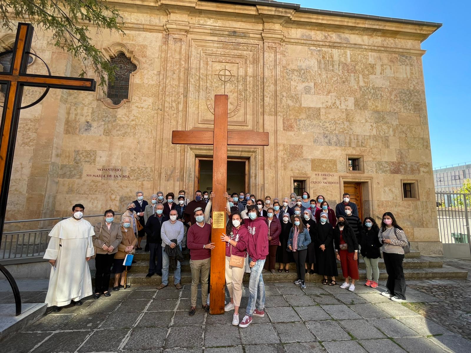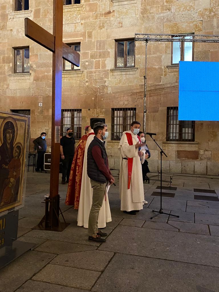 Sobre las tres de la tarde, el icono de la Virgen y la Cruz se trasladaron al monasterio de las Oblatas de Cristo Sacerdote, en la avenida de los Maristas, donde fueron recibidas por las hermanas, y donde religiosos de la vida consagrada y sacerdotes de la Diócesis de Salamanca rezaron la oración de nona. La responsable de la Delegación para los Institutos de Vida Consagrada y Sociedades de Vida Apostólica, la Hija de Jesús, Inés Cruz, apuntó en el saludo inicial que era un acontecimiento importante y significativo para la Iglesia de Salamanca, “reunirnos en torno a este símbolo central de nuestra vida y de la JMJ”.