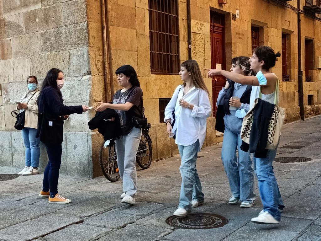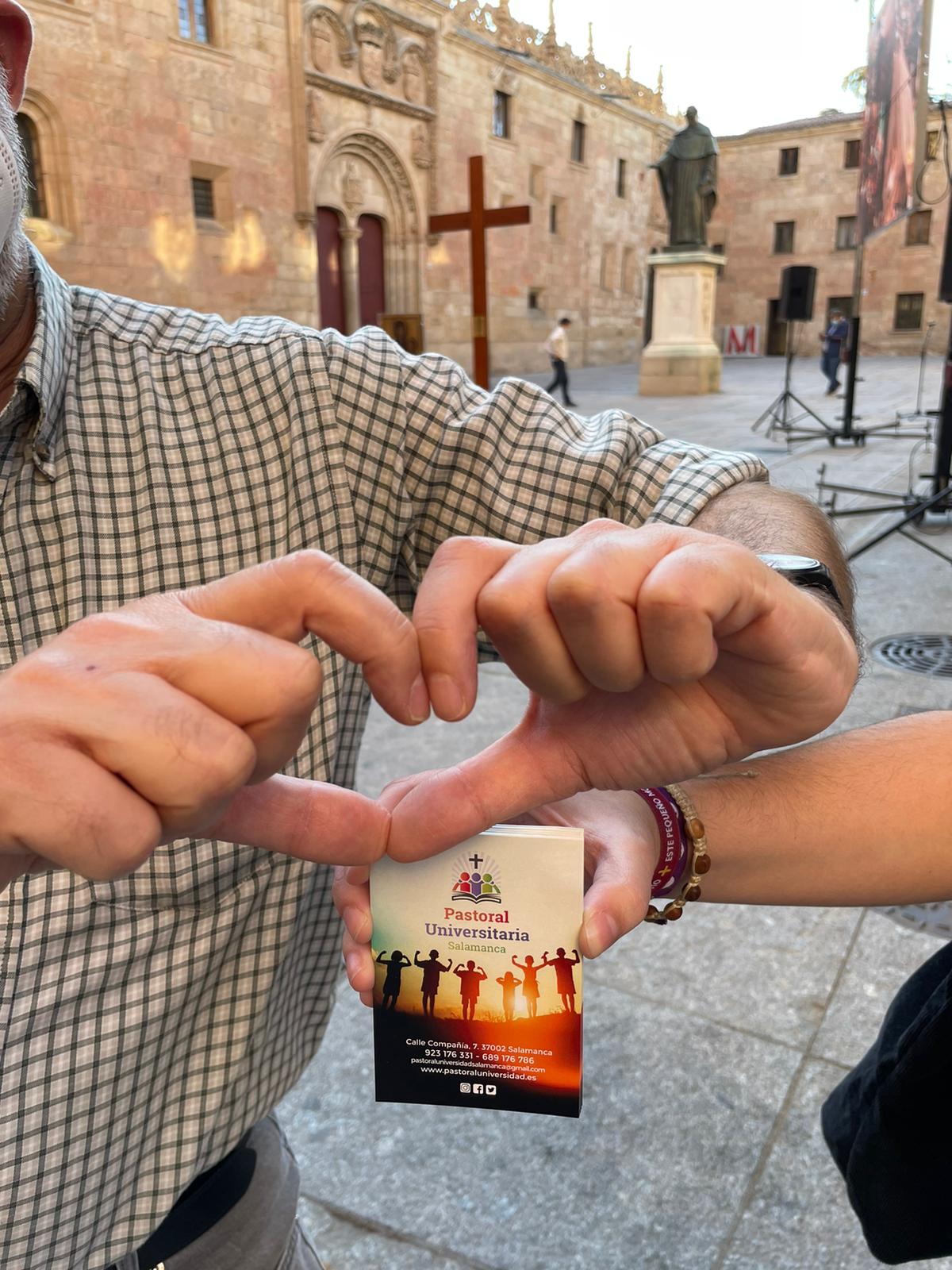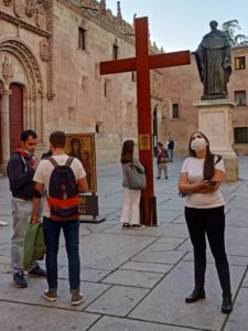 La Cruz peregrina y el icono de María volvieron de nuevo al centro de la ciudad a media tarde, al Patio de Escuelas, donde se proyectó un vídeo y se repartieron tarjetas con información sobre los próximos encuentros: “Camino previo a la Peregrinación Europea de Jóvenes (27 de julio al 2 de agosto); Peregrinación Europea (PEJ), del 3 al 7 de agosto en Santiago de Compostela; y JMJ de Lisboa 2023, del 1 al 6 de agosto. Y antes de partir hacia la iglesia de La Clerecía, donde tuvo lugar una vigilia de oración, como despedida del Patio de Escuelas tuvo lugar un gesto de promesa.