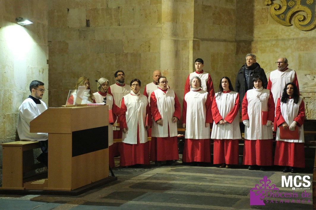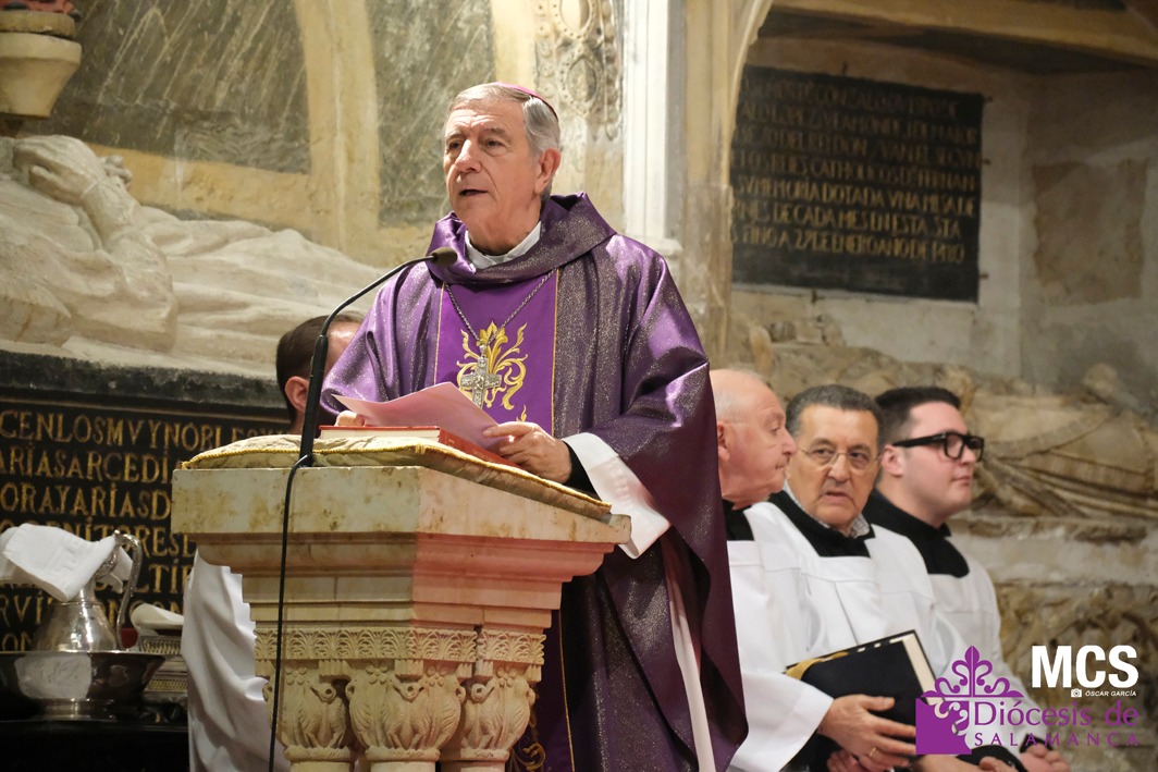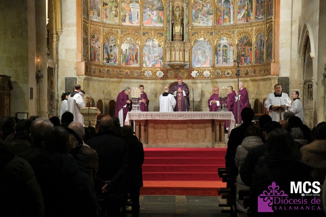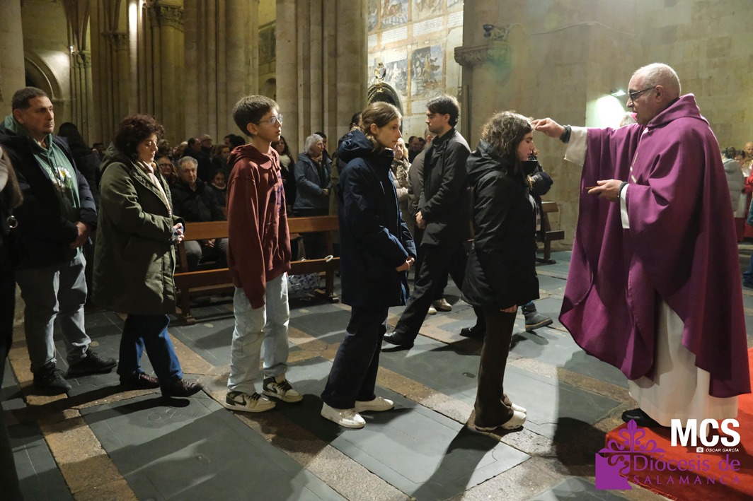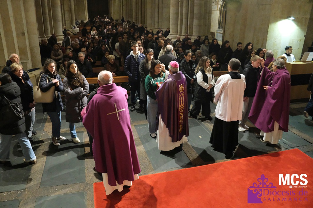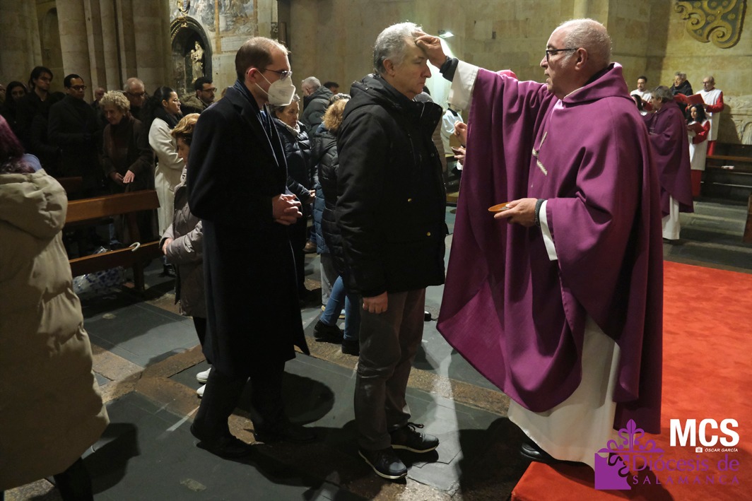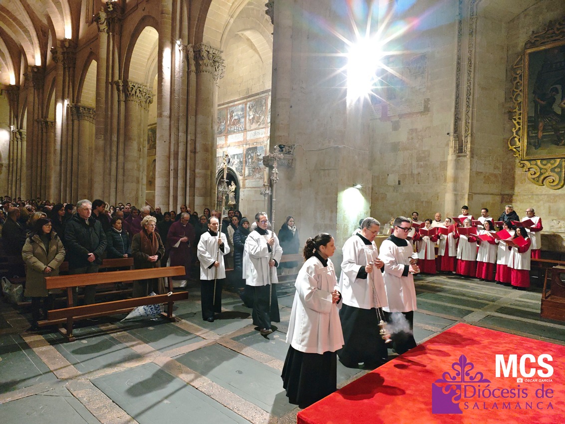 La Catedral vieja de Salamanca acogió la celebración del Miércoles de Ceniza, presidida por el obispo, Mons. José Luis Retana, concelebrada por el deán y varios canónigos del Cabildo. Numerosos fieles participaron en la eucaristía, entre ellos muchos jóvenes, con el acompañamiento musical del Coro de la Catedral.