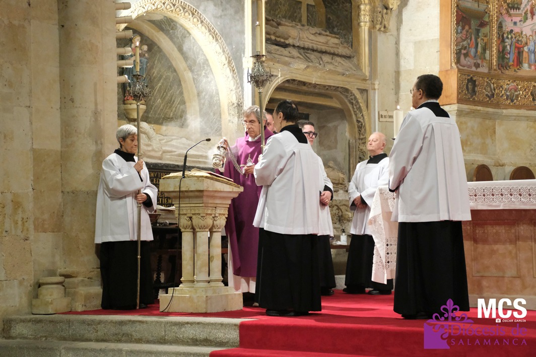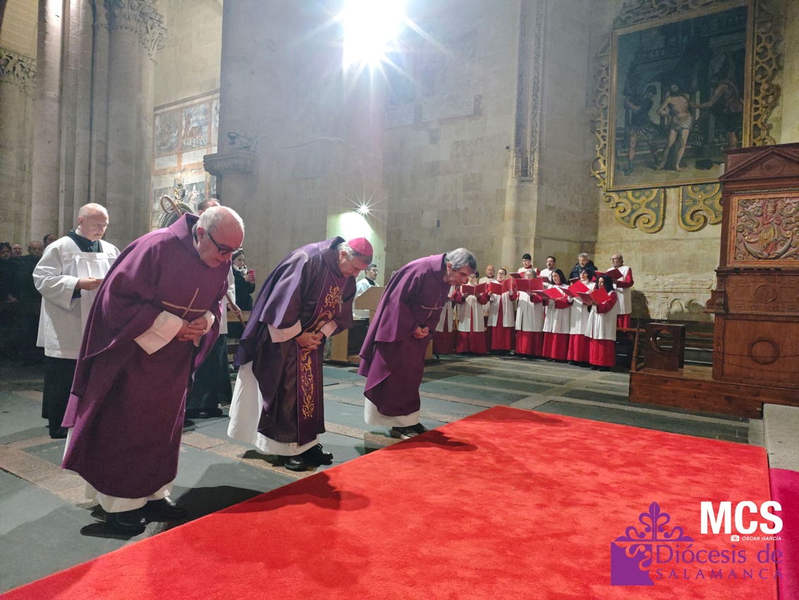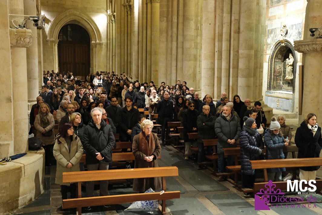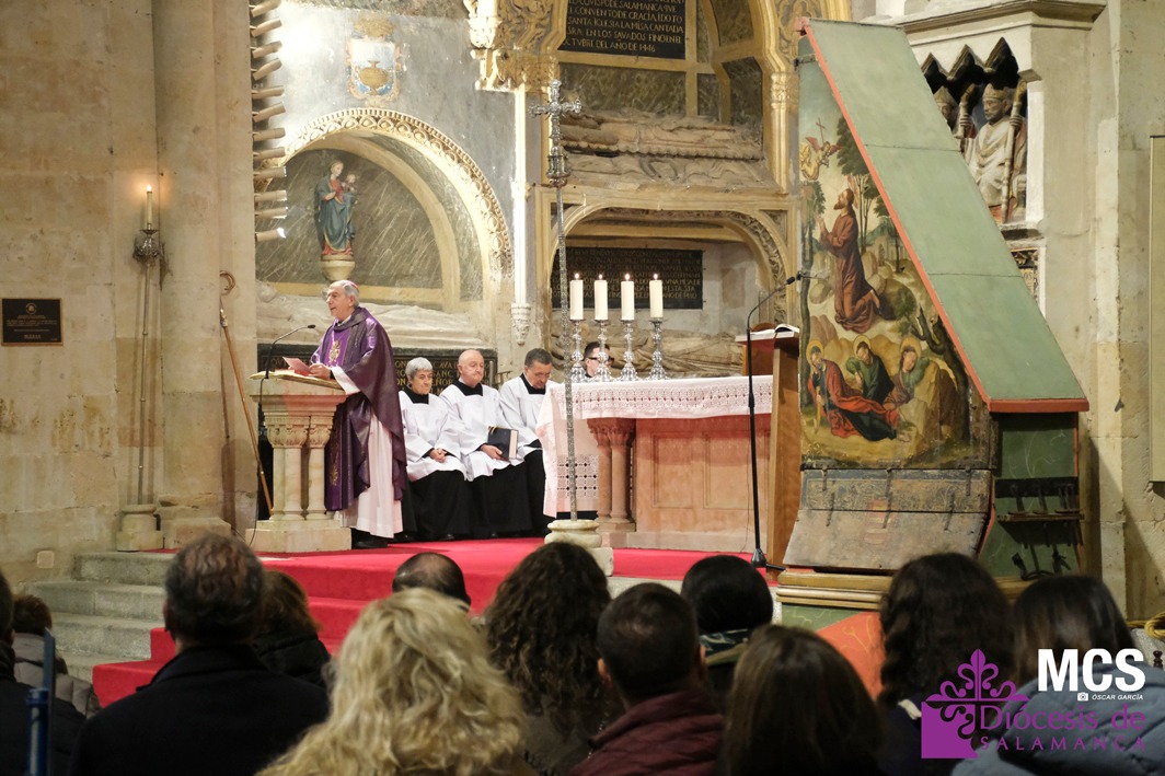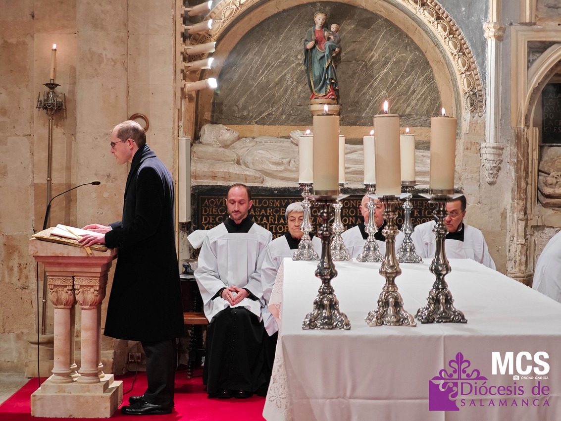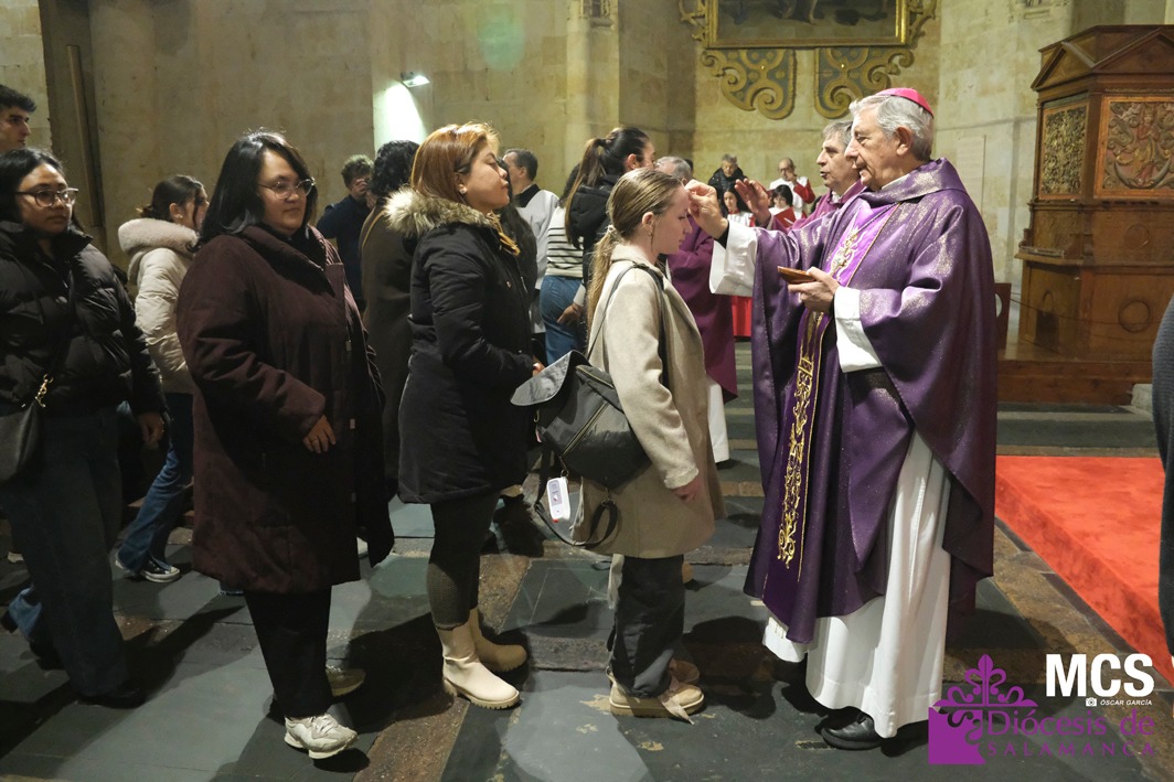 La Catedral vieja de Salamanca acogió la celebración del Miércoles de Ceniza, presidida por el obispo, Mons. José Luis Retana, concelebrada por el deán y varios canónigos del Cabildo. Numerosos fieles participaron en la eucaristía, entre ellos muchos jóvenes, con el acompañamiento musical del Coro de la Catedral.