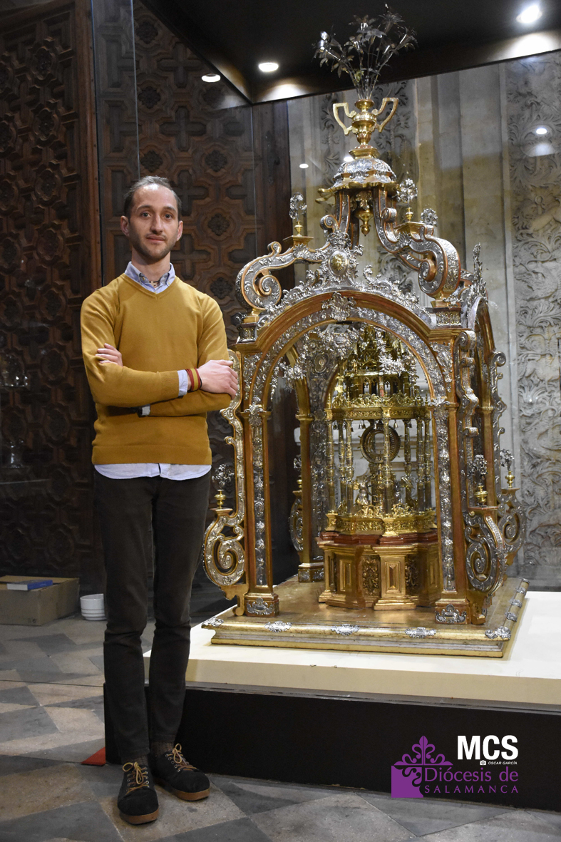 La Catedral de Salamanca cuenta entre su patrimonio con una custodia de asiento que abandona su vitrina de la sacristía cada año para conmemorar la solemnidad del Corpus Christi. Debido a la pandemia y a la consiguiente suspensión de la procesión, este domingo, tampoco saldrá por las calles de la capital. Pero junto al historiador del Arte y técnico del templo salmantino, Raúl Benito, repasamos los detalles de la misma y la simbología de esta festividad.