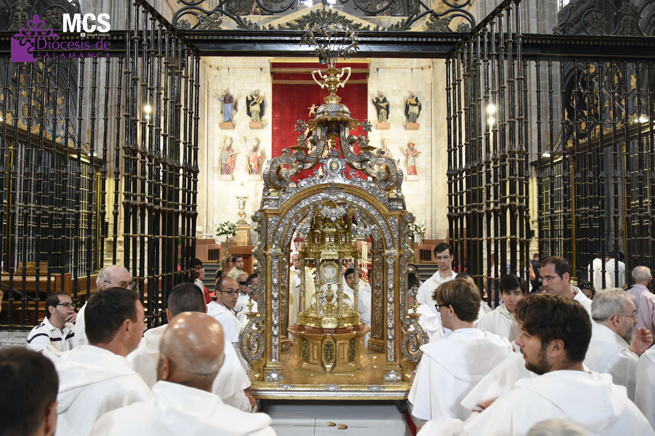 En cuanto a la custodia, es el elemento donde se coloca el Santísimo Cuerpo de Cristo para la procesión de la fiesta del Corpus Christi. En la Catedral Nueva de Salamanca se conserva, entre otras, una custodia de asiento que corresponde a distintas etapas de realización.