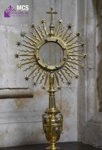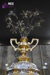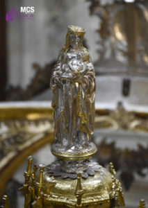 La custodia está coronada por un jarrón de azucenas, símbolo de la pureza virginal de María, “símbolo también de la Catedral”. Asimismo, este experto señala que la Virgen se la considera el primer sagrario, “porque mantuvo dentro de sí el Cuerpo de Cristo, y por eso, aparece en elementos plenamente eucarísticos como puedan ser una custodia o la puerta de un sagrario”.
