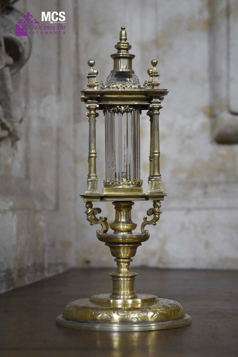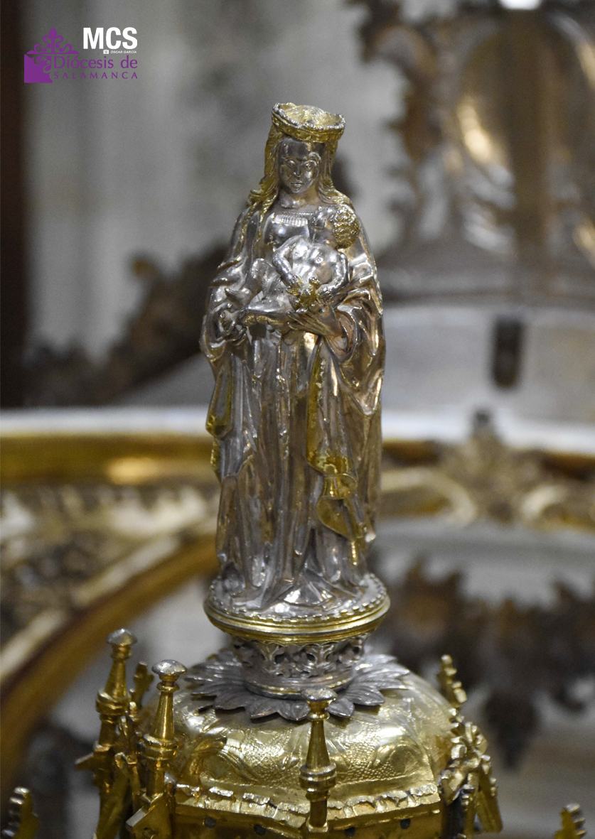 “La parte más antigua corresponde al segundo tercio del siglo XV, y responde a un gusto típicamente gótico con una tracería calada y gabletes que definen el tiempo al que pertenece”, describe Benito. La custodia está rodeada por los doce apóstoles y en el centro superior, la imagen de la Virgen con el niño en brazos, “que se conoce como la Virgen del pajarito, porque el niño lleva un pajarito en la mano”. Además, es iconográficamente relevante para la Catedral de Salamanca, admite Benito, “puesto que la Virgen de la sede que estuvo presidiendo el retablo de la Catedral Vieja, tiene esa misma iconografía, la Virgen con el niño en brazos, y el niño sosteniendo un pájaro en la mano”.