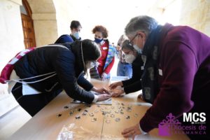 Tras finalizar la oración en la capilla, los asistentes se dividieron en siete grupos y comenzaron la segunda parte del encuentro en uno de los pasillos del claustro de la Casa de la Iglesia. En concreto, participaron en una dinámica que consistía en la elaboración de un puzle individual, de 70 piezas, que a su vez formaba parte de otro de mayor tamaño. En dicho puzle estaba representada la asamblea diocesana en peregrinación, junto a su anterior pastor, Mons. Carlos López. Dicha imagen tenía el logo del Sínodo, que tuvieron que encajar entre todos.