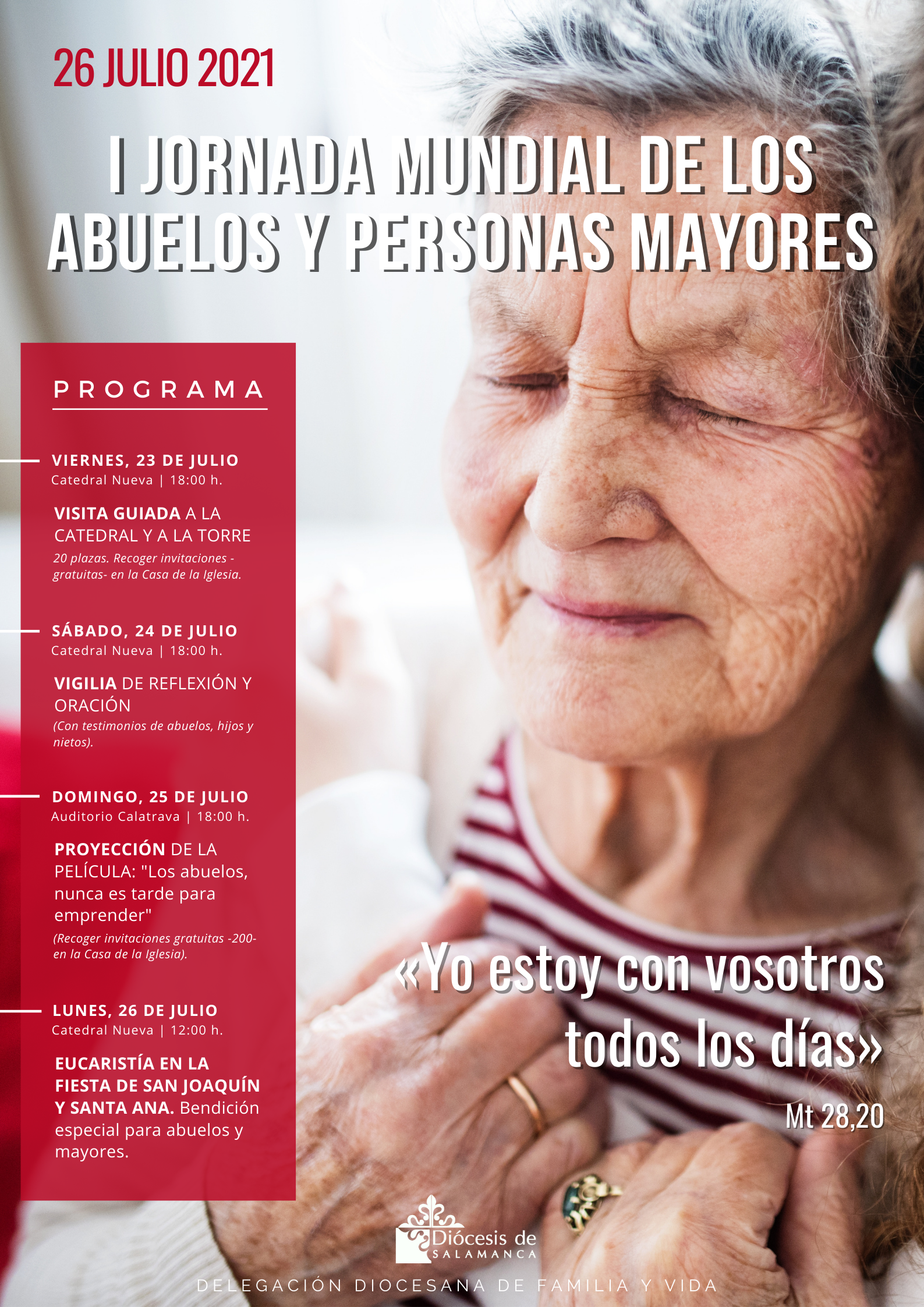 Bajo el lema, “Yo estoy contigo todos los días” (Mt 28. 20), la Diócesis de Salamanca se suma a la convocatoria del Papa Francisco para conmemorar por primera vez la Jornada Mundial de los Abuelos y las Personas Mayores, en torno a la festividad de San Joaquín y Santa Ana.