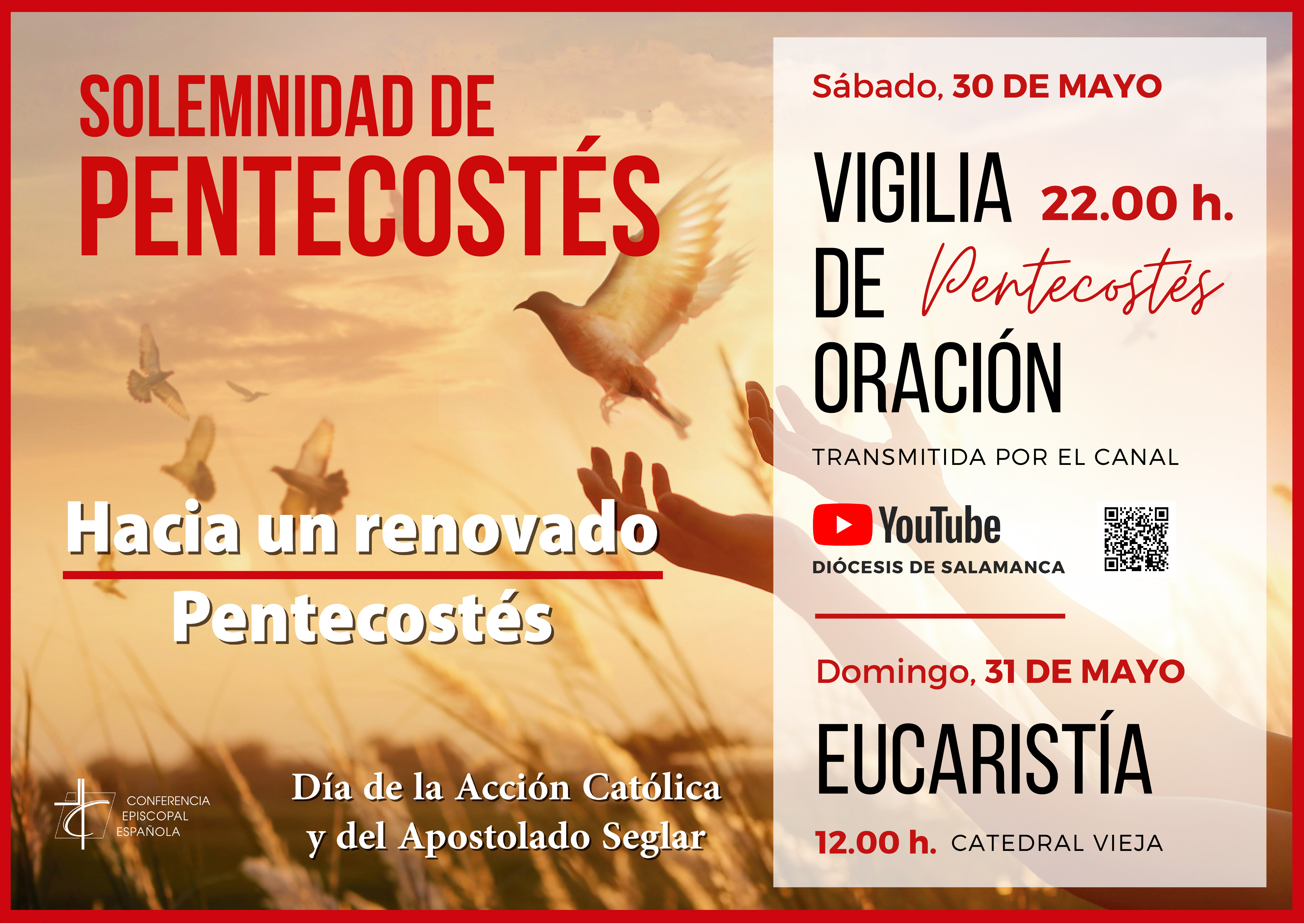 La Vigilia tendrá lugar el sábado 30 de mayo, y puede seguirse a partir de las 22.00 horas a través del canal Youtube de la Diócesis de Salamanca y en las redes sociales de la diócesis.