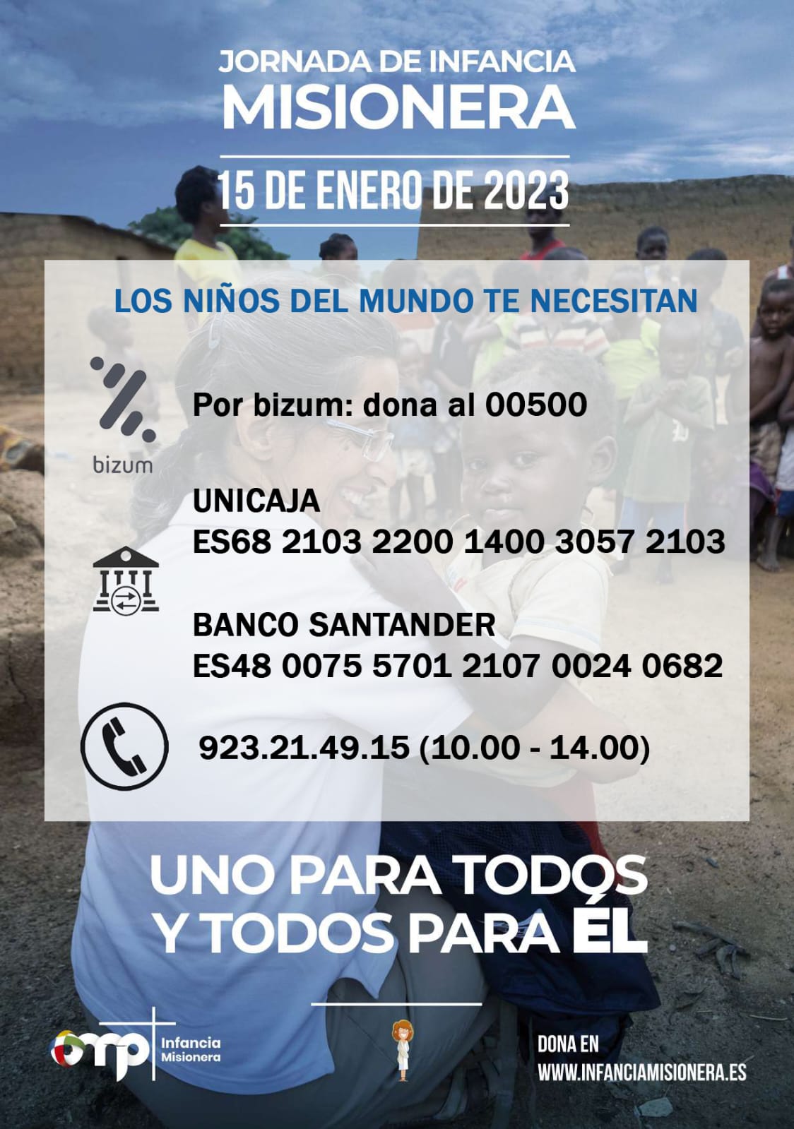 Los que deseen colaborar con los proyectos de Infancia Misionera, pueden aportar su donativo en sus parroquias, en la colecta del 15 de diciembre, o bien realizar una aportación en cualquiera de las cuentas bancarias de OMP Salamanca, en Unicaja o el Banco Santander. También existe la opción de aportar una donación desde el móvil a través de Bizum , introduciendo el código 00500.