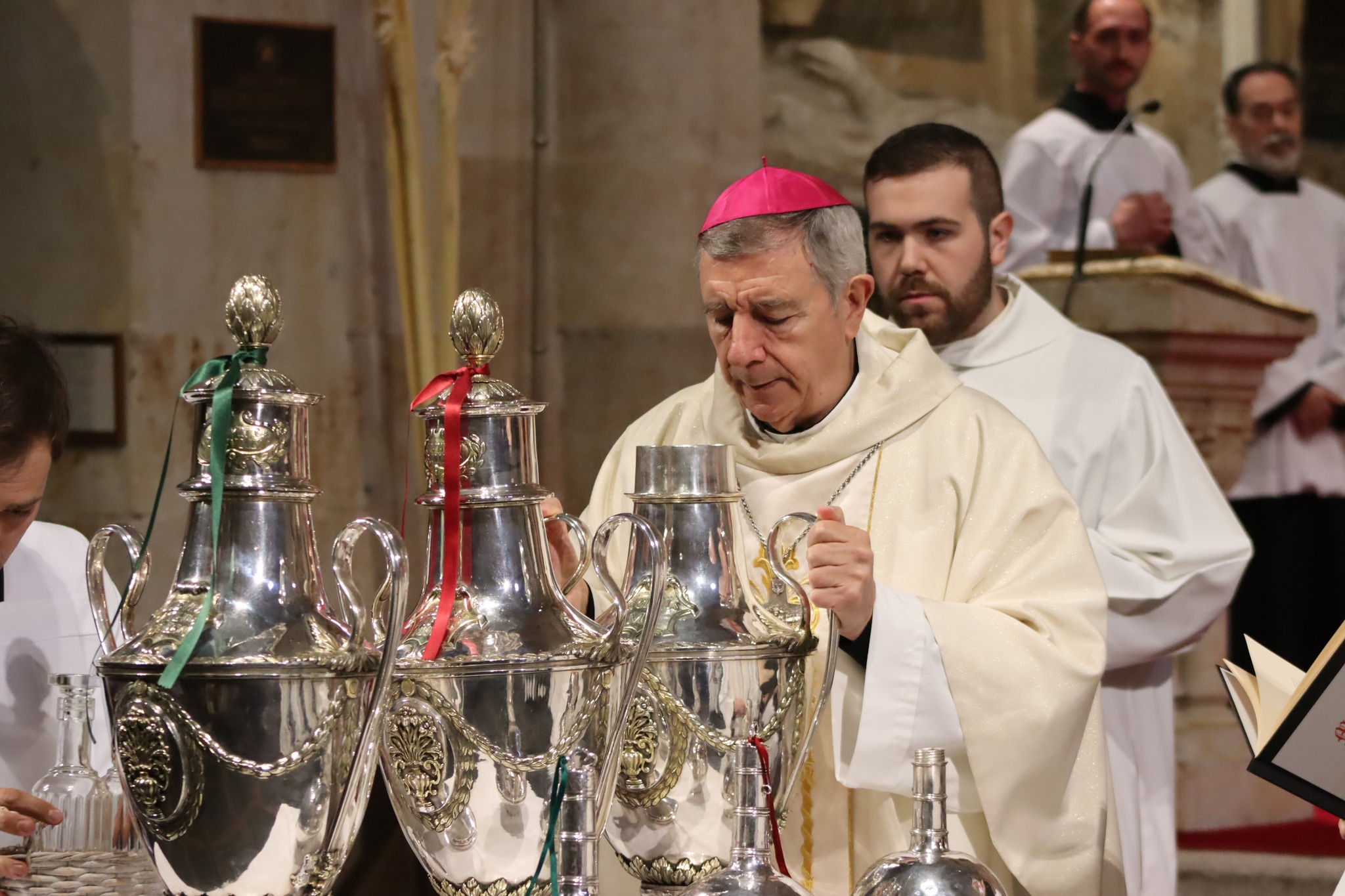 El óleo de los enfermos se bendice al final de la plegaria eucarística y es que se administra en el sacramento de la Unción de enfermos; mientras que el óleo de los catecúmenos se bendice después del rito de la Comunión, y es con el que se unge a los nuevos bautizados. A continuación, se consagra también el Santo Crisma: el obispo introduce los aromas en el ánfora correspondiente y exhala su aliento sobre el aceite como símbolo de la acción del Espíritu Santo.