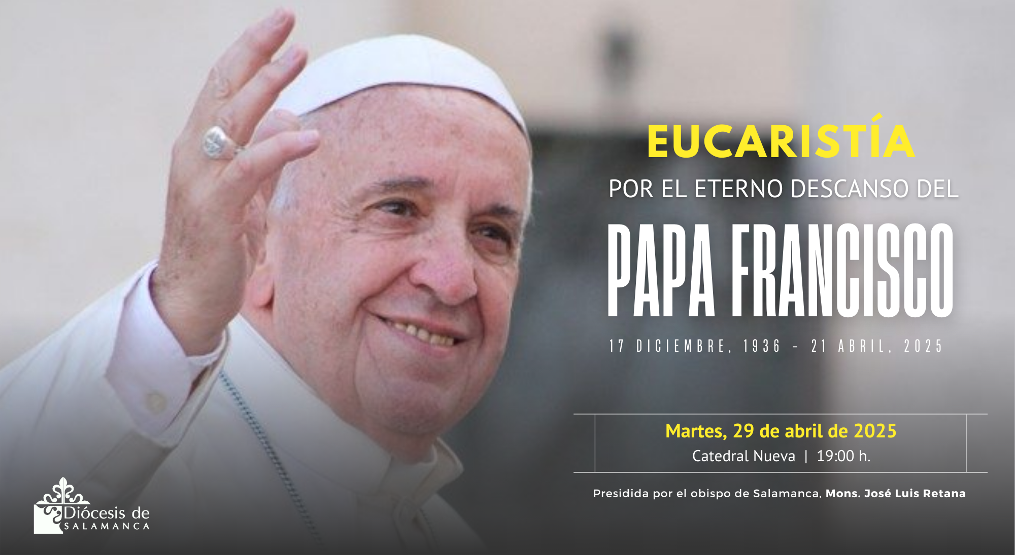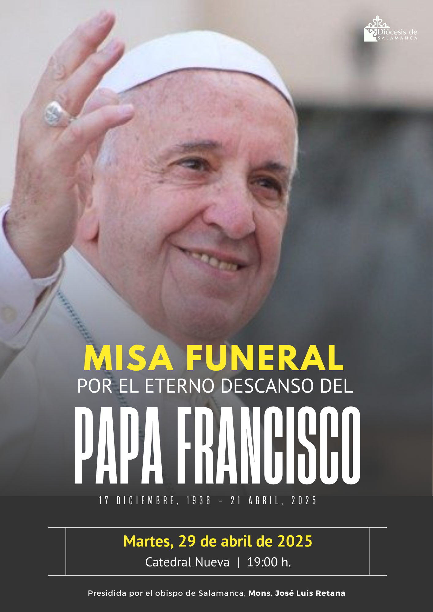 La Iglesia de Salamanca se une al dolor de toda la Iglesia Universal ante la noticia del fallecimiento del papa Francisco, y celebrará una misa funeral el próximo martes, 29 de abril, a las 19:00 horas, en la Catedral Nueva, presidida por el obispo diocesano, Mons. José Luis Retana, para rezar por el descanso eterno del santo padre y dar gracias a Dios por su vida y su servicio a la Iglesia. Tras conocer que sus exequias serán el sábado, 26 de abril, a las diez de la mañana en Roma, se ha decidido aplazar la eucaristía de acción de gracias que estaba prevista para este viernes.
