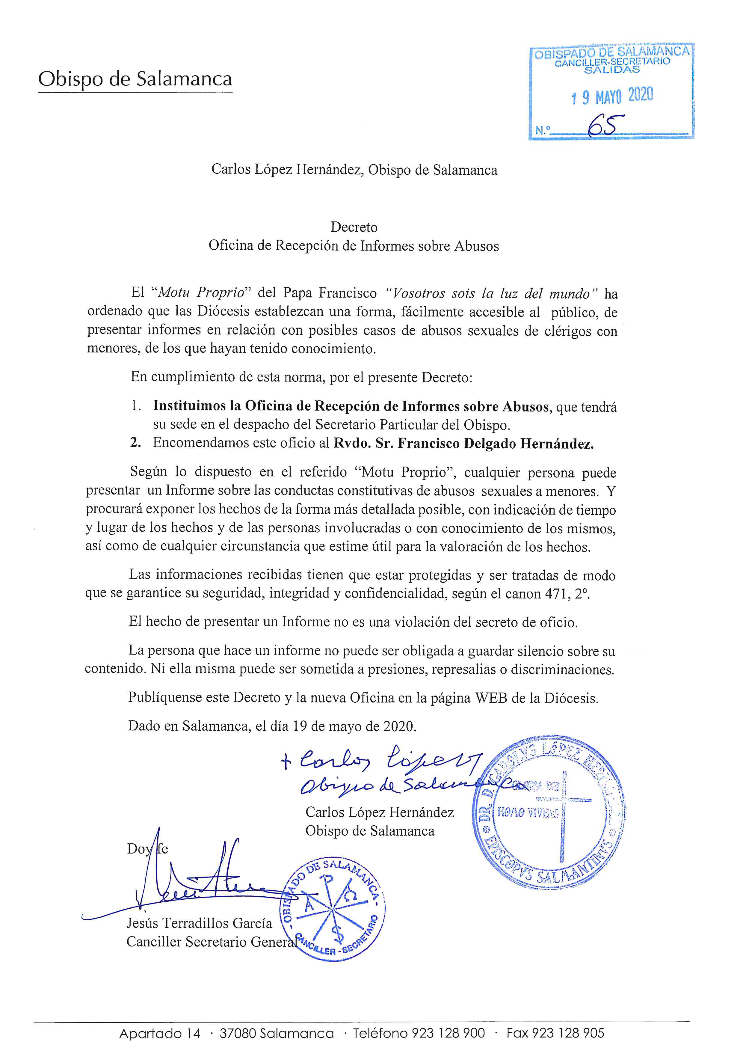 El obispo de la Diócesis de Salamanca, Carlos López Hernández, ha publicado un decreto para la institución de la Oficina de Recepción de Informes sobre Abusos, según se establece en el “Motu Proprio” del Papa Francisco, Vos estis lux mundo (“Vosotros sois la luz del mundo”), que ordena su creación en las diócesis, una forma “fácilmente accesible al público, de presentar informes en relación con posibles casos de abusos sexuales de clérigos con menores, de los que hayan tenido conocimiento”.
