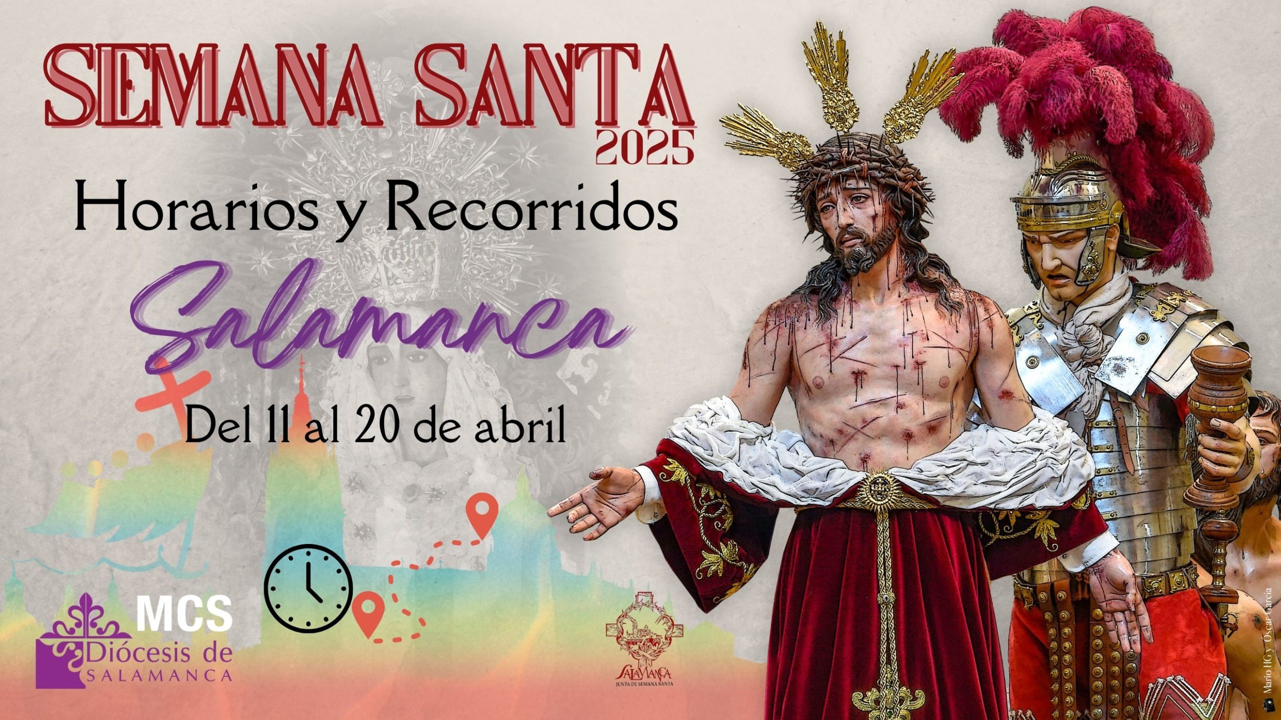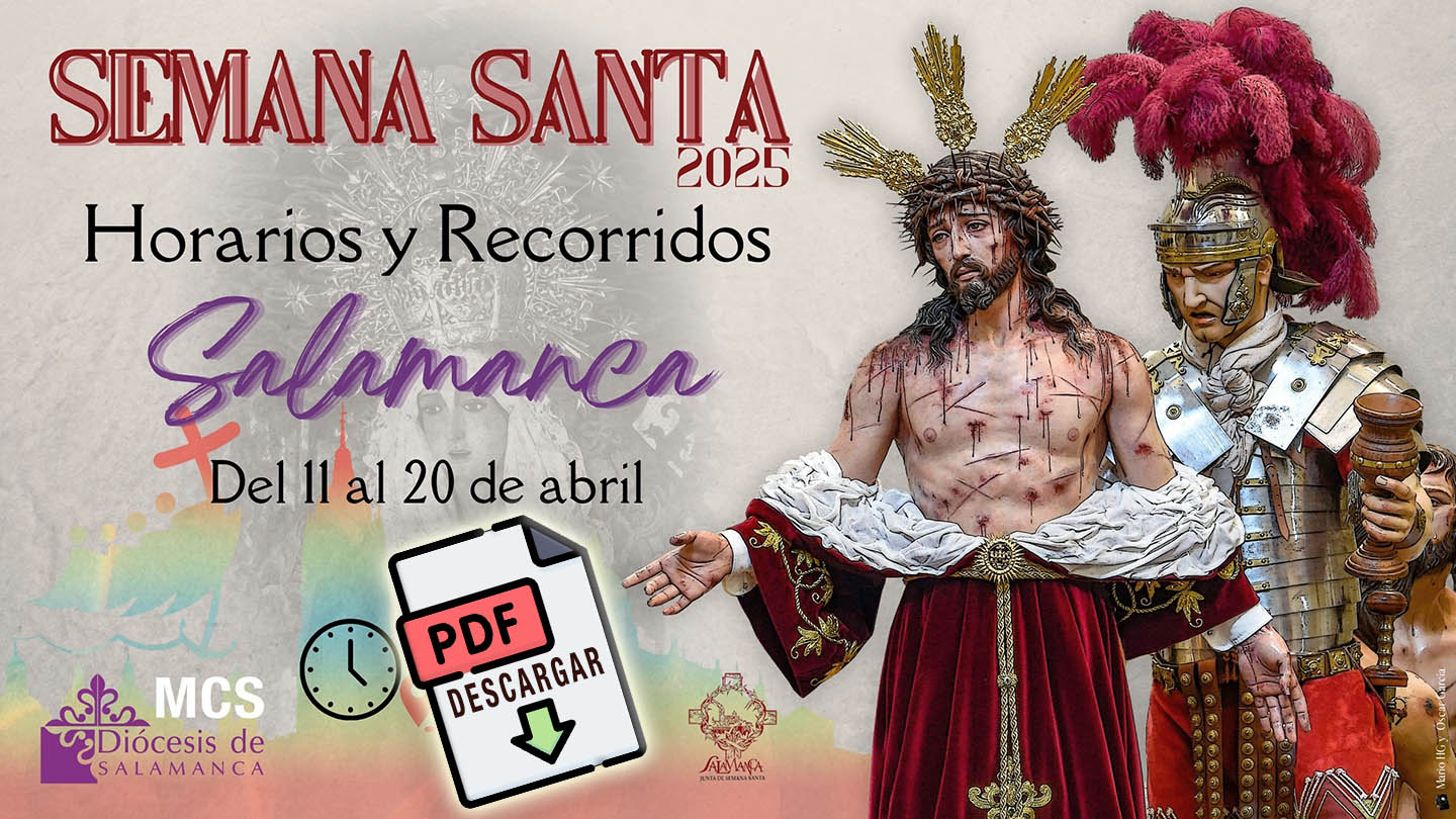 La Diócesis de Salamanca ha publicado una completa guía digital de la Semana Santa de Salamanca para facilitar el seguimiento de las procesiones que recorrerán las calles de la ciudad del 11 al 20 de abril. A lo largo de sus 48 páginas se detallan los desfiles penitenciales de las 18 cofradías, hermandades y congregaciones, con sus horarios, recorridos, acompañamientos musicales, fechas de fundación y autores de las imágenes de los pasos procesionales, diseñado por Óscar García.