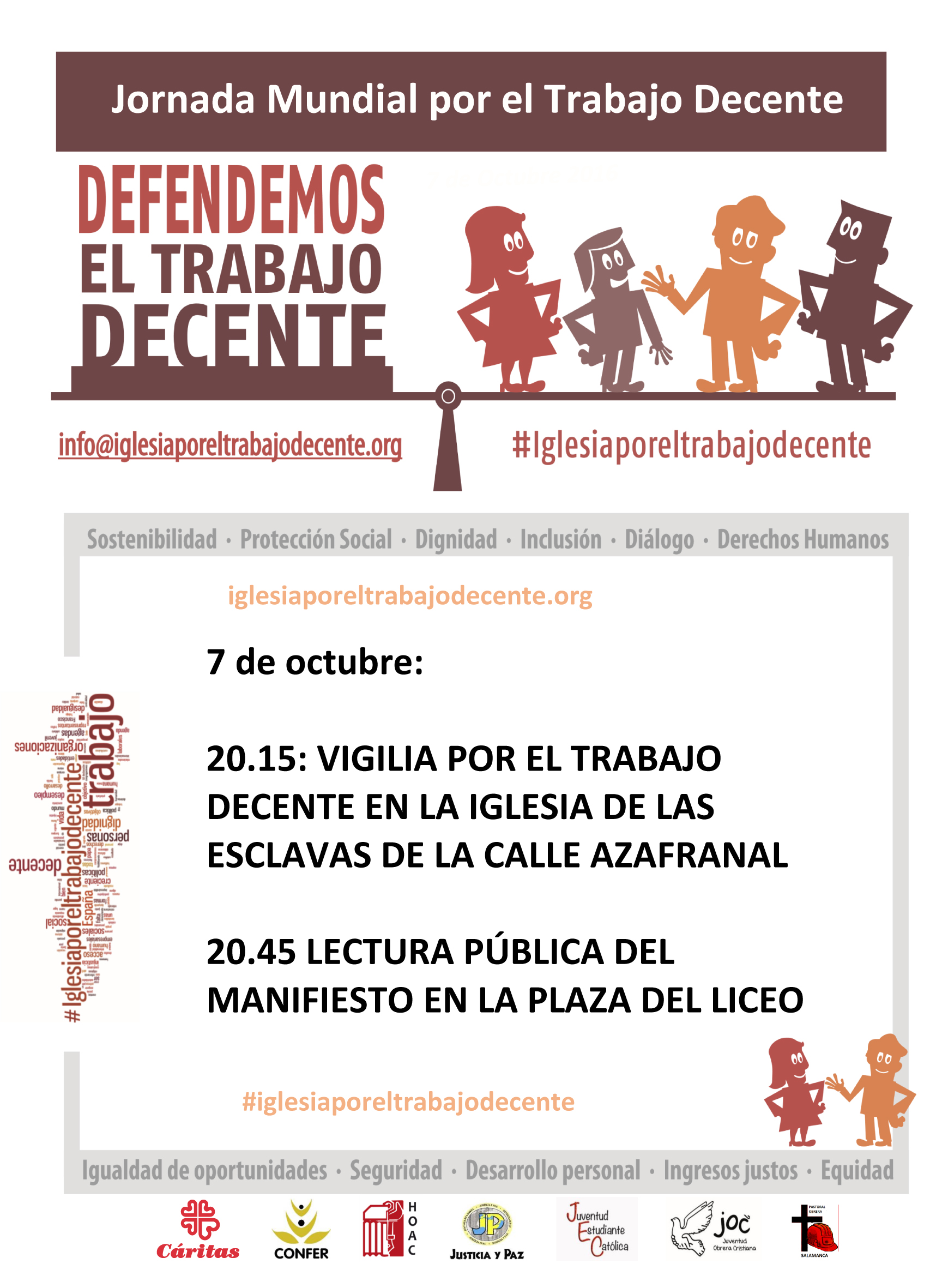 Con motivo de esta jornada, estas entidades invitan a participar el día 7 en la Vigilia por el Trabajo decente que tendrá lugar a las 20.15 horas en la iglesia de las Esclavas del Sagrado Corazón, en la calle Azafranal. Al finalizar se hará lectura del manifiesto en la plaza del Liceo, a las 20.45 de la tarde