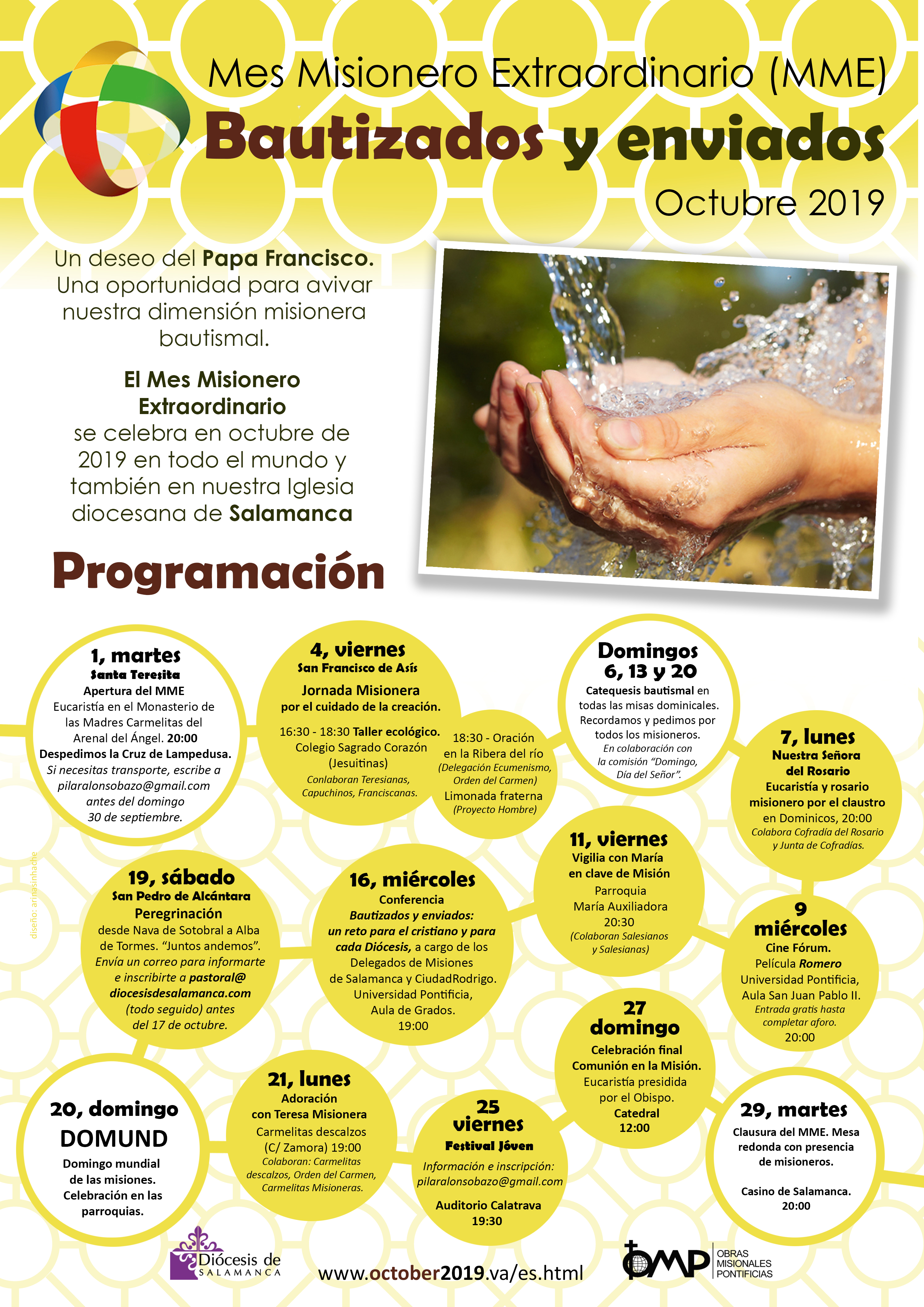 La guía para el Mes Misionero Extraordinario (MME) de Octubre 2019, con el tema “Bautizados y enviados: la Iglesia de Cristo en misión en el mundo”, es un texto elaborado por iniciativa de la Congregación para la Evangelización de los Pueblos y las Obras Misionales Pontificias (OMP), que contiene aportaciones de cristianos de todo el mundo y se dirige a los de los cinco continentes.