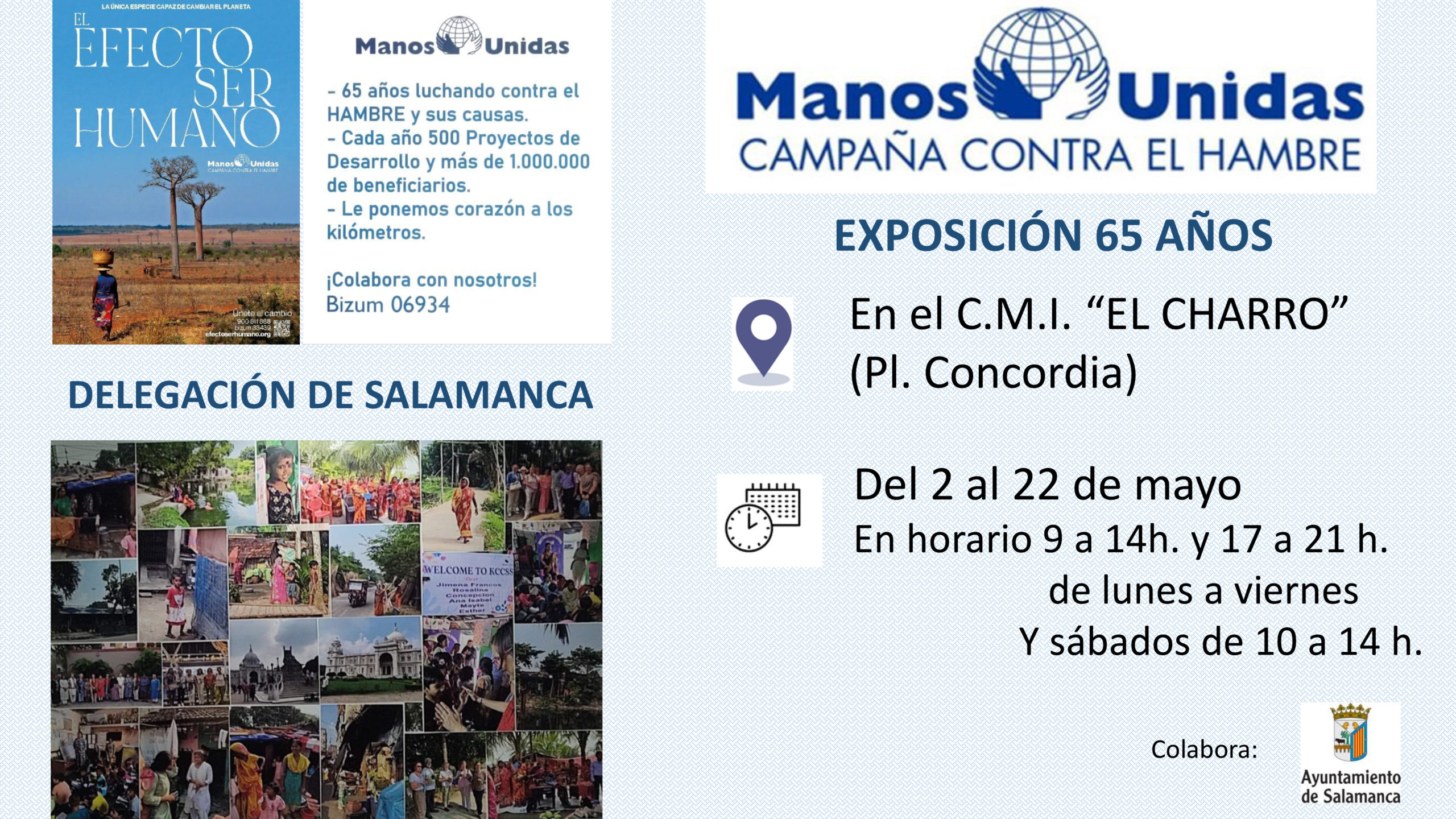 La sala de exposiciones del Centro Municipal Integrado Julián Sánchez ‘El Charro’ acogerá del 2 al 22 de mayo la muestra conmemorativa de los 65 años de Manos Unidas. Una exposición que tiene como objetivo principal visibilizar la labor de esta oenegé de desarrollo de la Iglesia católica en España en la lucha contra el hambre y la pobreza en el tercer mundo.