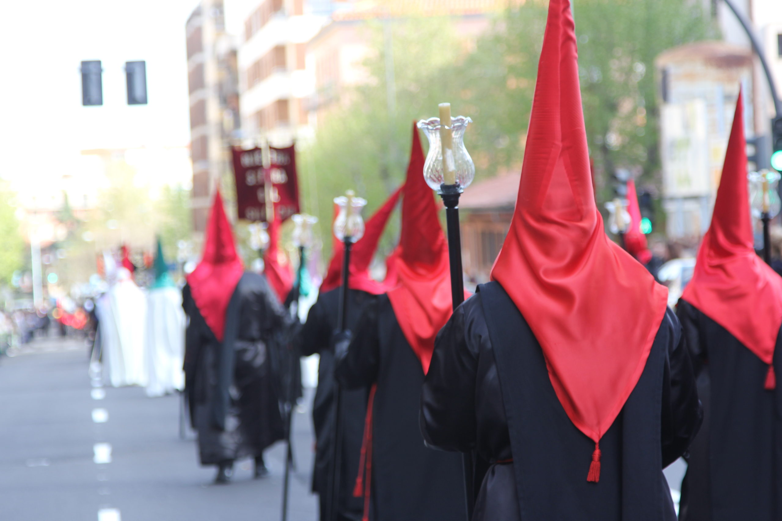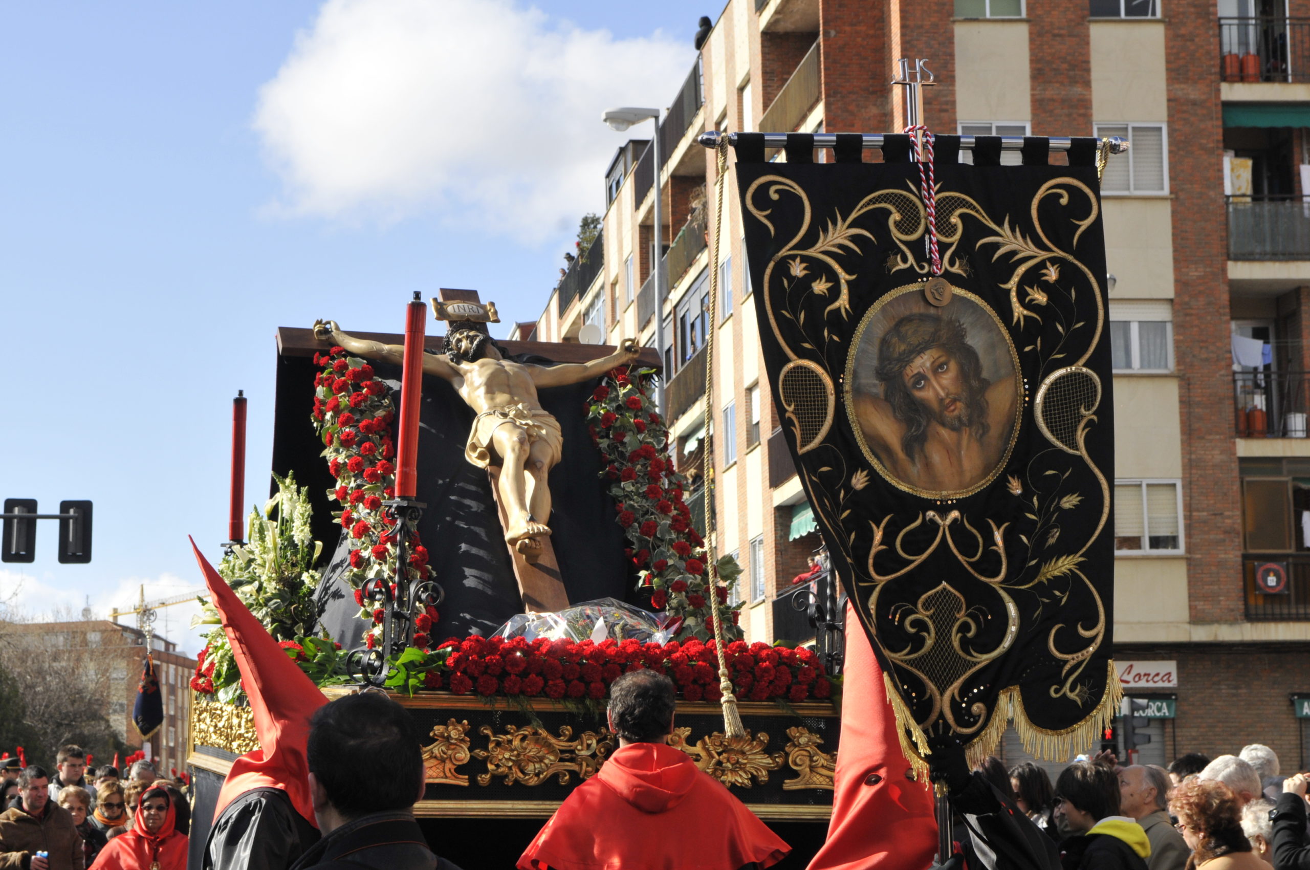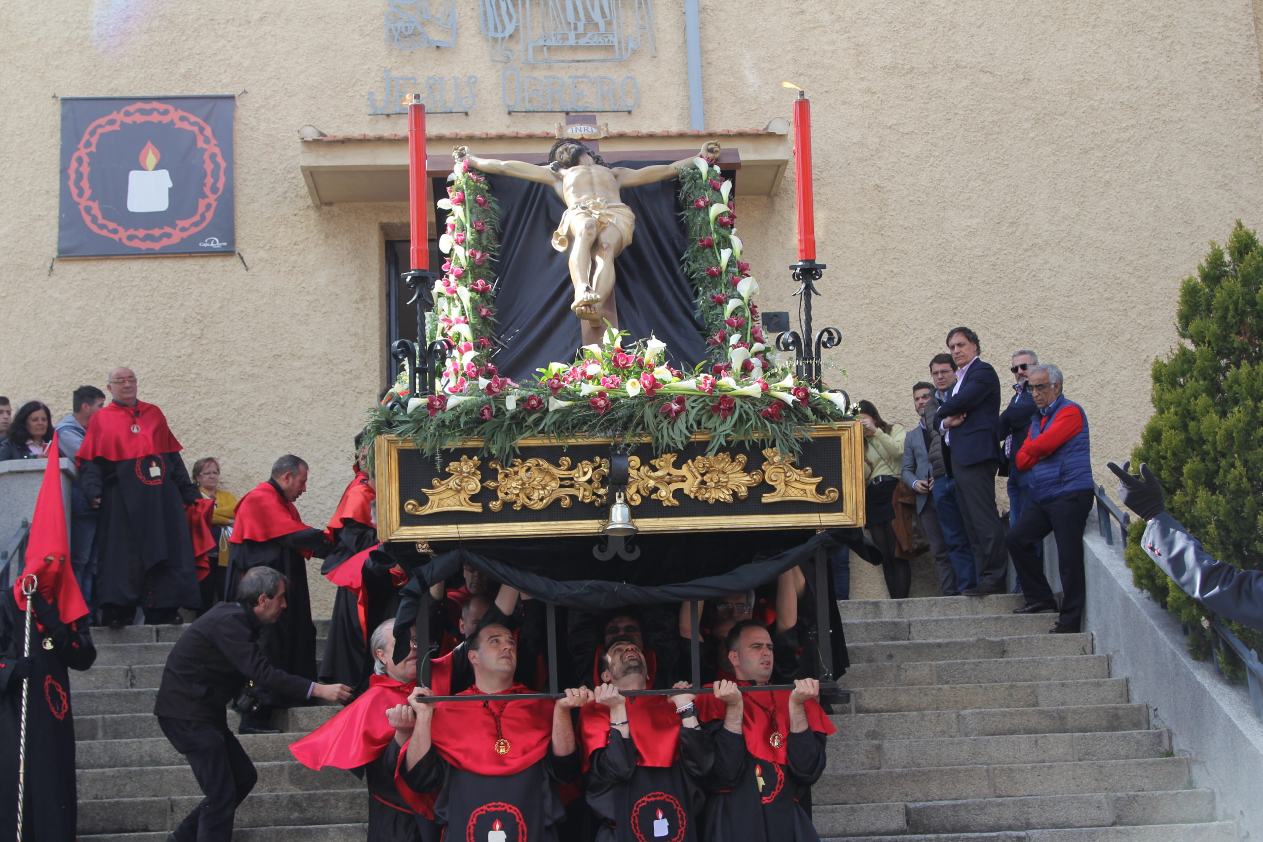 Los 15 primeros escalones de la parroquia de Jesús Obrero no son obstáculo para los hermanos y hermanas de carga del Cristo de la Vega y Nuestra Señora del Silencio. Cuentan con el calor y el aplauso de todo un barrio, el de Pizarrales, que se vuelca cada Semana Santa con su hermandad, la negra y roja.