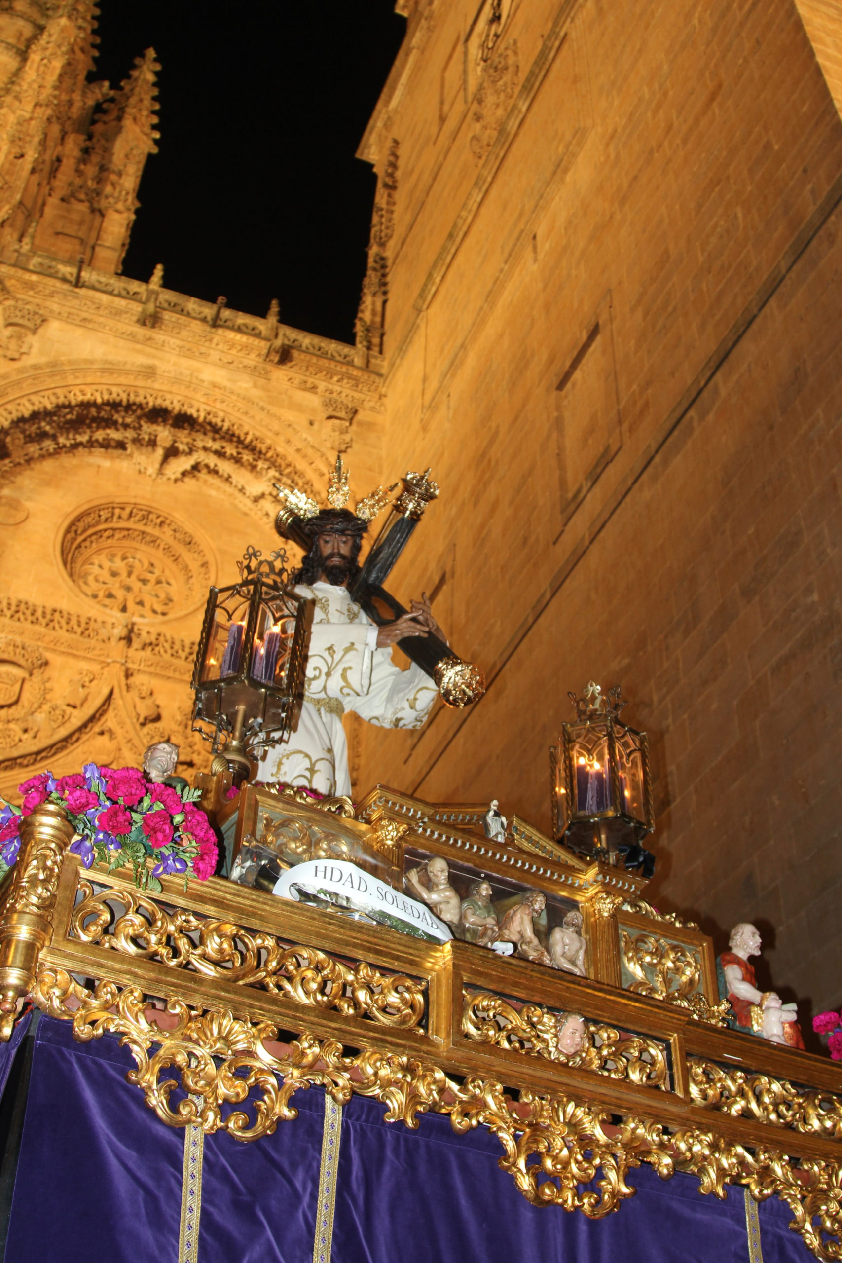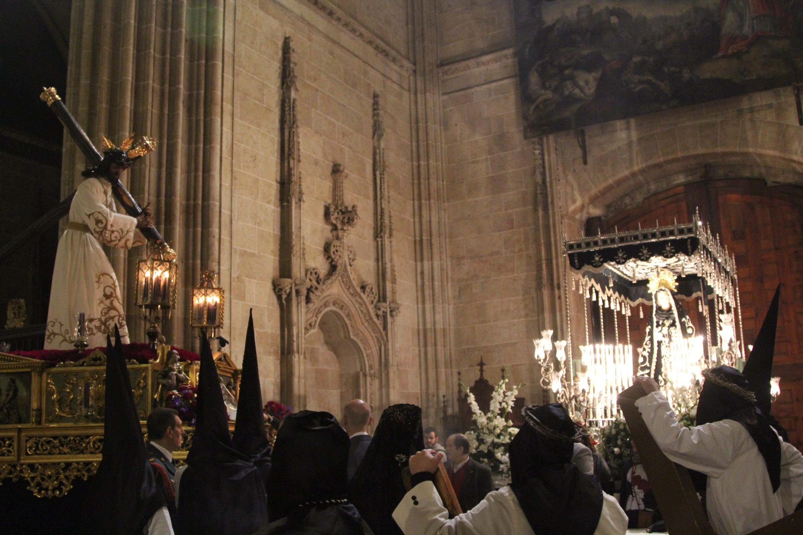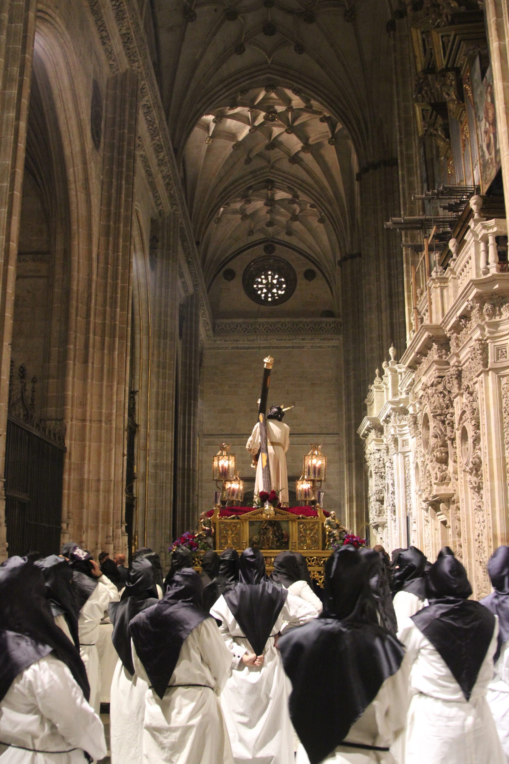 En la Catedral realizan estación de penitencia ante el Santísimo junto a sus cuatro imágenes, como subraya, “muchos fieles están viendo la procesión”, como en la salida de San Esteban. Gómez enumera otras de las calles por las que pasan según va amaneciendo, como Libreros, Compañía o Meléndez, “que son recorridos bonitos, de calles estrechas”.