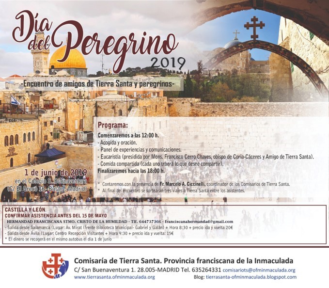 La Comisaria Franciscana de Tierra Santa en España ha organizado para el próximo 1 de junio el Día del Peregrino de Tierra Santa en Madrid. En Salamanca, colabora la Hermandad Franciscana del Santísimo Cristo de la Humildad con el traslado en autocar, con un coste de 20 euros.