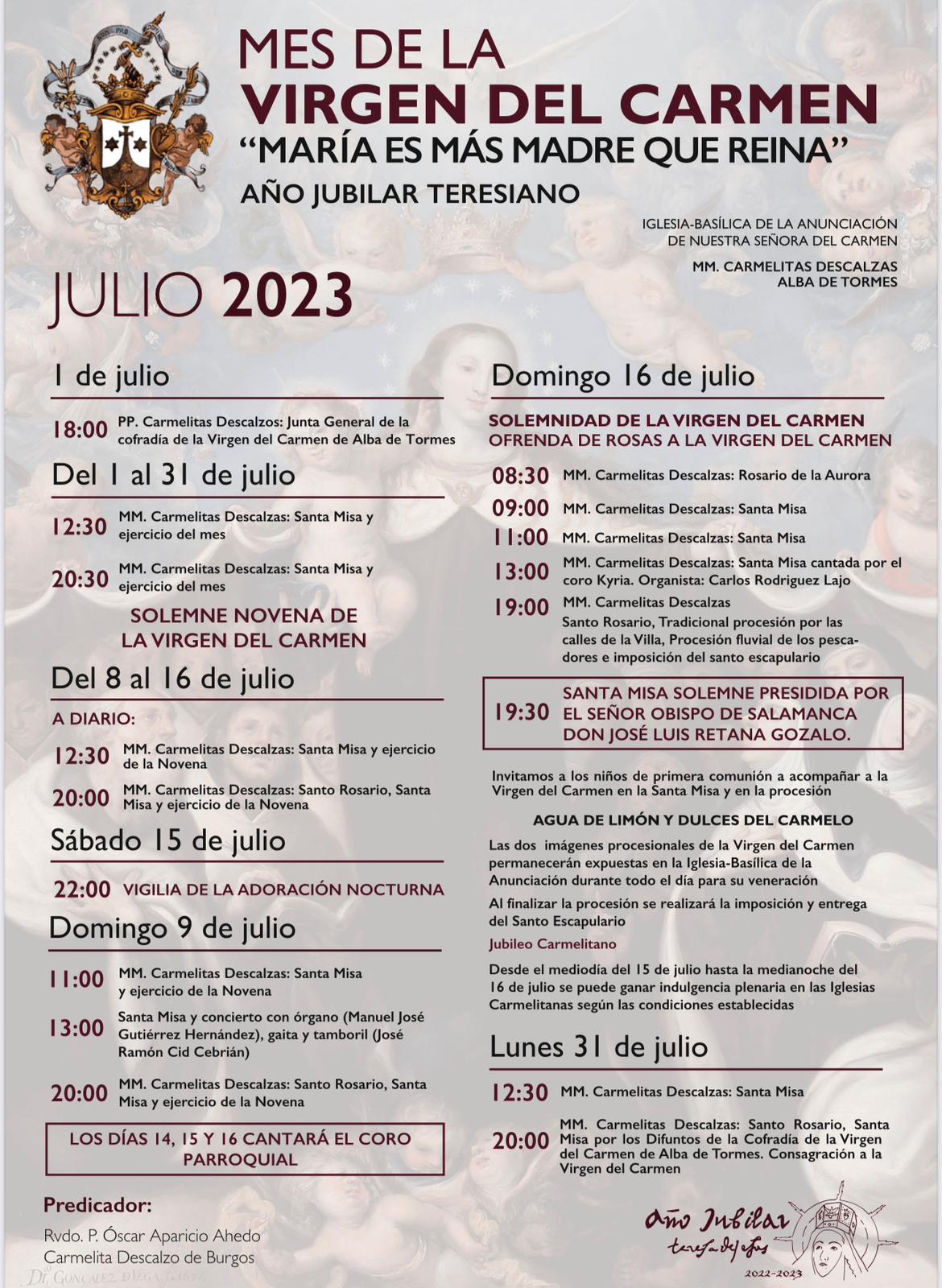 Por último, recordar que el día 31 de julio, a las 12:30 horas será la santa misa, y a las 20:00 horas, el rosario y la eucaristía por los difuntos de la Cofradía de la Virgen del Carmen de Alba de Tormes.
