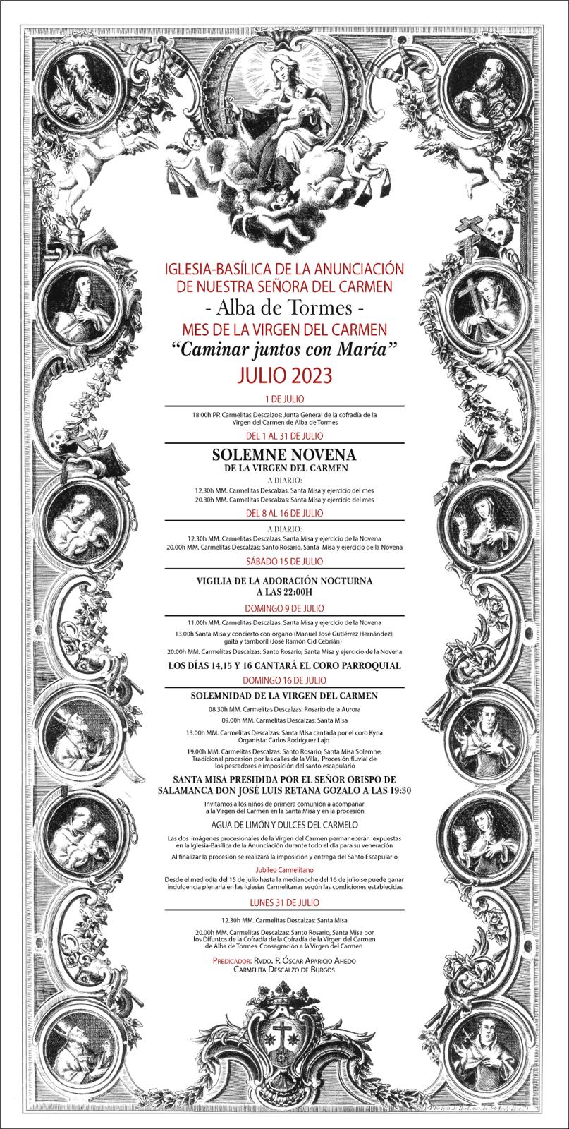 La iglesia basílica de La Anunciación de Alba de Tormes acoge el “Mes de la Virgen del Carmen”, bajo el lema: “María es más grande que reina”, enmarcado en esta ocasión en el Año Jubilar Teresiano. Del 1 al 31 de julio tendrá lugar la santa misa y el ejercicio del mes a las 12:30 y a las 20:30 horas.