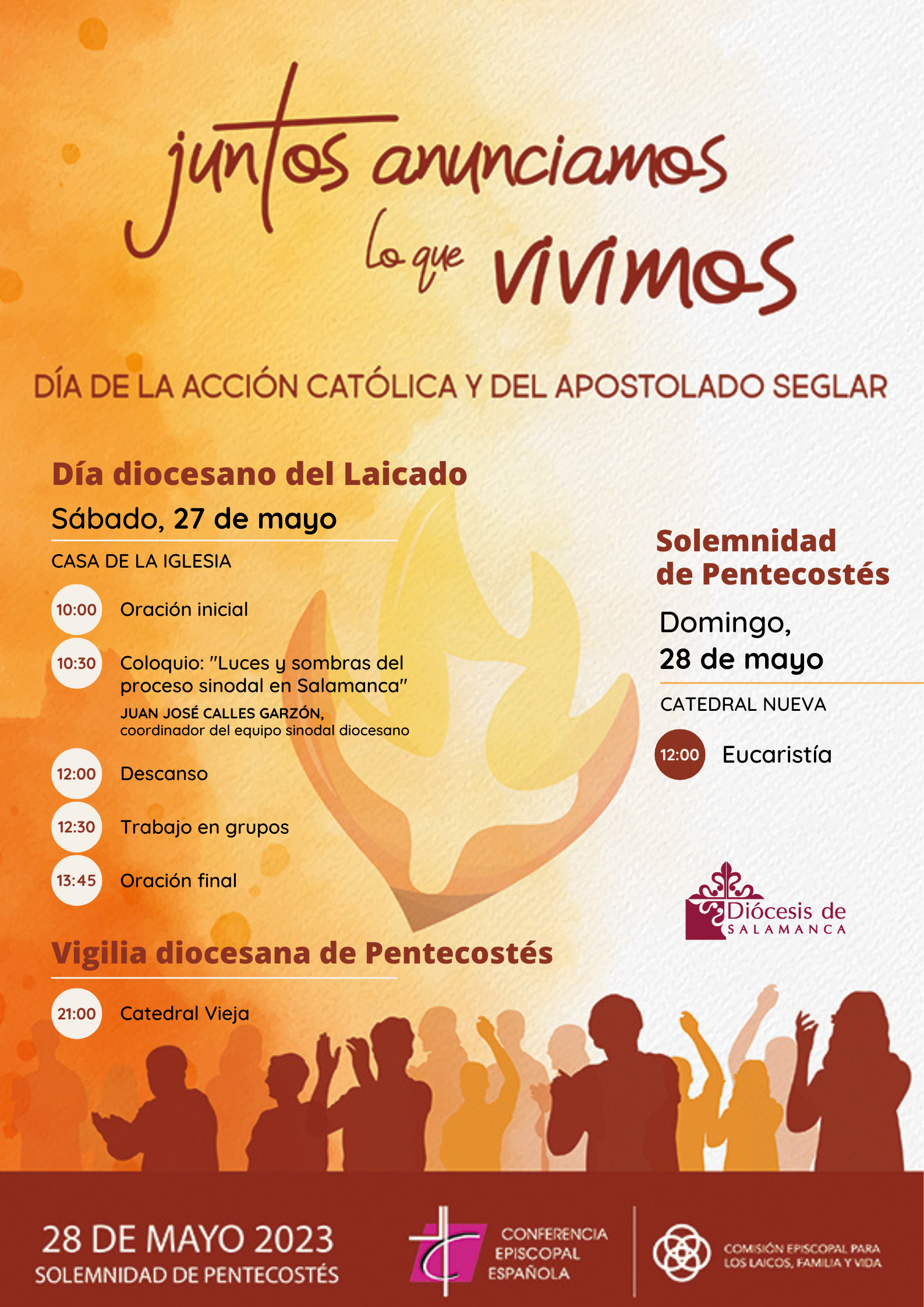 Bajo el lema: “Juntos anunciamos lo que vivimos”, la Delegación diocesana de Apostolado Laical convoca a los laicos, asociaciones y movimientos laicales de la Diócesis de Salamanca a secundar las actividades previstas para celebrar la Jornada de la Acción Católica y el Apostolado Seglar, los días 27 y 28 de mayo, en la solemnidad de Pentecostés.