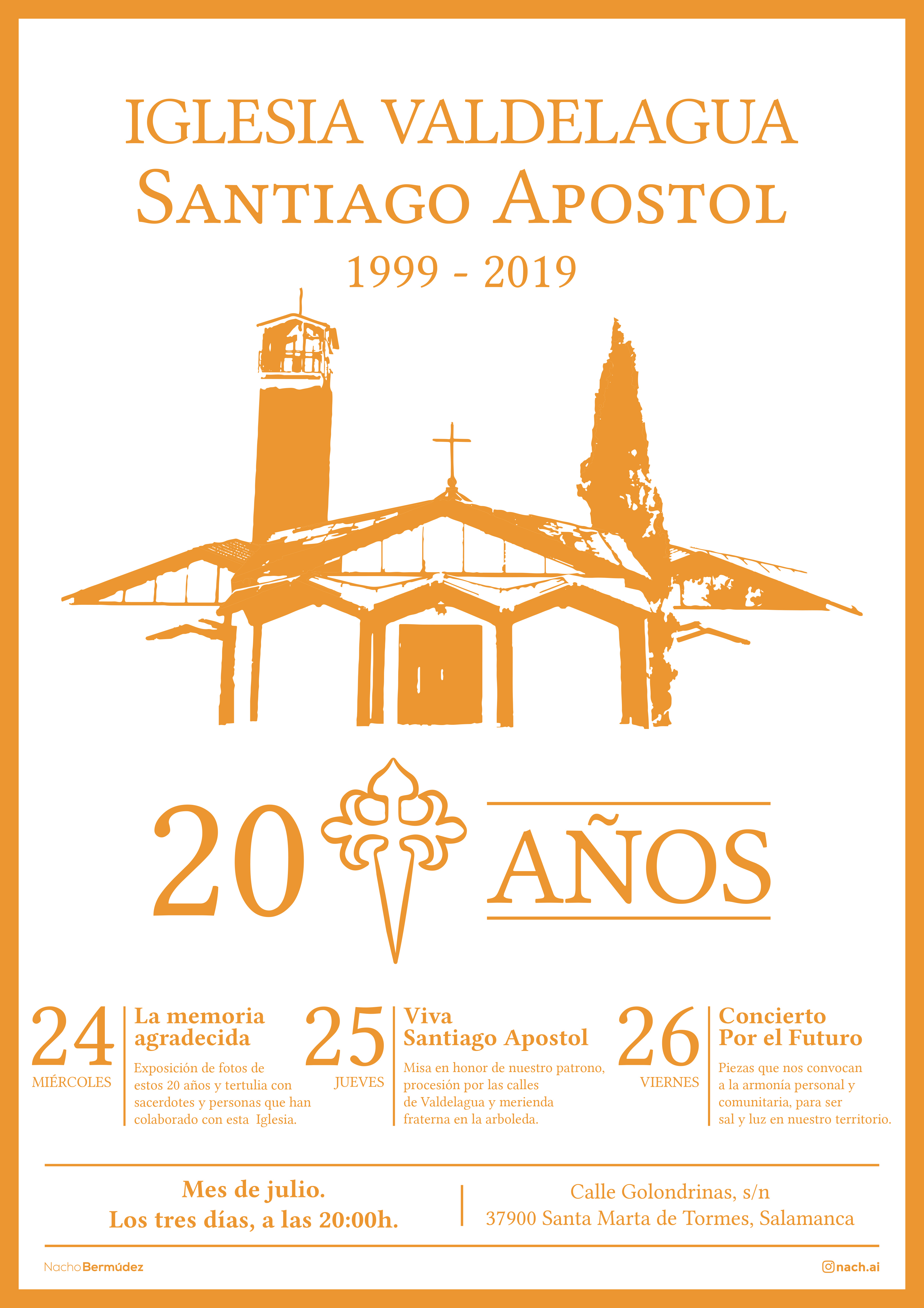 La iglesia de Santiago Apóstol de la urbanización Valdelagua celebra este jueves, 25 de julio, su 20 aniversario. En Salamanca es el único templo que ha sido costeado por sus propios vecinos a través de diferentes cuotas mensuales y donaciones, con un adelanto del coste del proyecto por parte de la Diócesis de Salamanca.