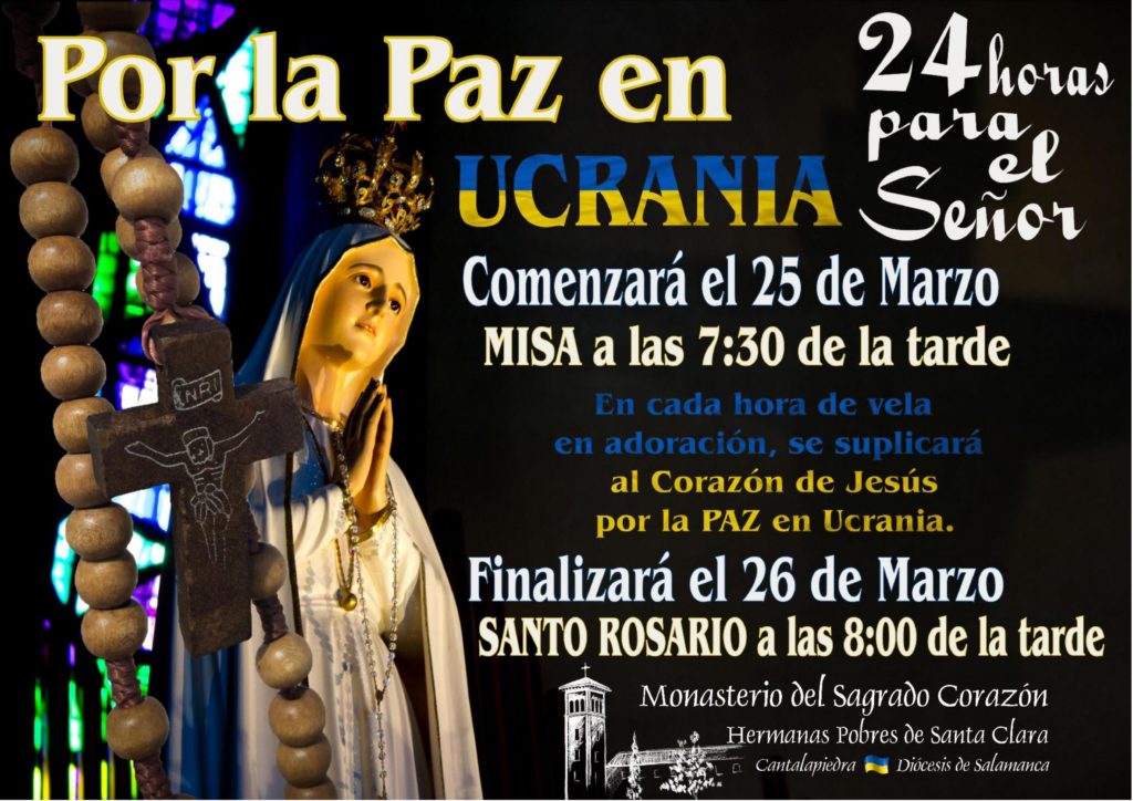 Las religiosas Clarisas del Monasterio del Sagrado Corazón de Jesús, en Cantalapiedra, también se unen a la celebración de las 24 horas para el Señor, con una intención de oración especial por la paz en Ucrania. En cada hora de vela en adoración se suplicará al Corazón de Jesús por la paz en Ucrania. Además, el 25 de marzo celebrarán una eucaristía a las 19:30 horas y al día siguiente el rezo del Santo Rosario, a las 20:00 horas, con el que que concluirán las “24 horas para el Señor”.