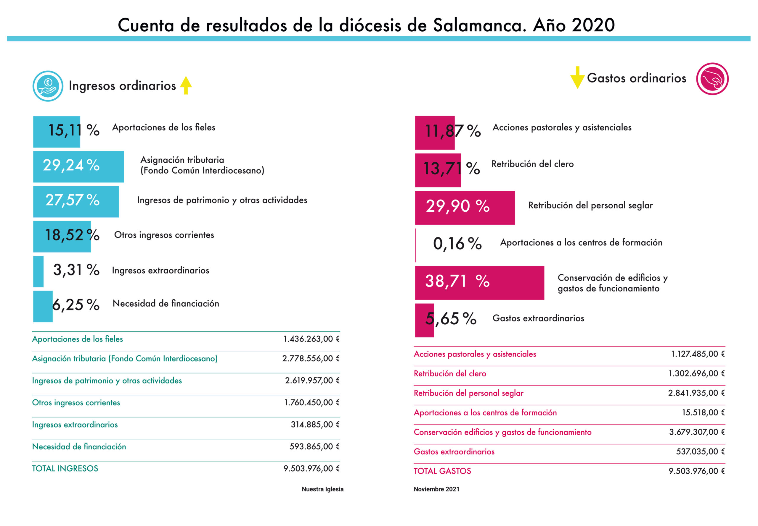 anterior. Dentro de las acciones pastorales y asistenciales, se han invertido más de 1,1 millones de euros, entre los que destacan los 300.000 euros destinados a Cáritas para el fondo social para los afectados por la pandemia, de los 500.000 aprobados, y que se dividen en varias partidas; así como los 51.000 euros que donó el clero diocesano para la misma finalidad; o la conservación de edificios y gastos de funcionamiento, con 3,6 millones, así como la retribución del clero y el personal seglar, entre otros.