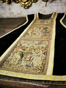 La Catedral de Salamanca guarda en sus cajones indumentaria litúrgica de los siglos XVI y XVIII. De la primera época tan solo se guarda una casulla, de terciopelo negro, aunque puede que ese no fuese su color original. Así lo detalla Raúl Benito, historiador del arte y responsable de catalogar toda esta vestimenta durante el último año.