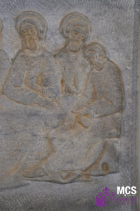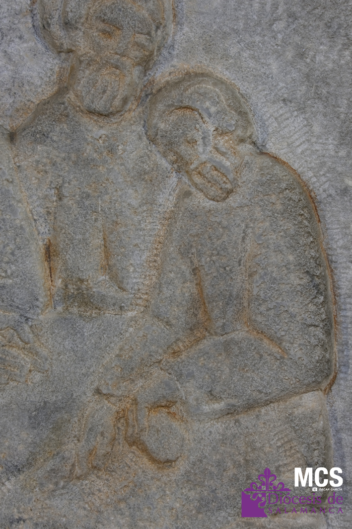 El volumen del relieve es “muy fino”, como apunta Tomás Gil, y está realizado en mármol blanco. “Para resaltar el volumen, Núñez Solé utiliza también las patinas, que es pintar en color ocre las partes de la cabeza, de las manos y de los cuerpos, de los apóstoles, incluso, de los dones que hay sobre la mesa de la eucaristía, los alimentos que hay colocados encima”.