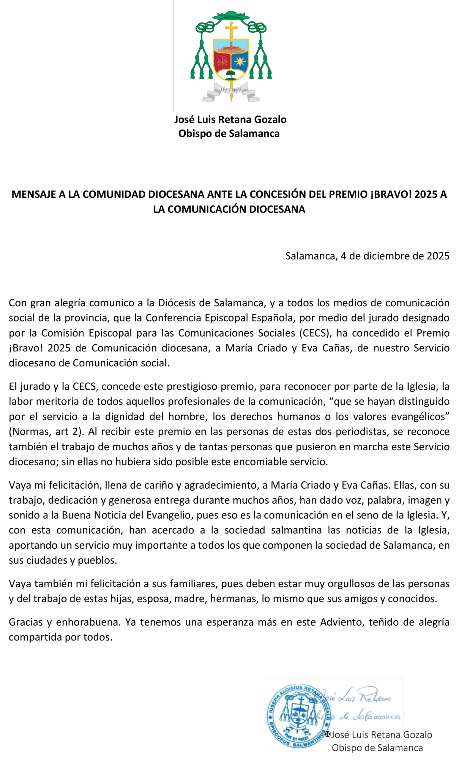 Tras conocerse el fallo, el obispo de Salamanca, Mons. José Luis Retana, ha expresado públicamente su alegría por este reconocimiento, que considera extensivo a toda la labor comunicativa que la diócesis ha desarrollado a lo largo de los años.