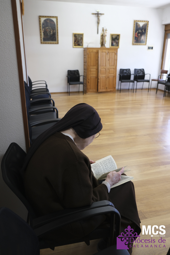El día a día en el monasterio de San José de Cabrerizos comienza a las siete de la mañana, cuando se levanta las más jóvenes y se hacen cargo de las mayores. Entre las celdas, seis están destinadas a las hermanas asistidas. La media de edad se sitúa entre los 70 y 80 años, y cuentan con una religiosa de 98. A lo que más tiempo dedican, como ellas mismas admiten, es a la oración, que completan con la eucaristía. Tampoco faltan los oficios, de la propia casa, como la limpieza o la cocina, y el remunerado, como especialistas en la restauración de libros antiguos o la encuadernación.