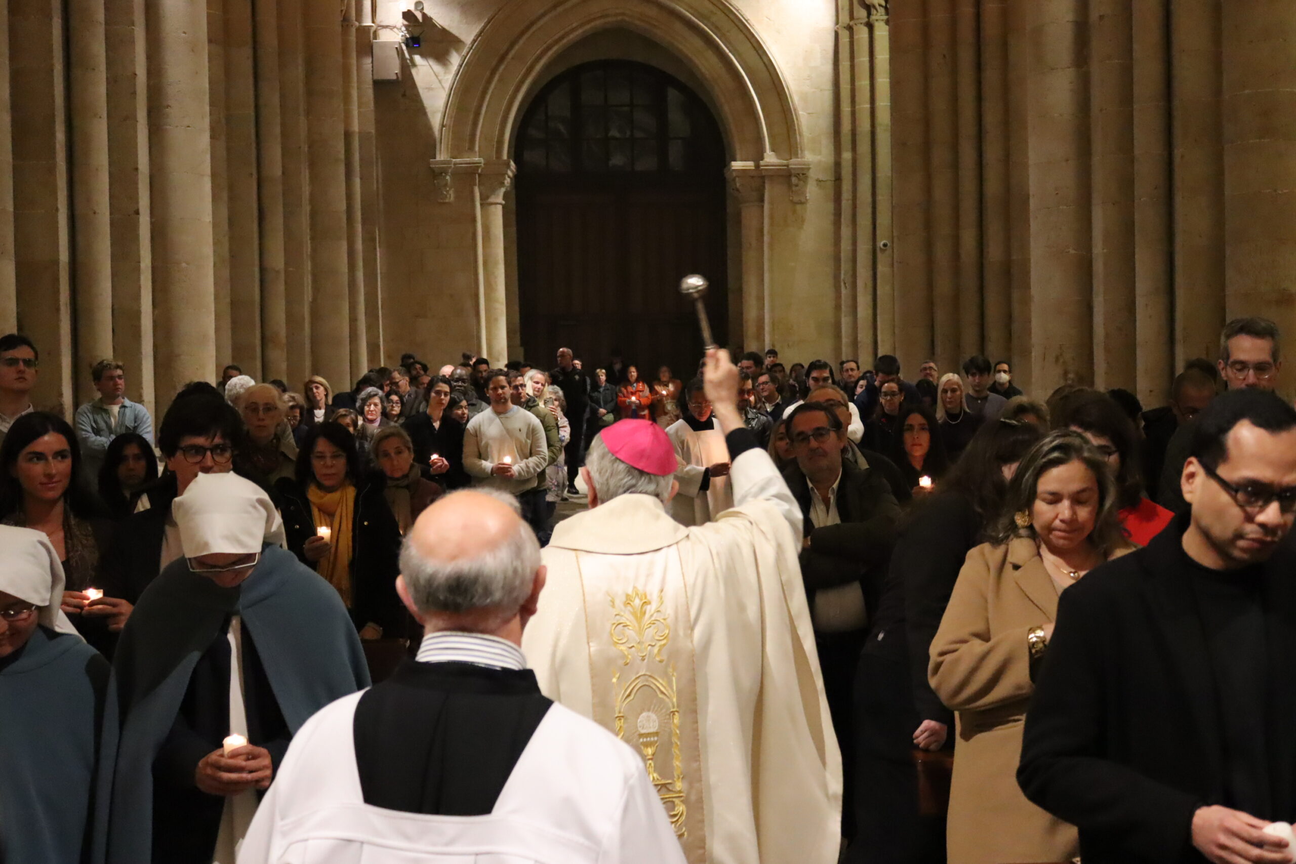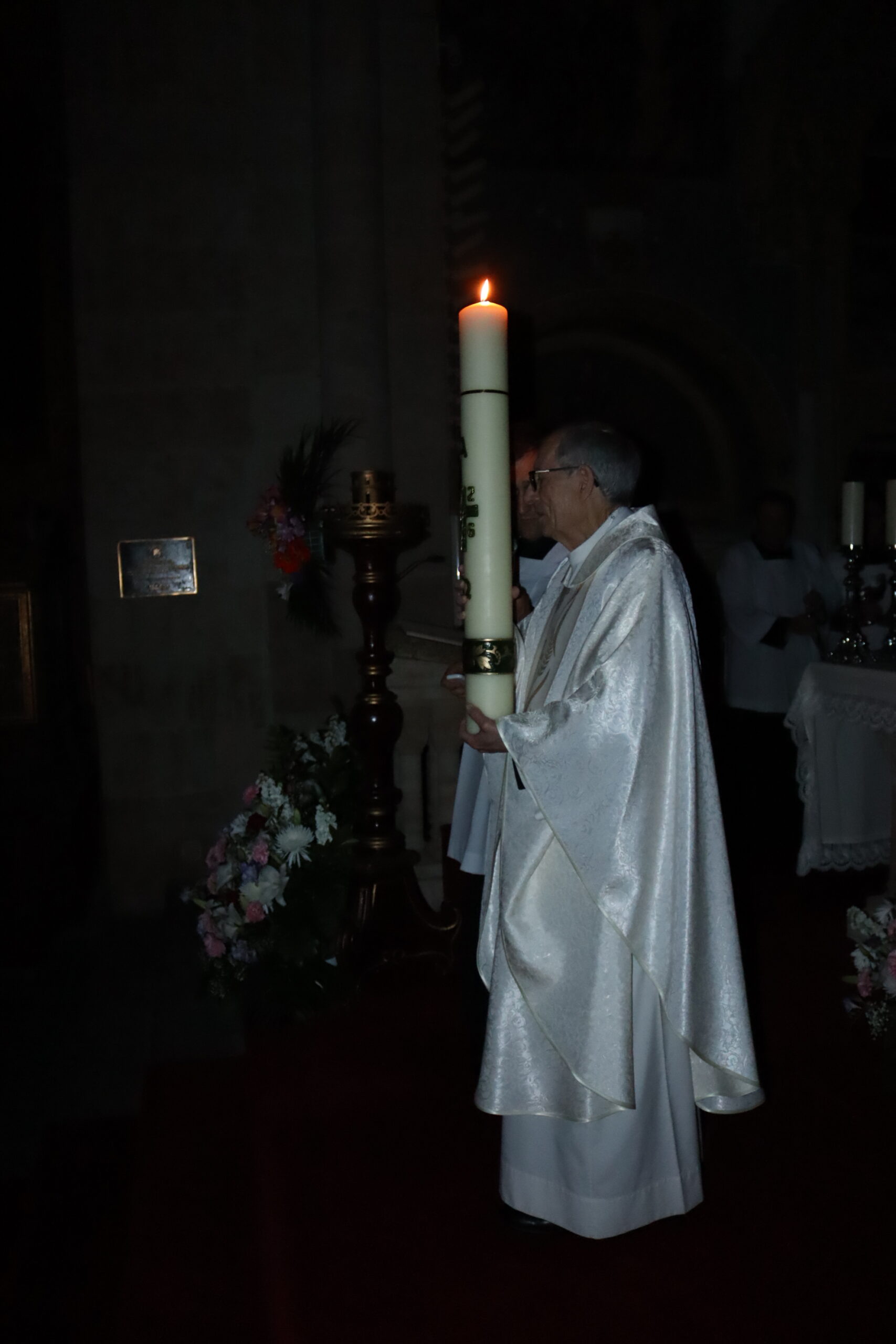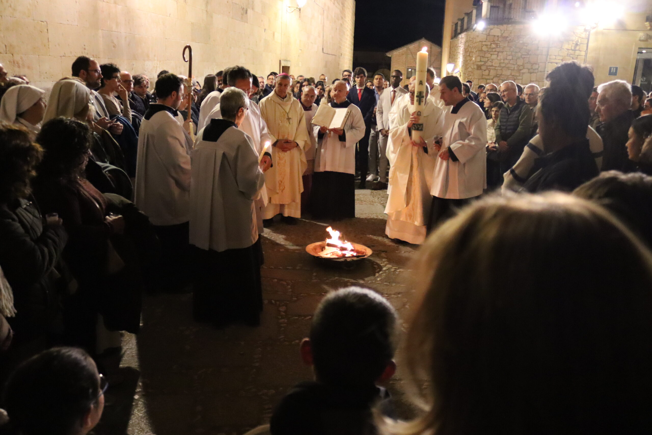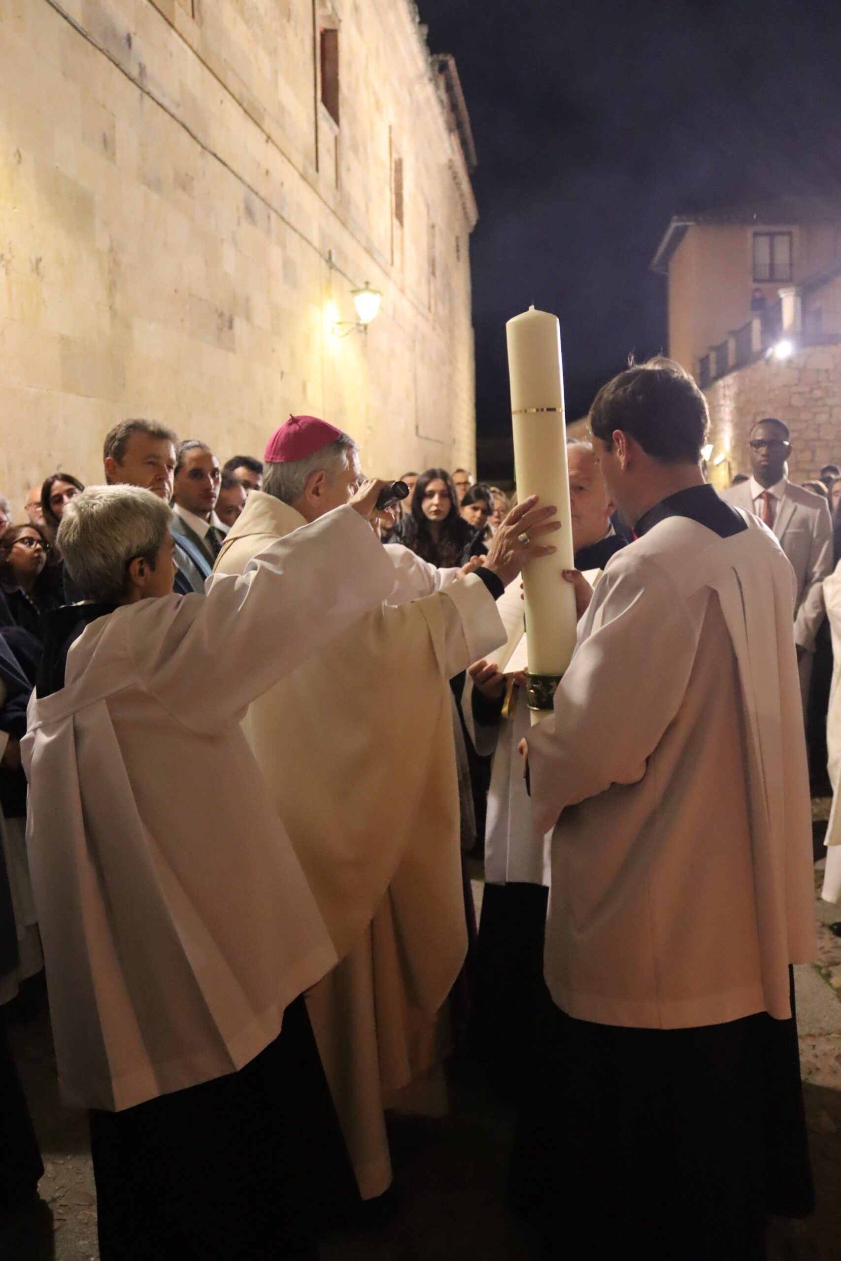 La vigilia comenzó en el exterior del templo, en la puerta de Santa Lucía, con la liturgia de la luz o lucernario. Tras la bendición del fuego nuevo y el encendido del cirio pascual —símbolo de Cristo, luz del mundo—, los fieles accedieron a la catedral en la oscuridad, iluminando la nave con sus velas encendidas, signo de la luz que vence a las tinieblas.