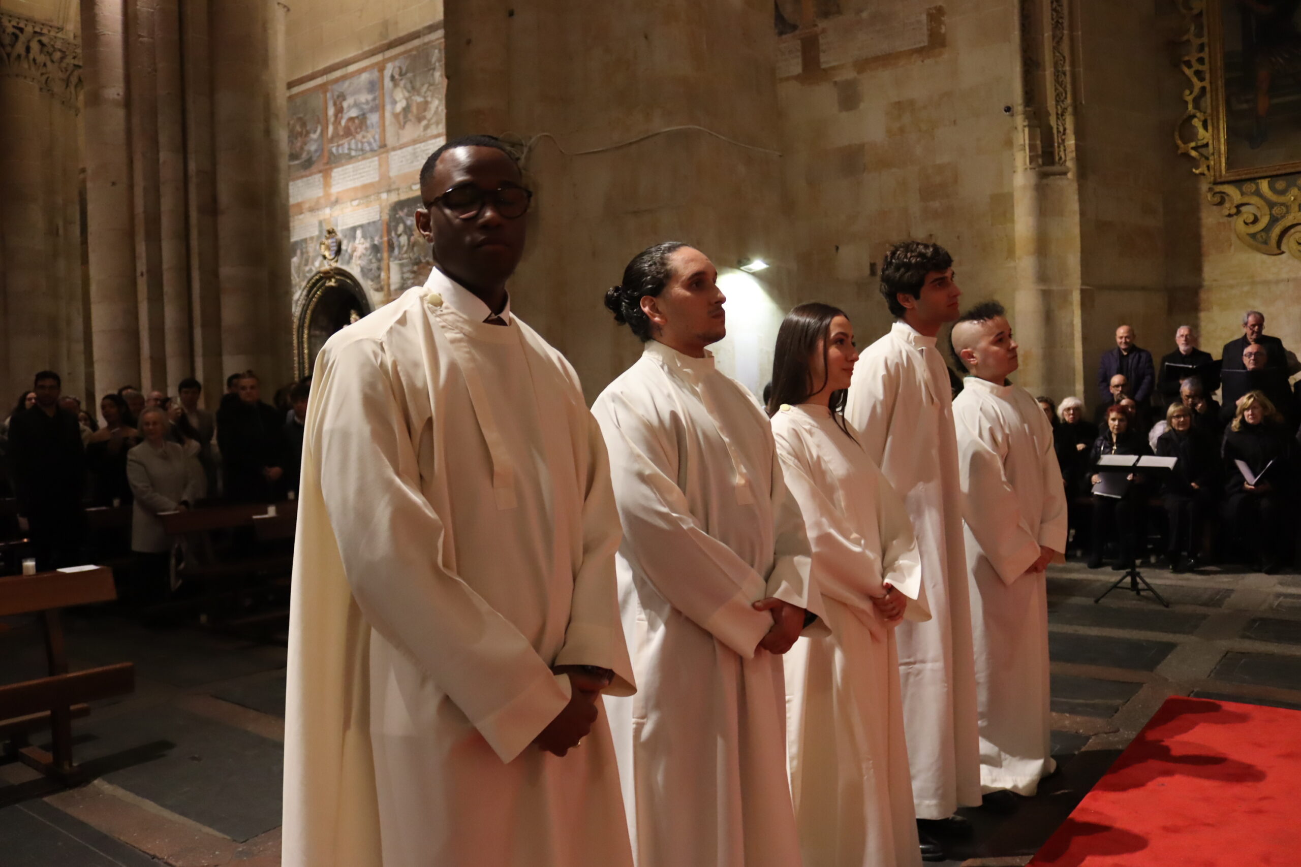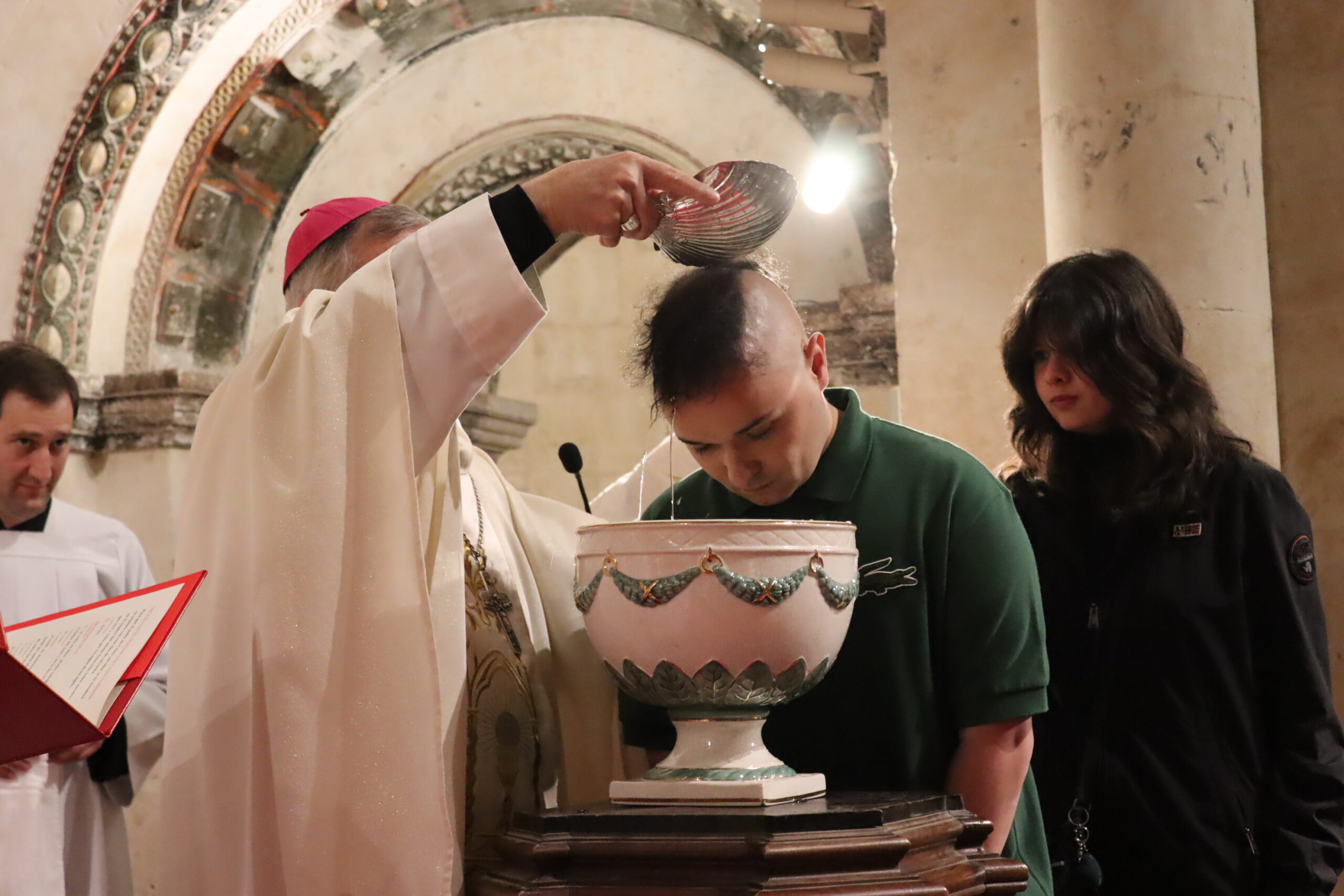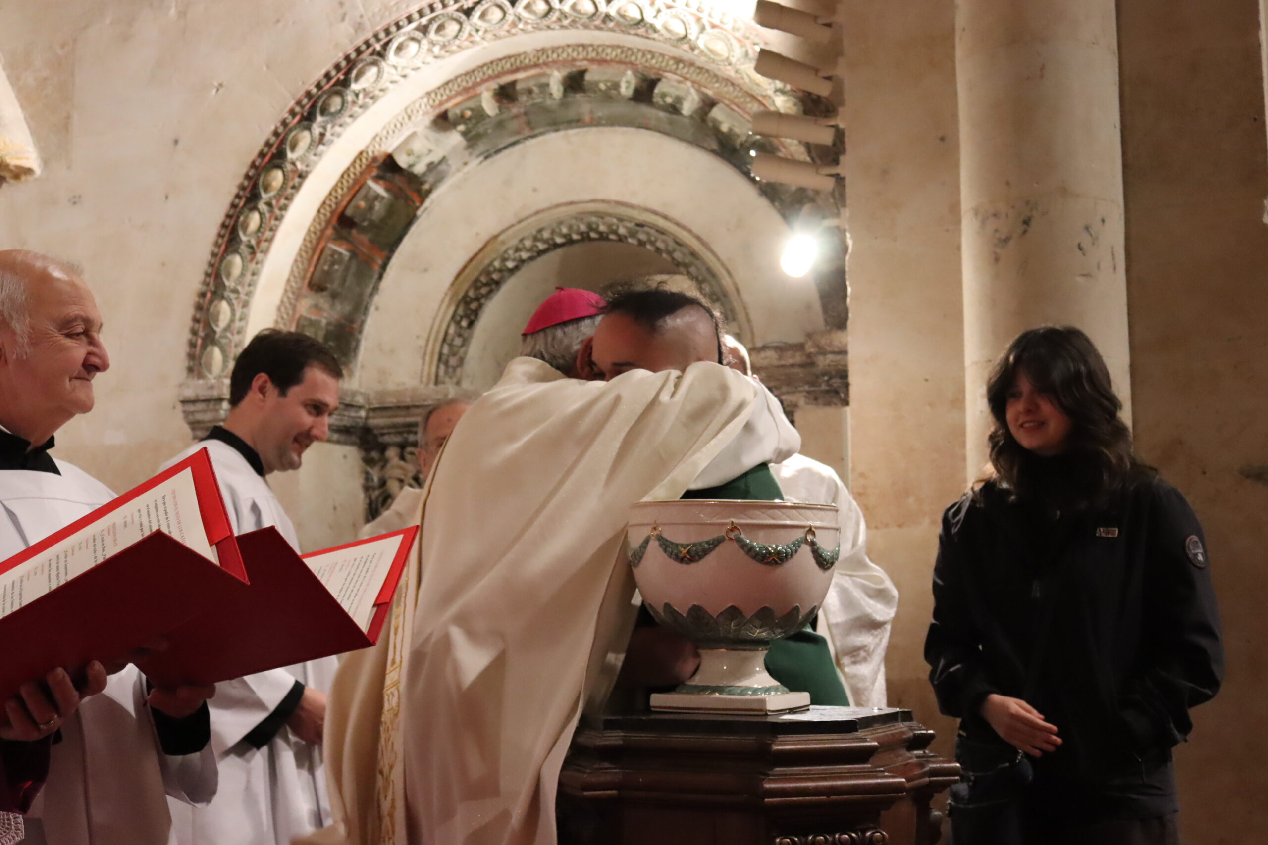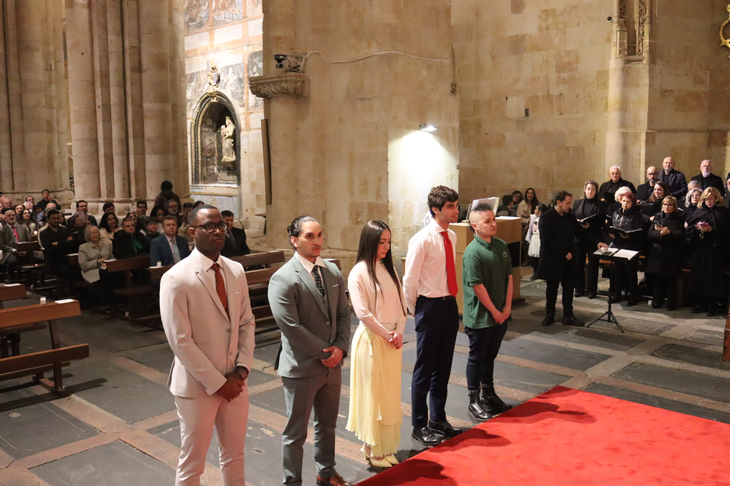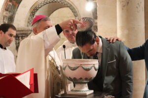 Tras la homilía comenzó la liturgia bautismal. Fue entonces cuando los cinco catecúmenos —Axel, Alfonso, Paula, Christian Antonio y Juan Carlos— fueron presentados a la asamblea por el delegado diocesano de Pastoral Universitaria, Ricardo de Luis Carballada y, tras renunciar al mal y profesar su fe, fueron ungidos con el óleo de los catecúmenos y el santo Crisma, y recibieron el sacramento del Bautismo. Nada más ser bautizados, el obispo abrazó a cada uno de ellos y les dijo: “Bienvenido a casa”.
