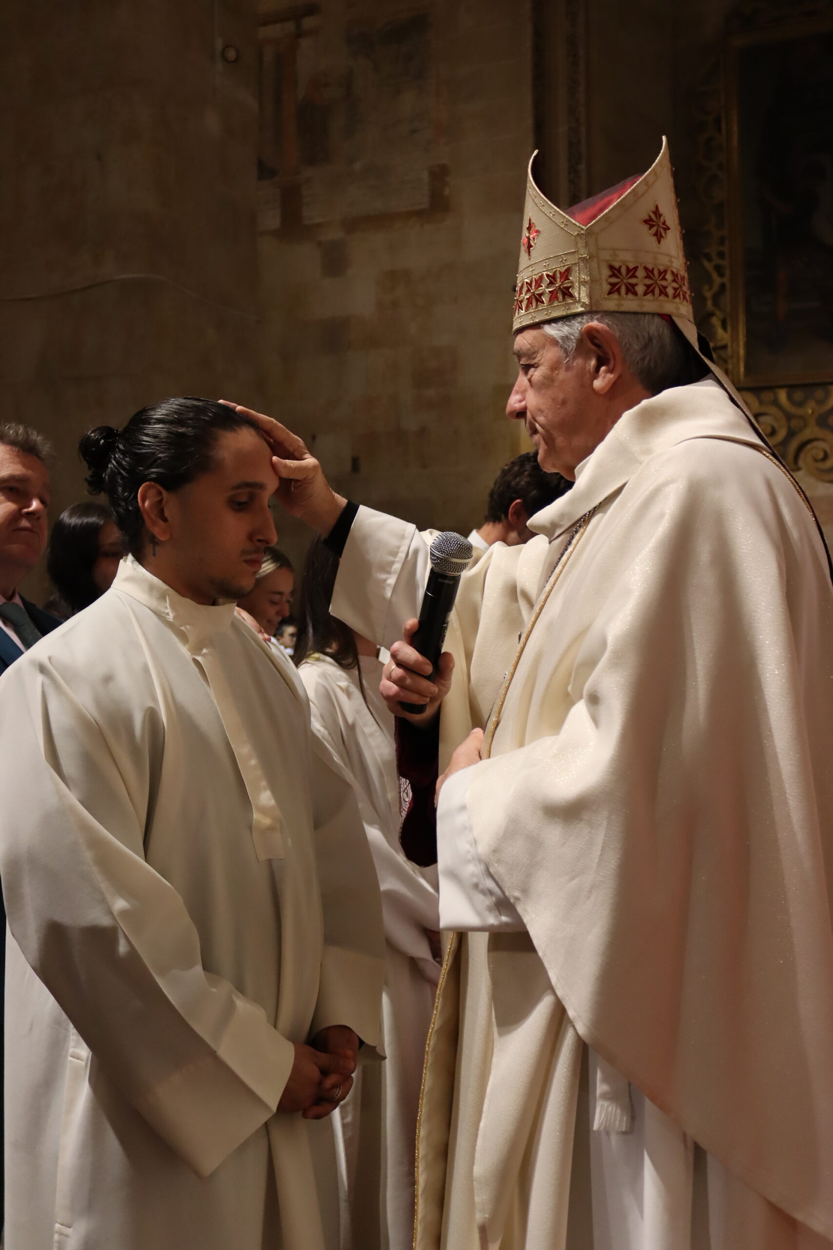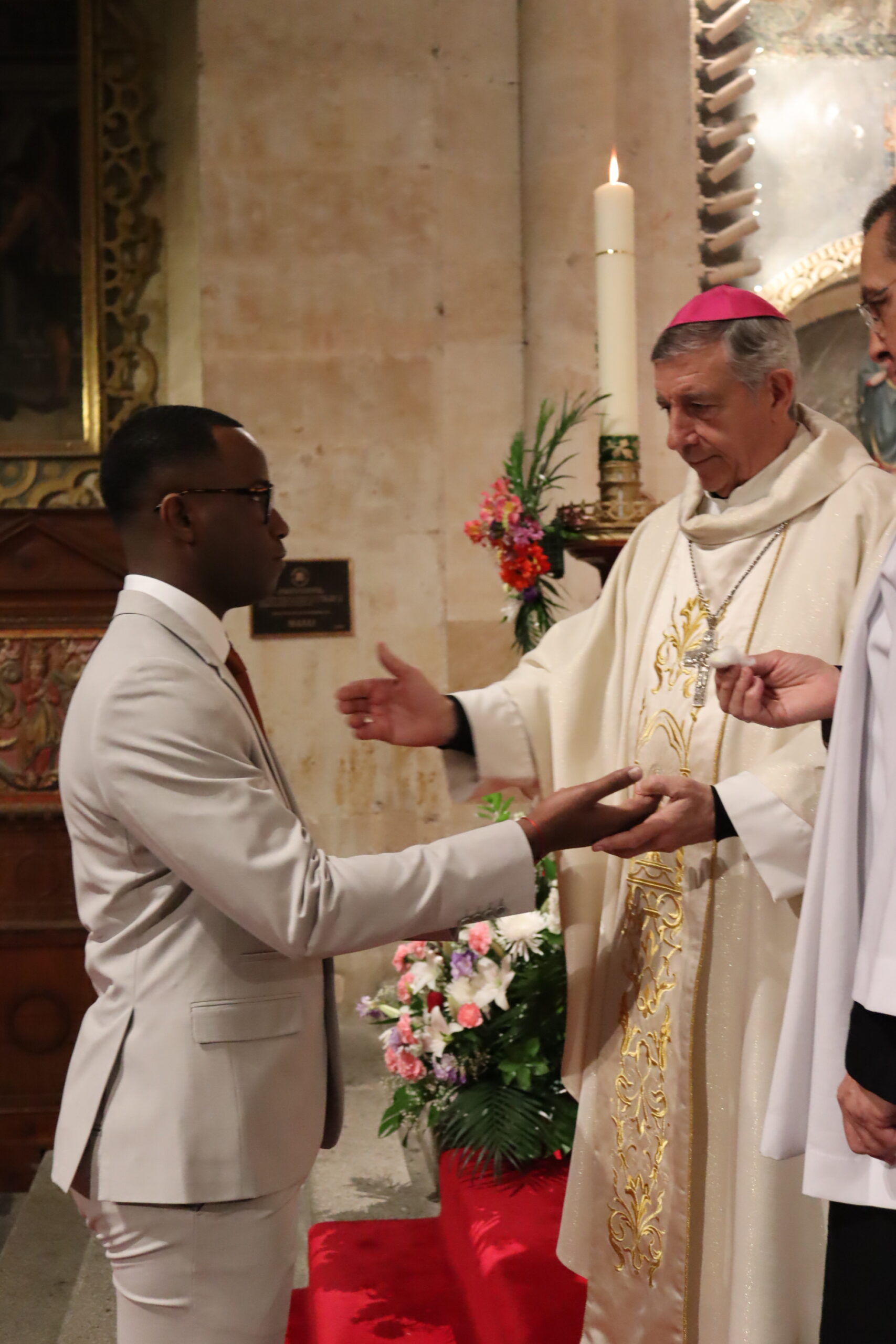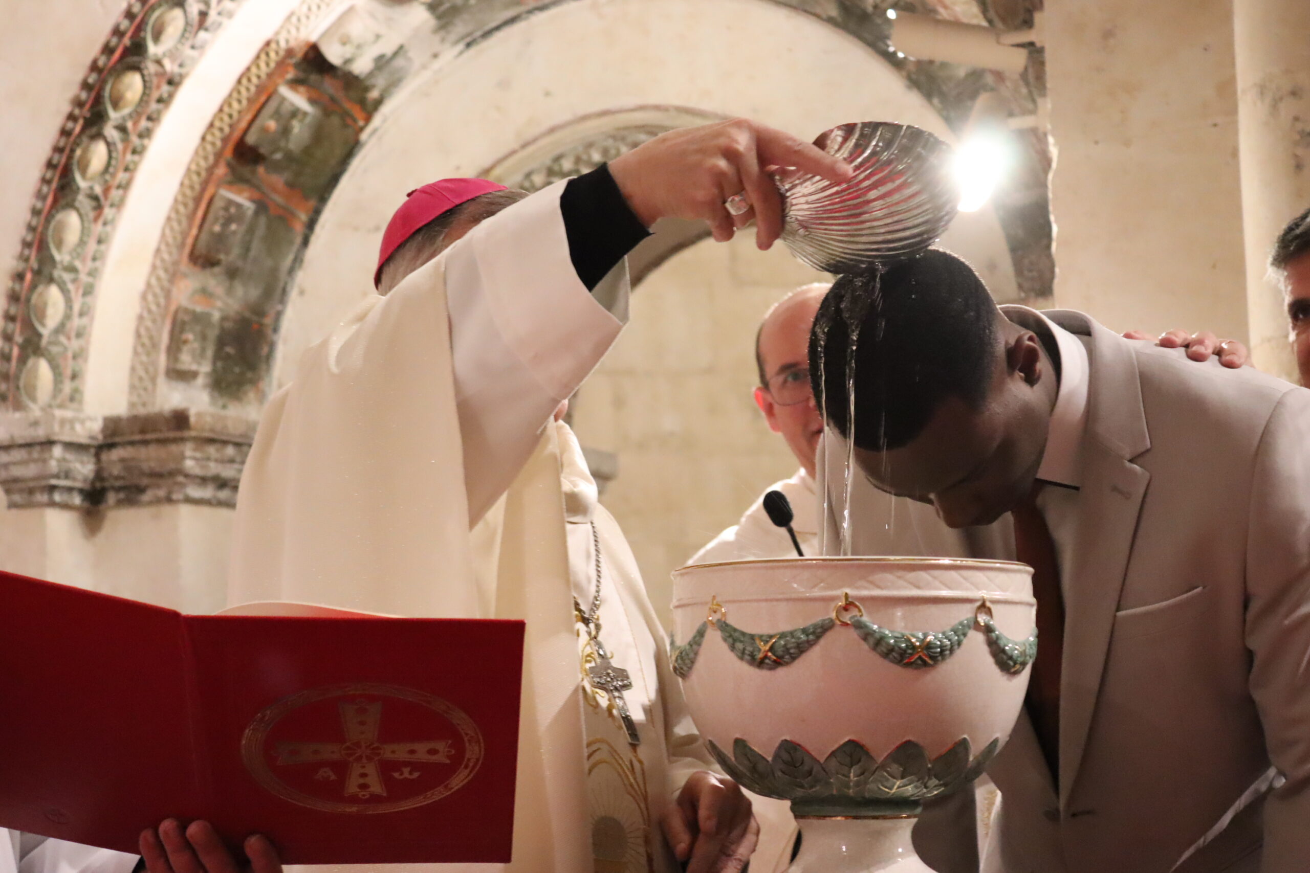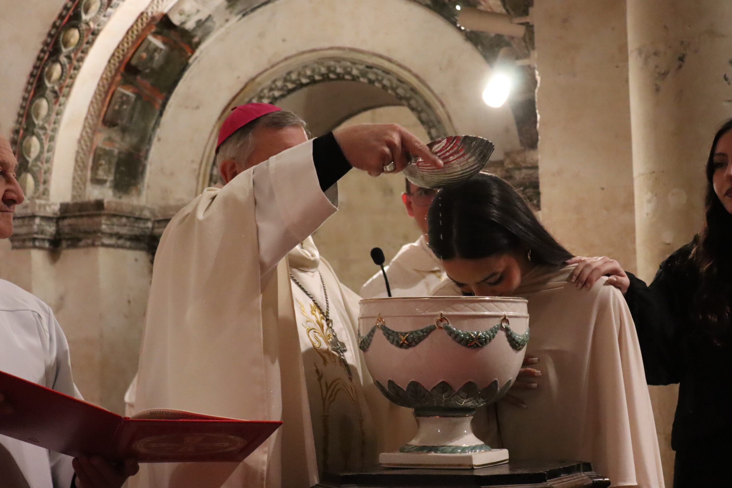 Tras la homilía comenzó la liturgia bautismal. Fue entonces cuando los cinco catecúmenos —Axel, Alfonso, Paula, Christian Antonio y Juan Carlos— fueron presentados a la asamblea por el delegado diocesano de Pastoral Universitaria, Ricardo de Luis Carballada y, tras renunciar al mal y profesar su fe, fueron ungidos con el óleo de los catecúmenos y el santo Crisma, y recibieron el sacramento del Bautismo. Nada más ser bautizados, el obispo abrazó a cada uno de ellos y les dijo: “Bienvenido a casa”.