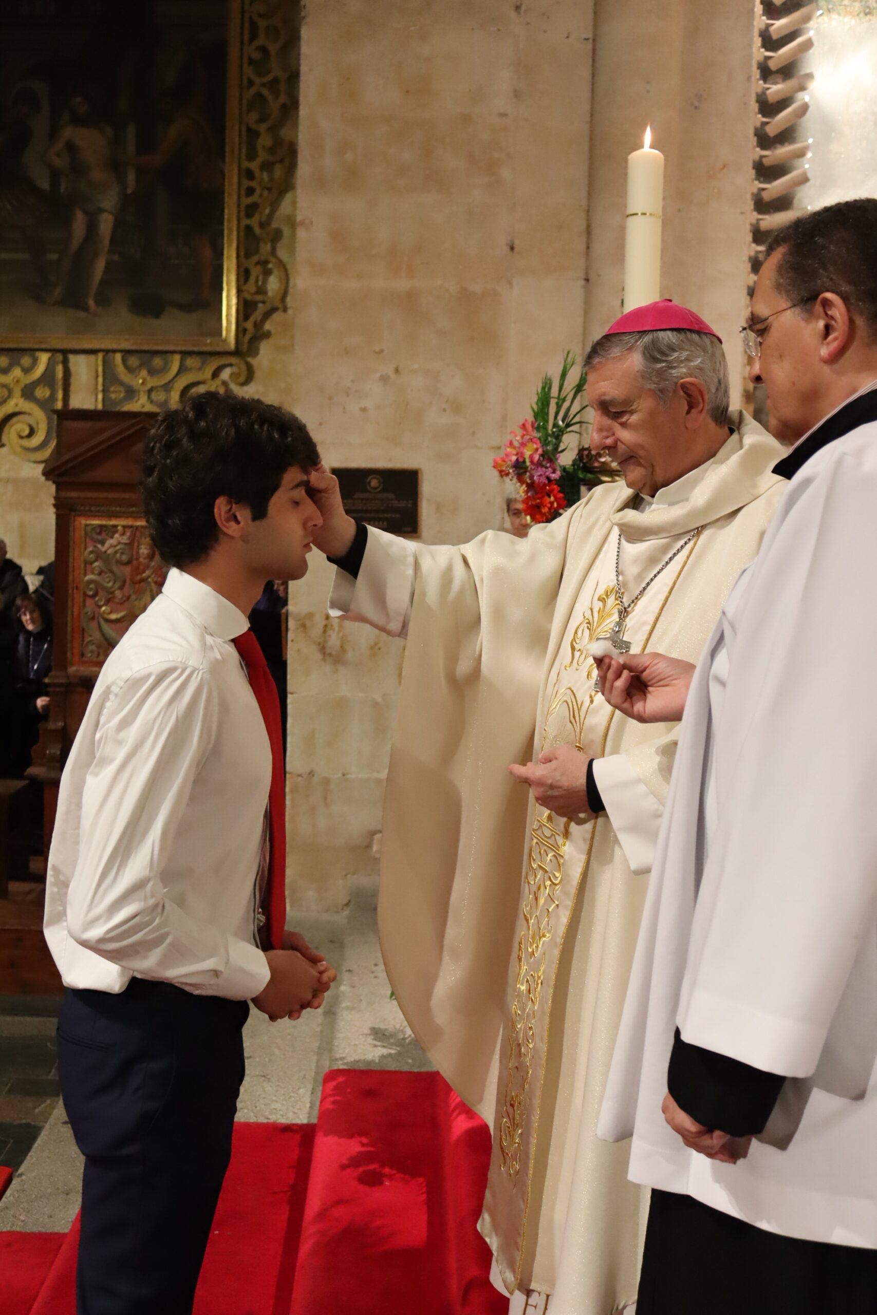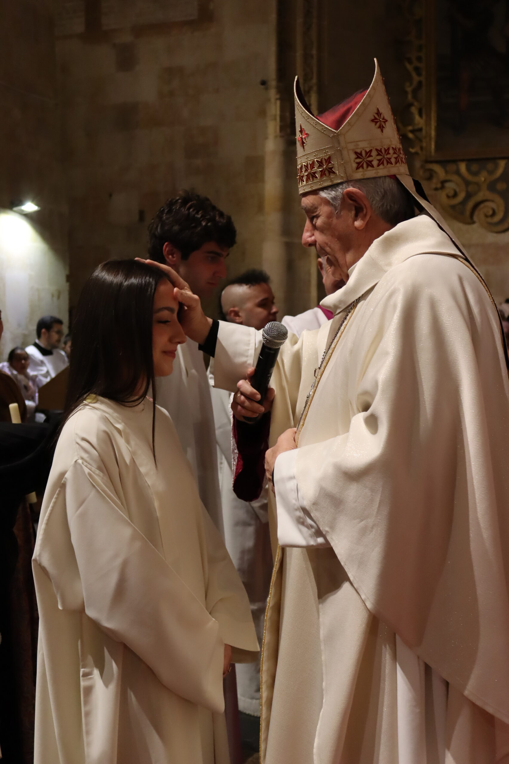 Posteriormente fueron revestidos con vestiduras blancas, signo de la vida nueva recibida y ungidos con el santo Crisma en la Confirmación. Durante este rito, el obispo recordó a todos el sentido del Bautismo: “Es como si Cristo te abrazara y te dijera: eres mío para siempre, te pase lo que te pase, yo voy a estar contigo hasta el fin del mundo”.