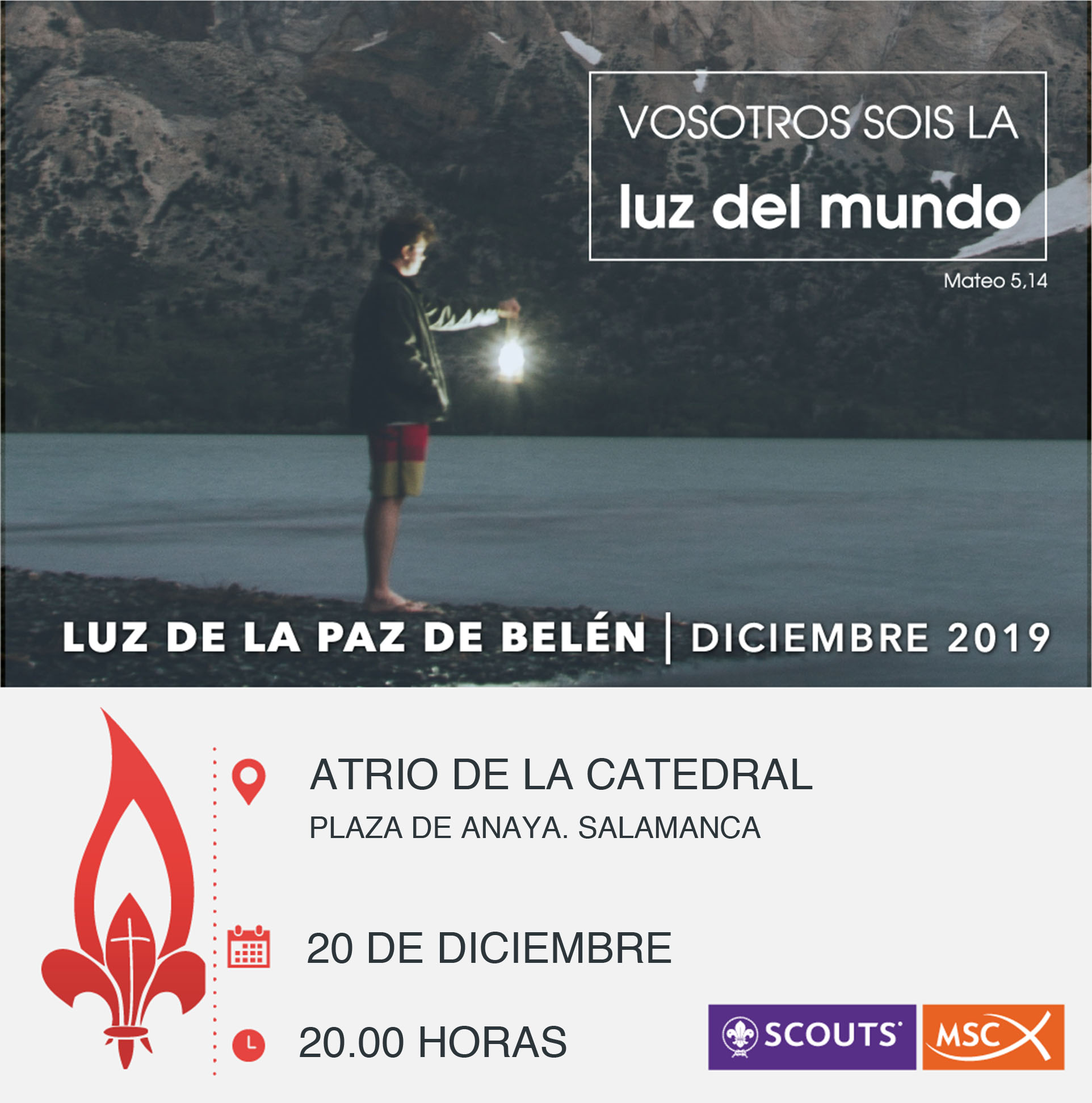 «Vosotros sois la luz del mundo» (Mateo 5,14) es el lema de la Luz de la Paz de Belén en este 2019. Esta iniciativa es una de las tradiciones más importantes del escultismo católico. Cada año, un scout austriaco viaja a Belén y recoge la llama de la Basílica de la Natividad, donde la tradición dice que nació Jesucristo. Esa llama viaja a Austria y desde Viena los scouts la distribuyen a todos los países con un mensaje de Paz, Amor y Esperanza.