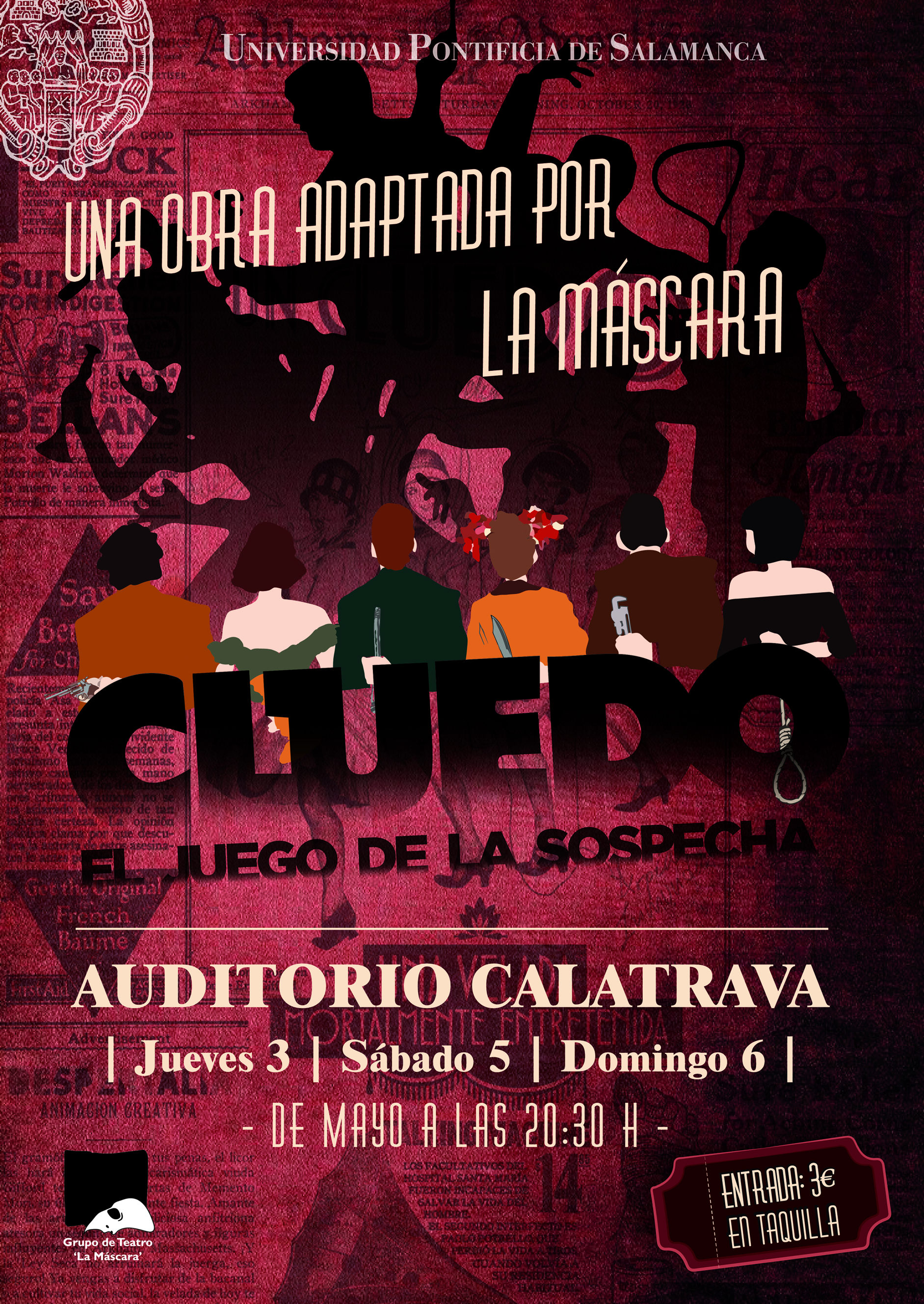 El grupo de teatro de la Universidad Pontificia de Salamanca La Máscara representa la obra ‘Cluedo. El juego de la sospecha’. La obra es una adaptación de la película, realizada por el grupo de teatro. La representación, en la que participarán 17 actores, está prevista los días 3, 5 y 6 de mayo, a las 20:30 h en el Auditorio Calatrava. El precio de la entrada es de 3 €.