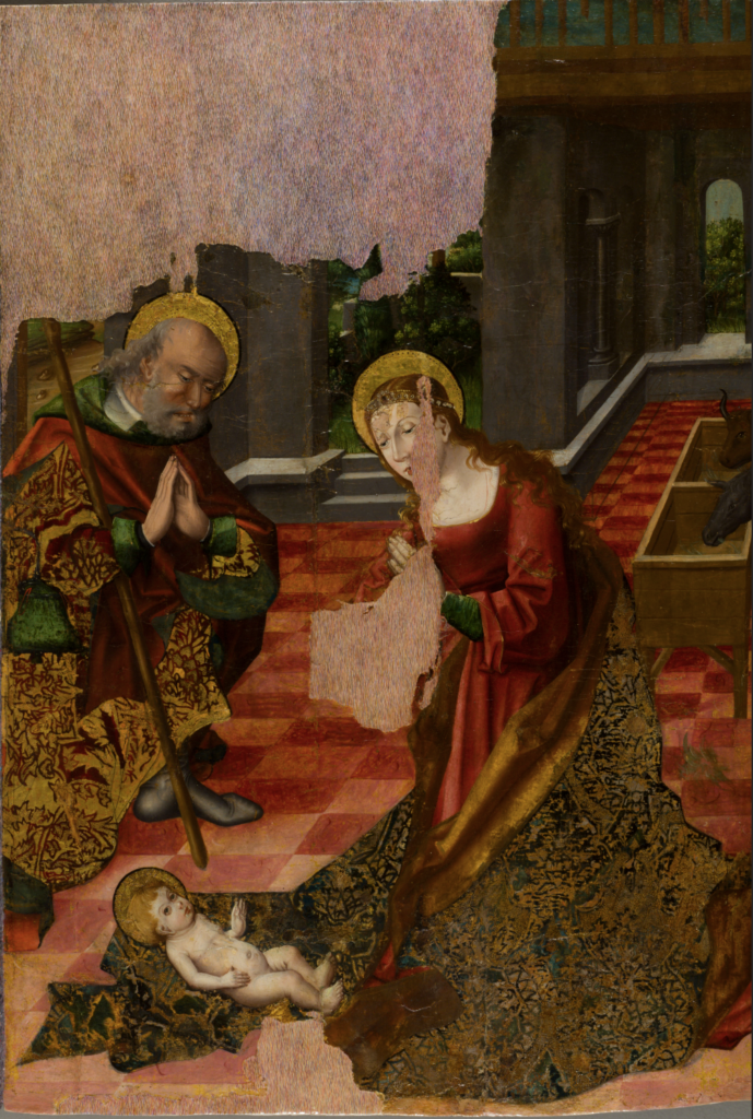 Tomás Gil menciona la perspectiva, “muy inclinada, a través de las baldosas, lo cual favorece esa sensación de que Jesús ha caído, ha descendido, que ha bajado desde el cielo”. Y en un segundo plano se coloca a San José, separado de la Virgen María por medio de un ángel, porque Jesús no es el hijo de José, sino el de María y de Dios.