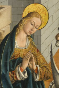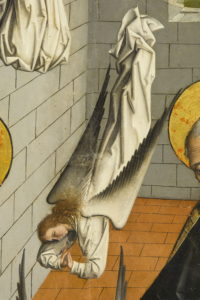 En la tabla de Fernando Gallego también toman protagonismo en el centro de la escena los ángeles, empezando por el de la Anunciación, “que se encuentra en la parte superior con el Gloria, el anuncio a los pastores, y después, se abre una secuencia de ángeles que abre como una especie de vía sacra por la que se ha extendido Cristo desde el cielo, y se ha hecho hombre para salvarnos“.