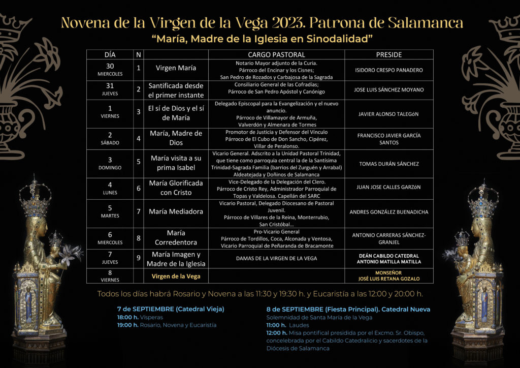En esta ocasión, la predicación de la novena a la Virgen de la Vega correrá cada día a cargo de integrantes del Tribunal diocesano, así como del nuevo equipo de gobierno de la Diócesis de Salamanca, como el vicario general, el provicario general y el equipo conformado junto al vicario de pastoral, entre otros, en la misa de las 20:00 horas.