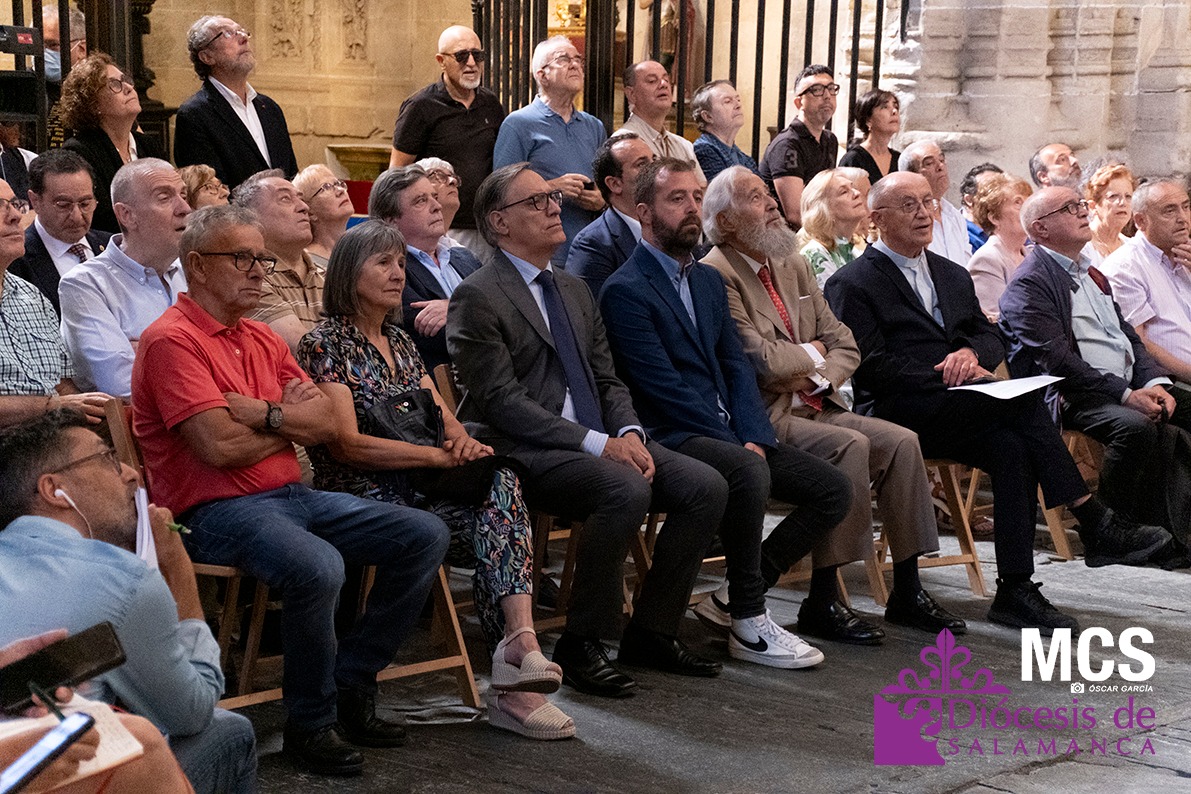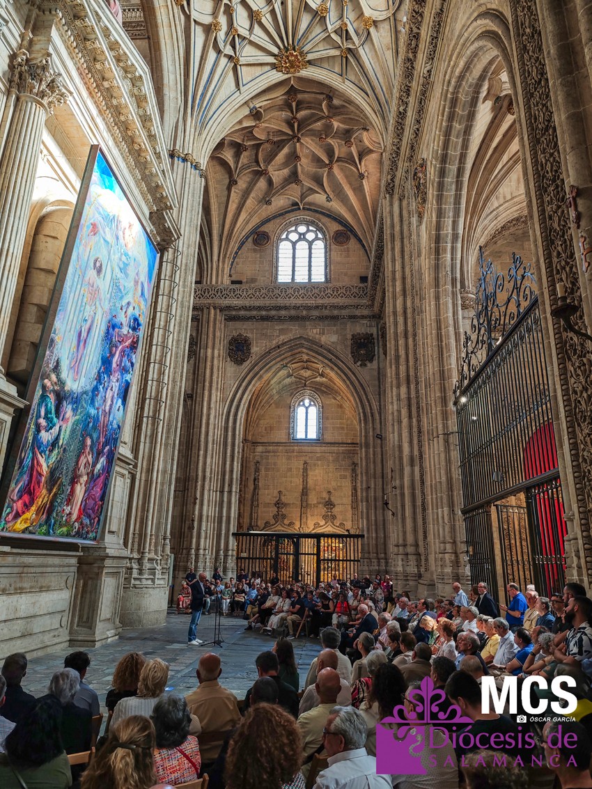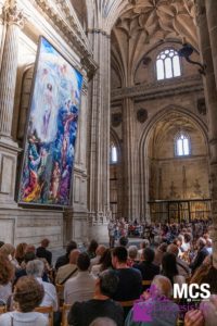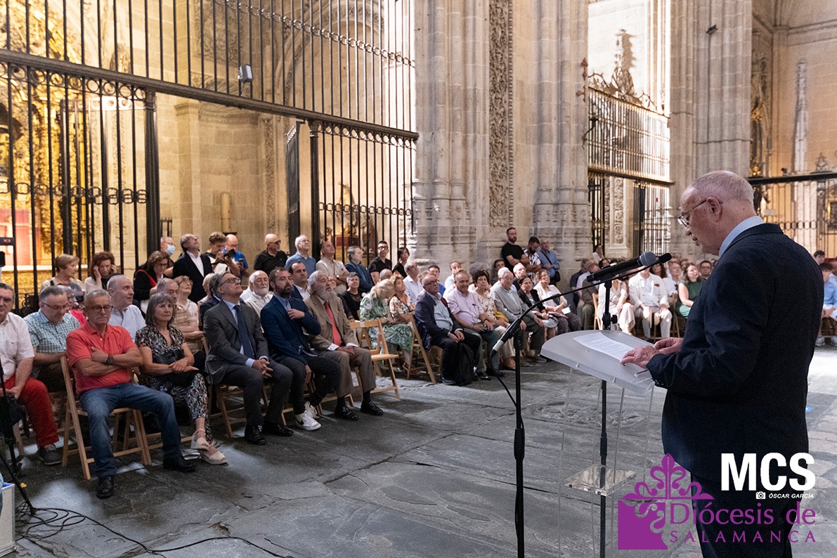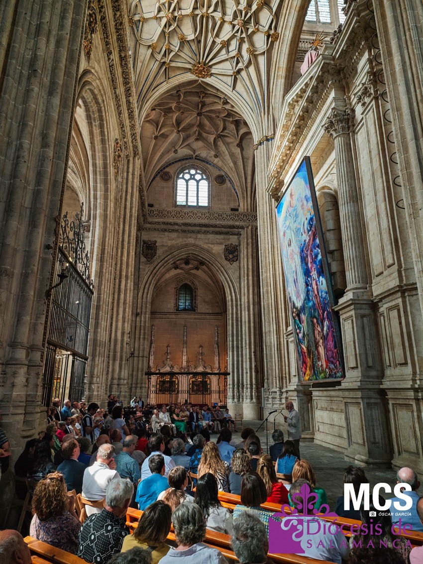 El acto de inauguración de esta “fiesta de gratitud”, como la calificó el deán del cabildo, Antonio Matilla, tuvo lugar el pasado 16 de julio en el trasaltar, donde el artista estuvo arropado por su familia, amigos y autoridades eclesiásticas y civiles. En su intervención, Matilla recordó a Daniel Sánchez, quien “se atrevió a soñar con un diálogo entre nuestra Catedral y el arte religioso contemporáneo“, y agradeció a su familia “por financiar este sueño”. El deán también expresó su aprecio a Florencio Maíllo, por abordar “con tanta pasión y maestría la realización de esta obra magnífica” y por plasmar en ella “tu alma creyente”.
