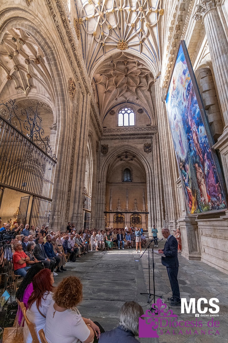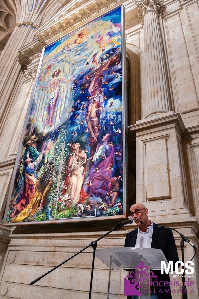 Visiblemente emocionado, el artista tomó la palabra para agradecer a todos los presentes por acompañarle “en este momento único” y por el apoyo recibido durante todo el proceso de creación. Y extendió un agradecimiento especial al Cabildo y a la familia de Daniel Sánchez, que han cumplido el deseo de “ver instalada la obra que él ofreció a la Catedral; a los modelos que posaron: Jaime Royo (El Creador), Isabel Rodríguez (Magdalena), José Tabernero (San Juan), María Guerras (Virgen), Jesús Martín (Jesús); así como a sus “ángeles de la guarda” en este proyecto, Antonio Cea y José Manuel Castaño, a quienes está dedicada la obra, y al director del Servicio diocesano de Patrimonio artístico, Tomás Gil, su “ángel de la guarda plástico”. Éste ofreció al artista “una ayuda esencial” en un momento de inseguridad en el que “la pintura no se desprendía de su carácter decorativo, académico y estético”. “Me dijo: ‘Sé tú'”. Fue entonces cuando la obra encontró su sentido como arte sacro devocional, incorporando a “El Pensador” en el epicentro de la pintura, dando sentido al tema: “El pensamiento ante el misterio de la Creación, Redención y Resurrección”.