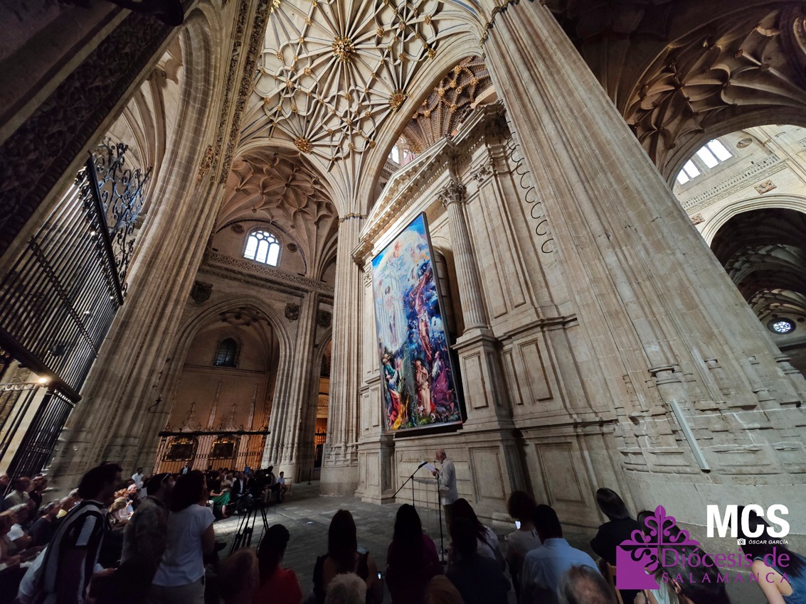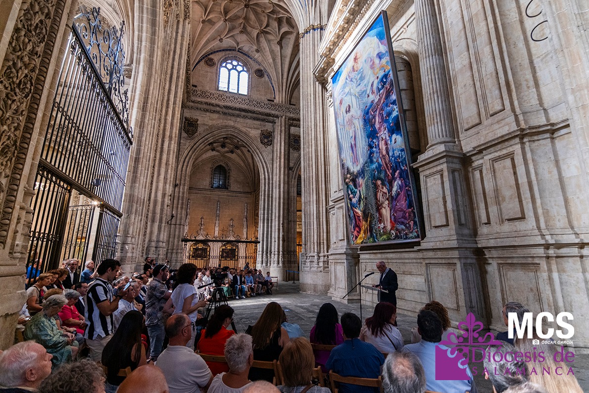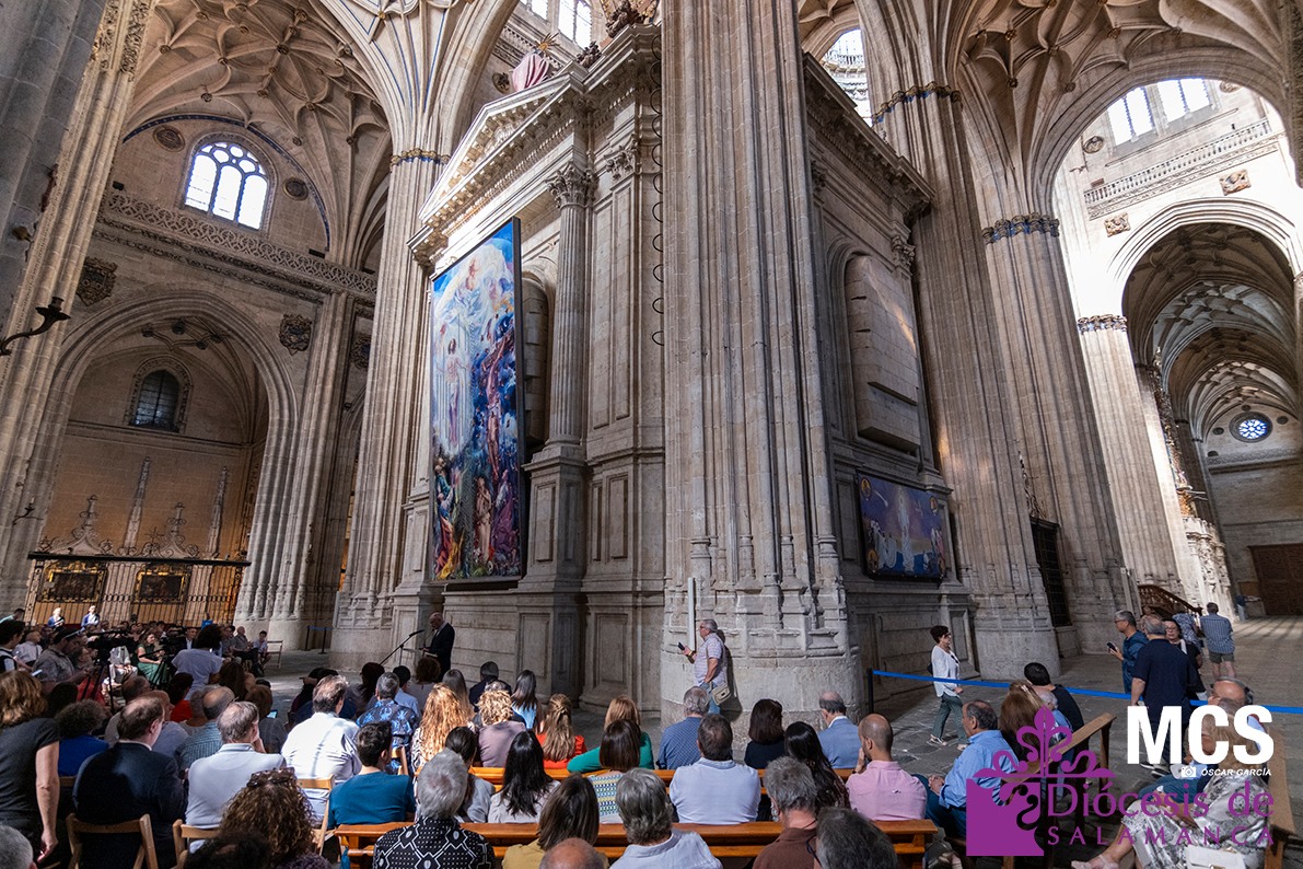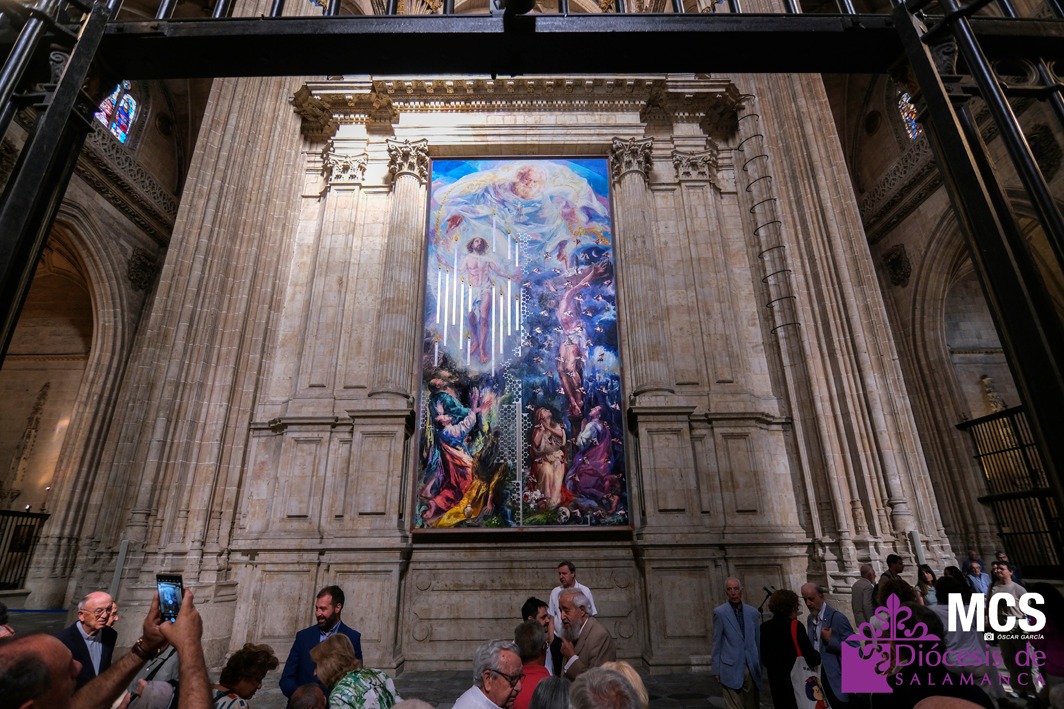 El sueño del canónigo emérito Daniel Sánchez se ha materializado en el muro que estaba desnudo tras el altar de la Catedral Nueva de Salamanca, con la inauguración de la obra: “El pensamiento ante el misterio de la Creación, Redención y Resurrección”, del pintor Florencio Maíllo. Esta pintura, encargada por el fallecido canónigo, se alza imponente con sus 8×4 metros, llenando ese espacio y creando un rincón especial en el que se establece un diálogo artístico y espiritual con la talla románica del “Cristo de las Batallas” y la contemporánea, “Cristo vuelve a la vida” de Venancio Blanco, ubicadas frente a él.