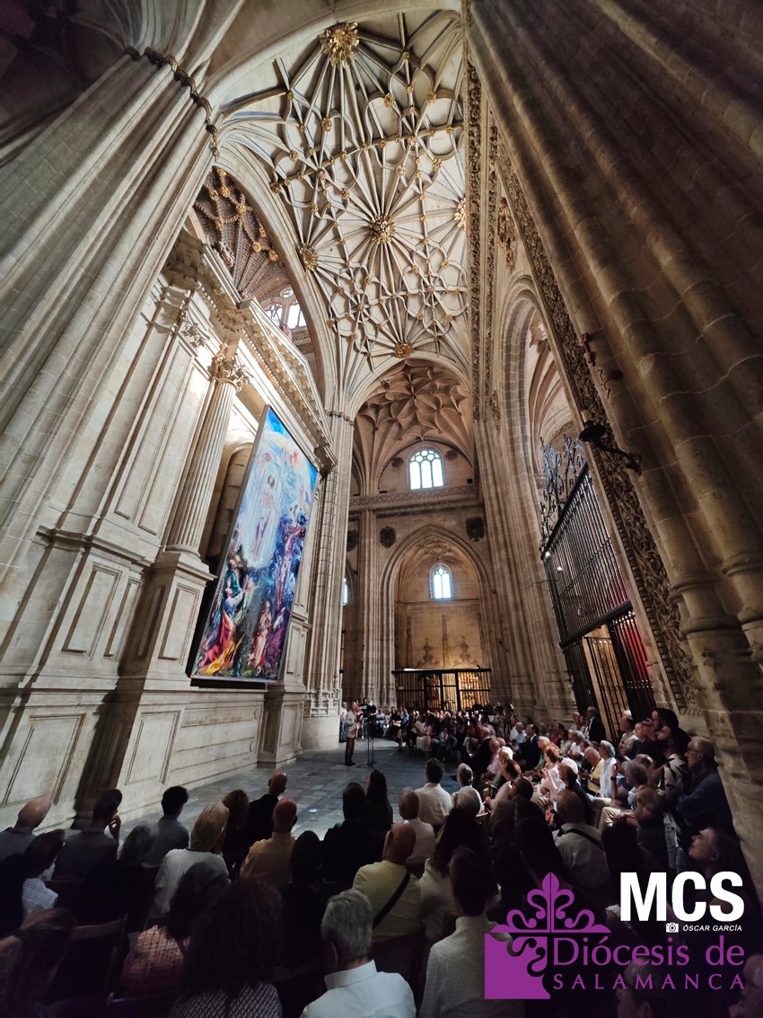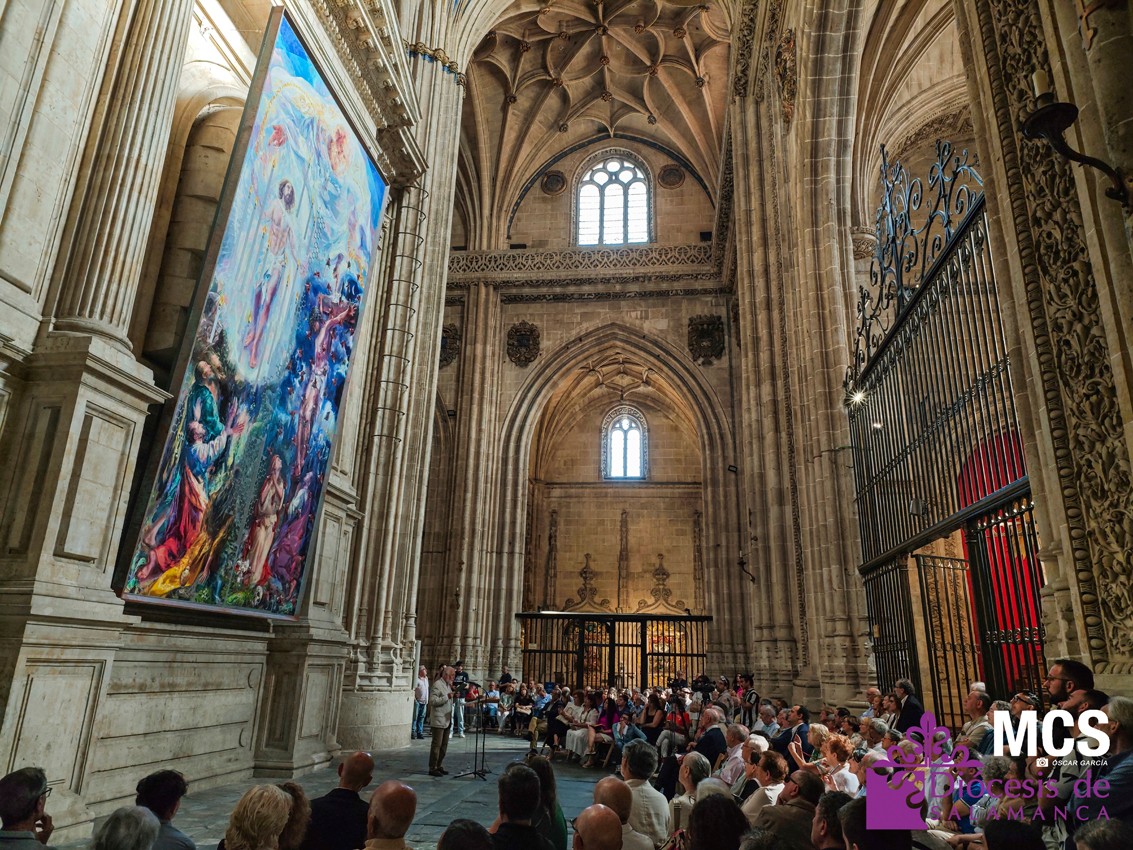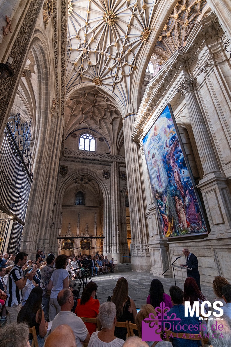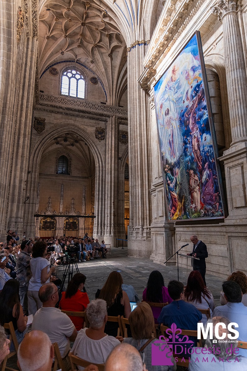 El sueño del canónigo emérito Daniel Sánchez se ha materializado en el muro que estaba desnudo tras el altar de la Catedral Nueva de Salamanca, con la inauguración de la obra: “El pensamiento ante el misterio de la Creación, Redención y Resurrección”, del pintor Florencio Maíllo. Esta pintura, encargada por el fallecido canónigo, se alza imponente con sus 8×4 metros, llenando ese espacio y creando un rincón especial en el que se establece un diálogo artístico y espiritual con la talla románica del “Cristo de las Batallas” y la contemporánea, “Cristo vuelve a la vida” de Venancio Blanco, ubicadas frente a él.