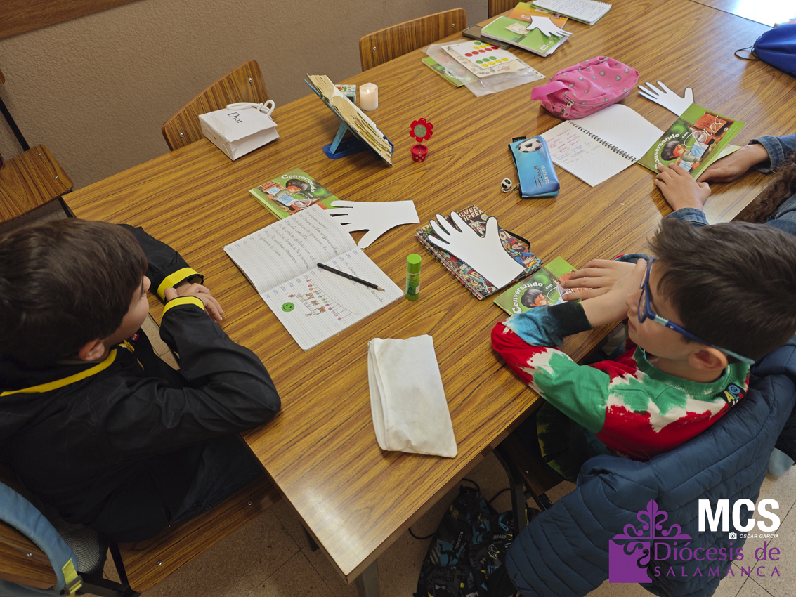 El taller que imparte Mari Cruz se divide en diez sesiones, “de una hora y cuarto de duración cada una de ellas”, para niños de entre siete y doce años. “Nuestro objetivo es que los niños conozcan y vivan el amor de Dios, y a la vez, acercarlos a la sagrada Biblia“, argumenta. Como también detalla, los temas de cada semana siempre están basados en un hecho bíblico, o de los evangelios o del antiguo testamento: “Empezamos por la creación, el amor de Dios a todos nosotros con este hecho, y también hemos tratado el perdón, a través de la parábola del hijo pródigo, entre otros”, precisa. Cada día entronizan la biblia, con una luz, “para que nos ilumine la palabra”, y una flor, “para recordarnos la creación”.