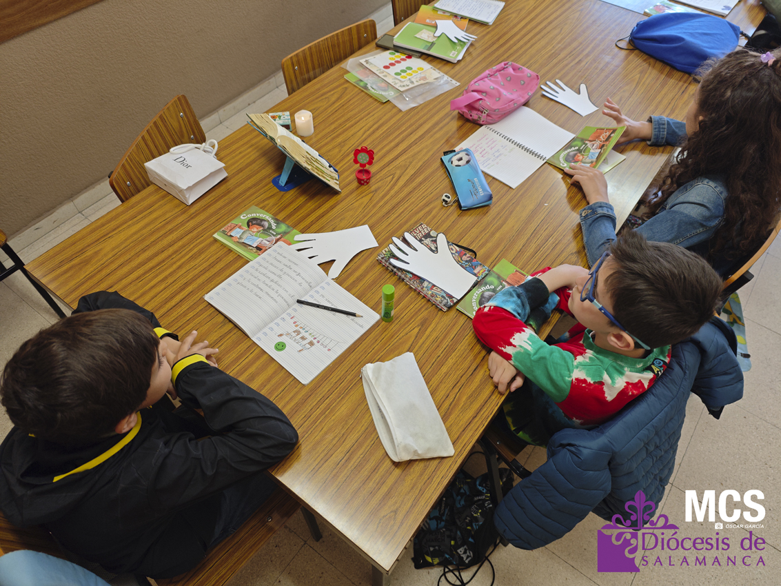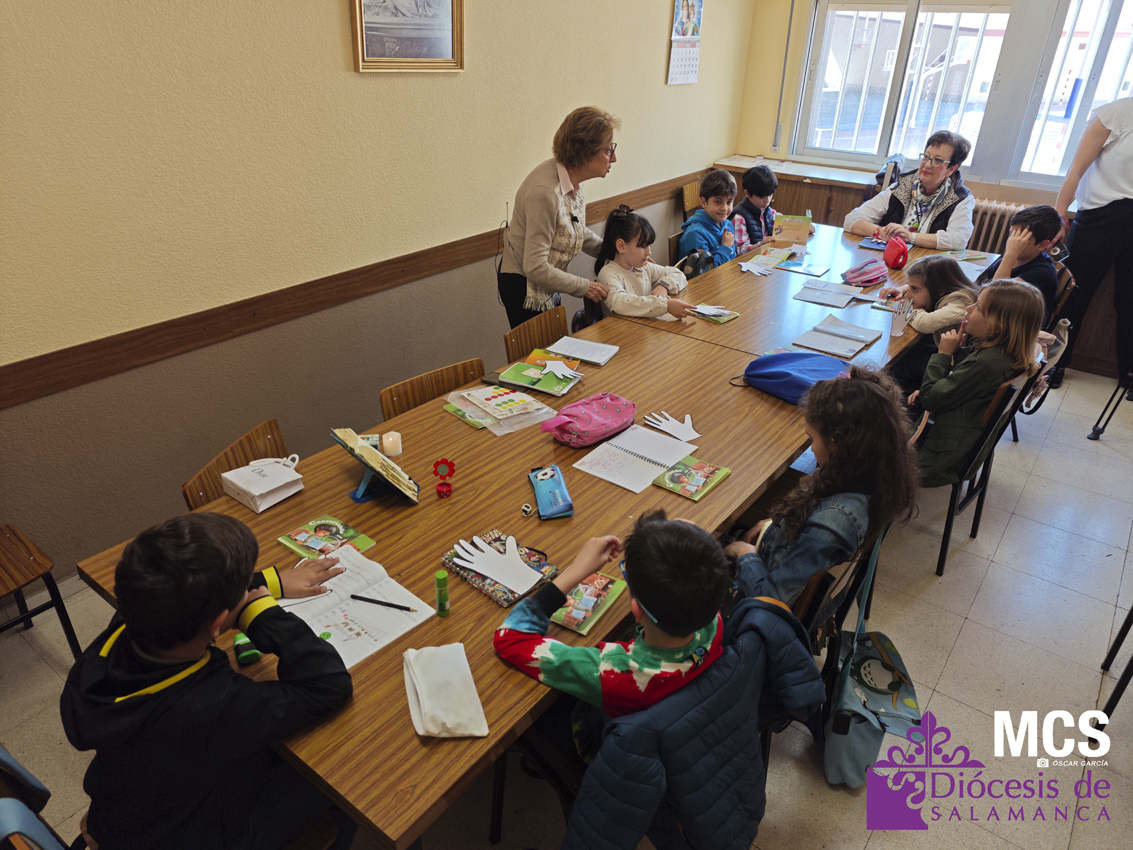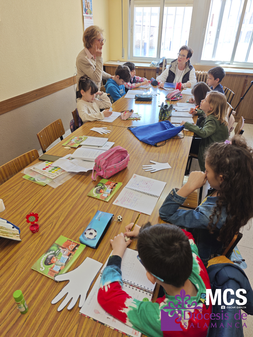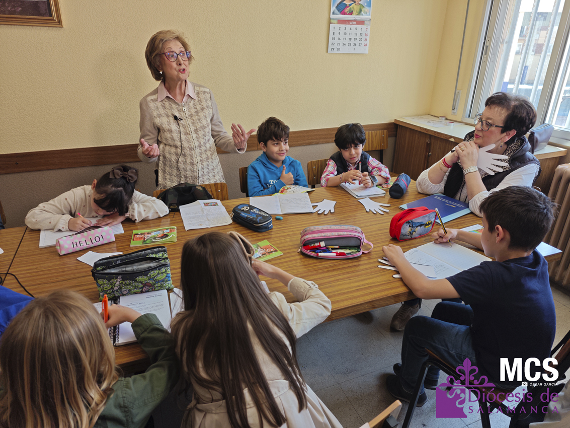 Lo primero que hacen en cada sesión es repasar lo vivido en el último taller. En esta ocasión, les lanza algunas preguntas: “¿Dónde nació Jesús?”, y aunque dudan, y alguno dice Jerusalén, finalmente, recuerdan que fue en Belén. “¿Y quién era su papá?”. Y cuando tuvo 30 años, “¿dónde se fue?”, “¿Hacía milagros?”. Y tras la batería de preguntas, Mari Cruz les invitó a cantar con ella el “Aleluya”, para celebrar ese tiempo de Pascua.