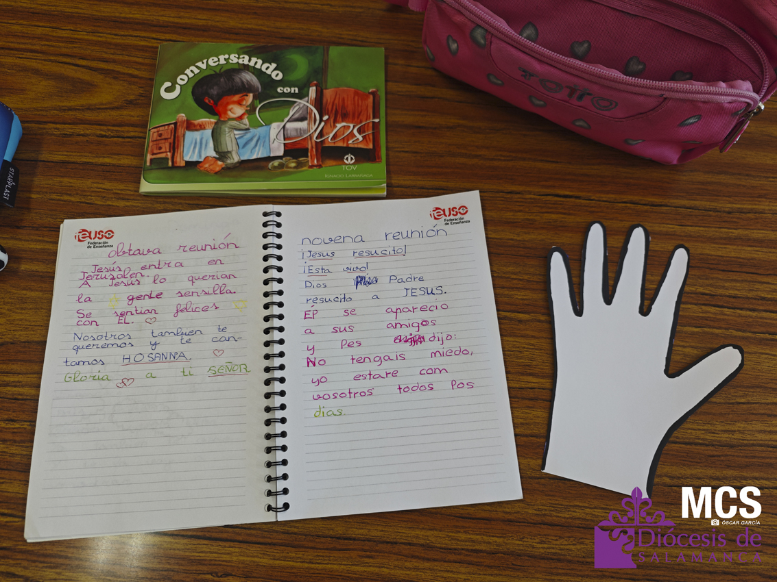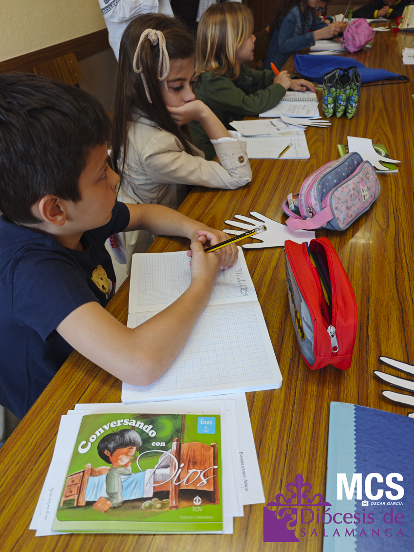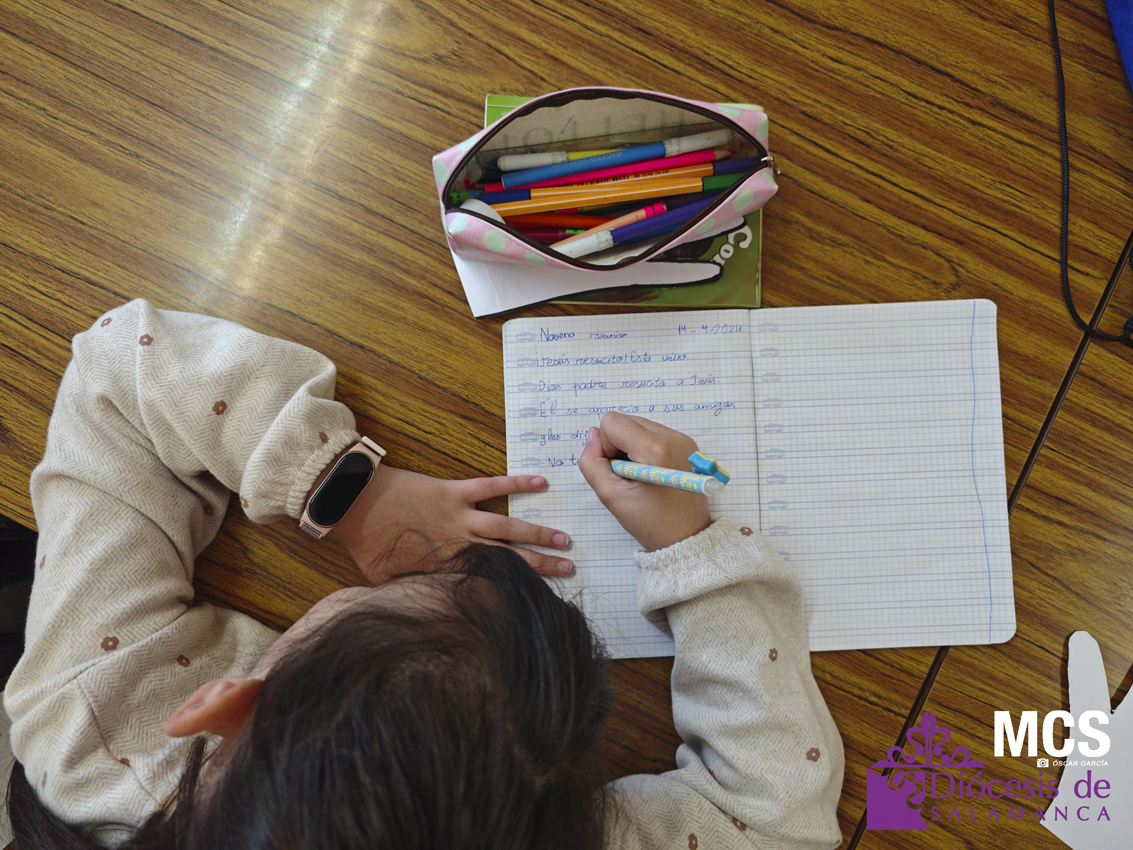 Eduardo, Alba, Enzo y Carla son cuatro de los niños que asisten a este taller de oración, y todos coinciden en que se divierten, comparten ese tiempo con sus amigos, y luego, en casa, intentan tener momentos para tener presente a Jesús. Sus cartas y dibujos, que muestran en sus cuadernos, reflejan el trabajo que desarrolla Mari Cruz desde Talleres de Oración y Vida, una forma de sembrar.