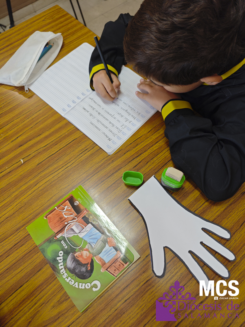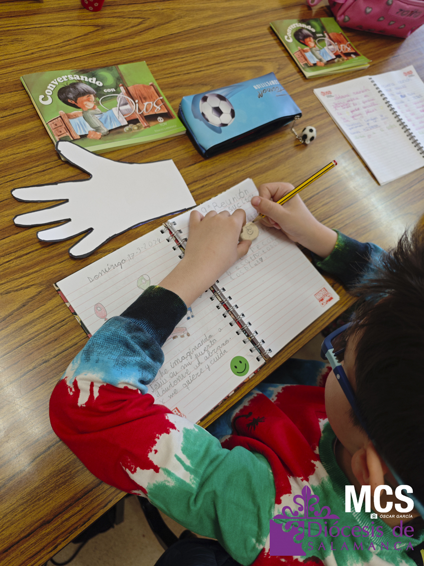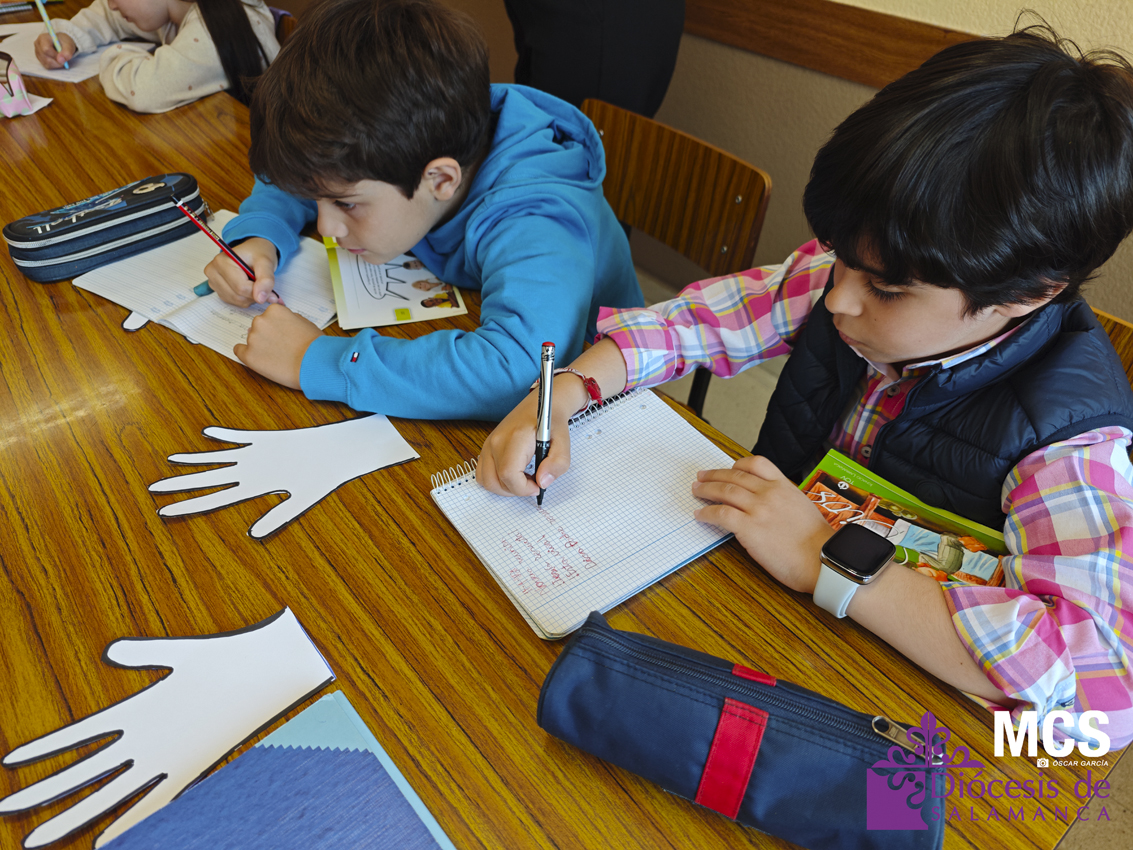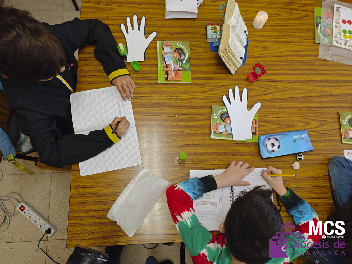 Eduardo, Alba, Enzo y Carla son cuatro de los niños que asisten a este taller de oración, y todos coinciden en que se divierten, comparten ese tiempo con sus amigos, y luego, en casa, intentan tener momentos para tener presente a Jesús. Sus cartas y dibujos, que muestran en sus cuadernos, reflejan el trabajo que desarrolla Mari Cruz desde Talleres de Oración y Vida, una forma de sembrar.